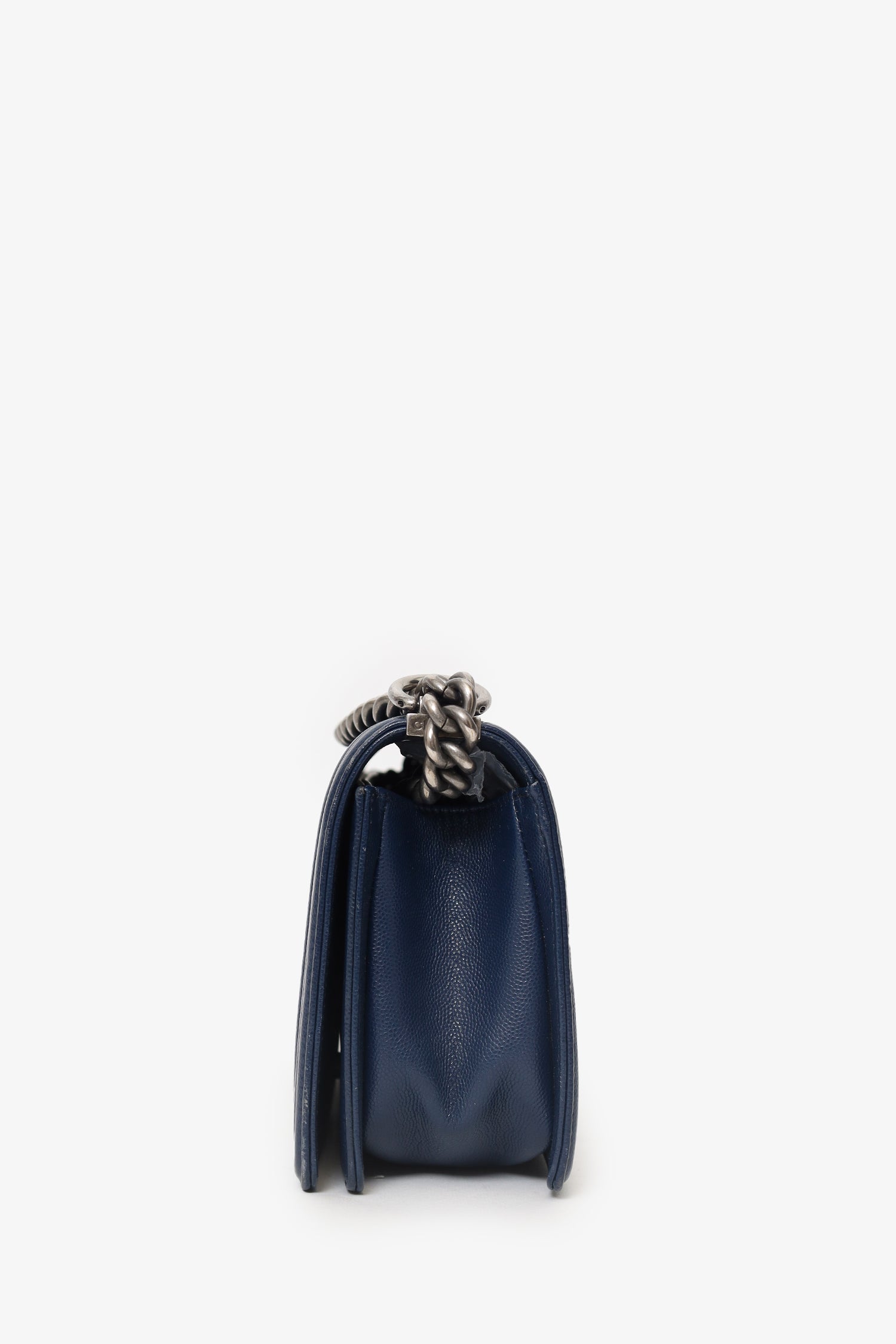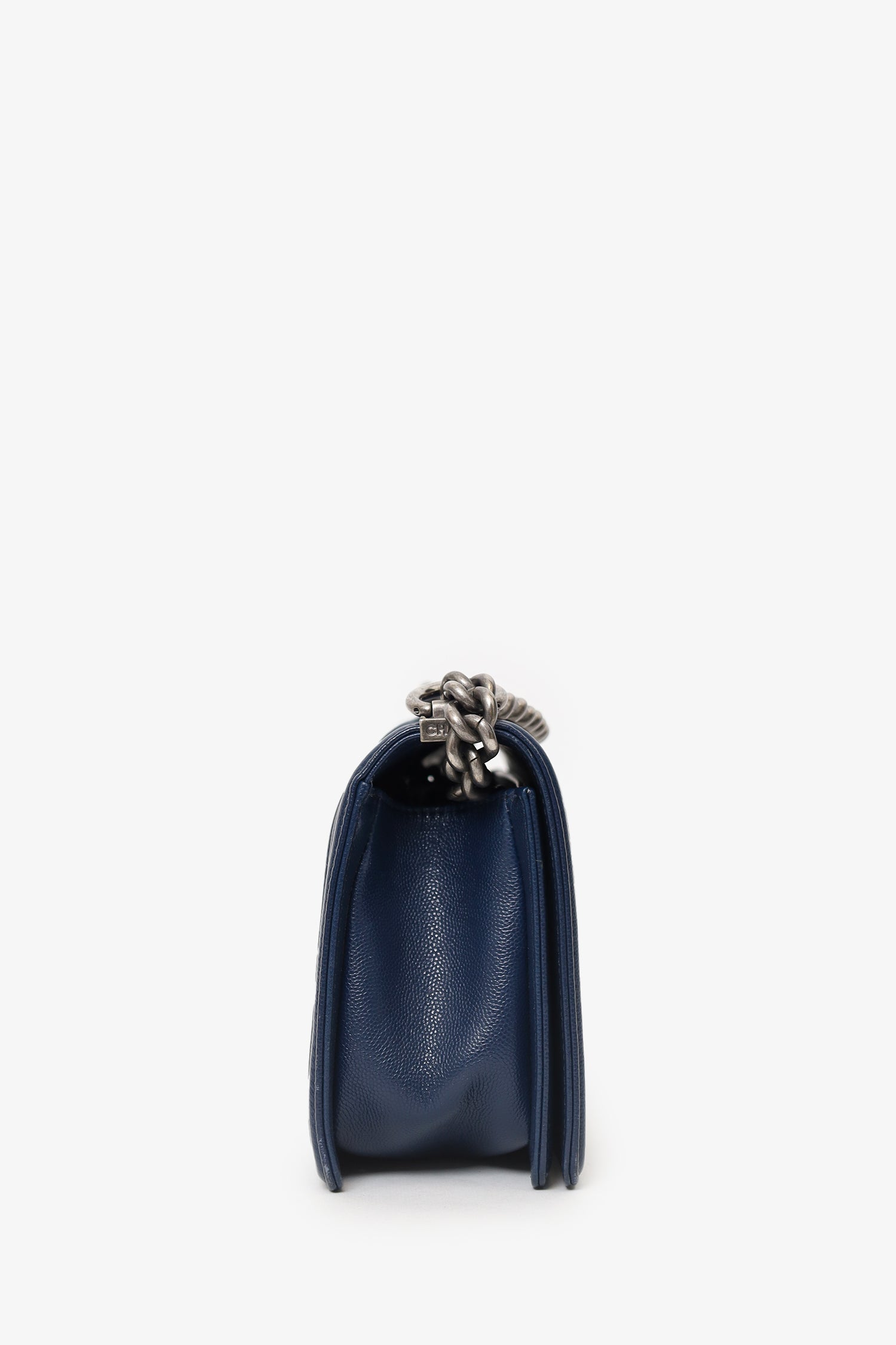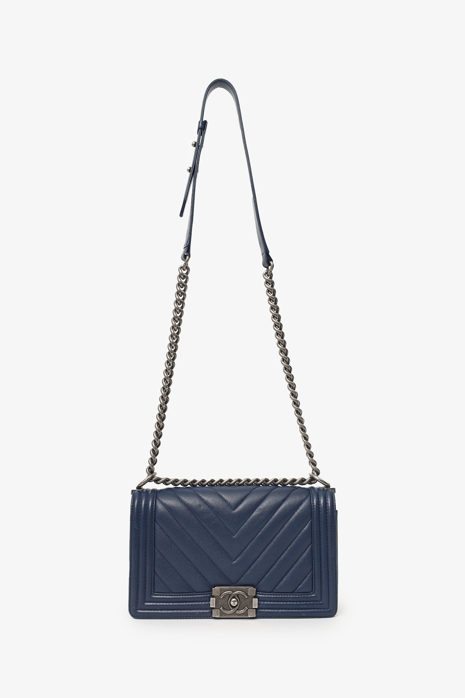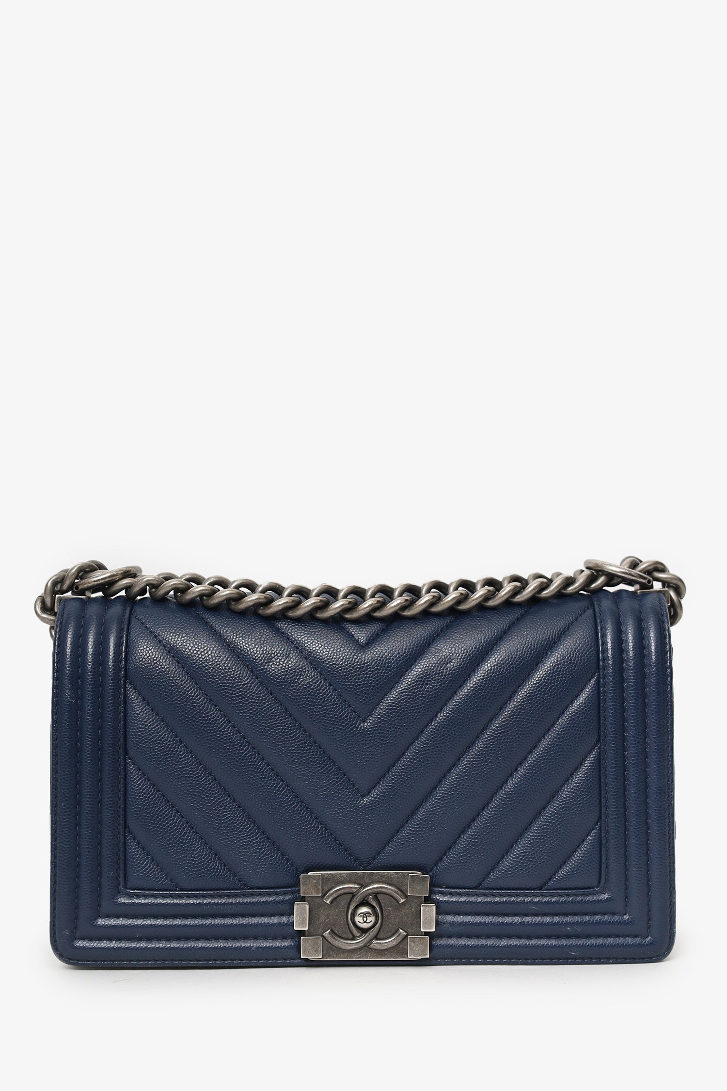 Refresh availabilityPre-Loved Chanel™ 2017-18 Navy Caviar Chevron Medium Boy Bag. Front fold-over flap with push-lock closure. Chainlink and leather shoulder strap. Lined interior with single slip pocket. Gunmetal-tone hardware. Tonal stitching.