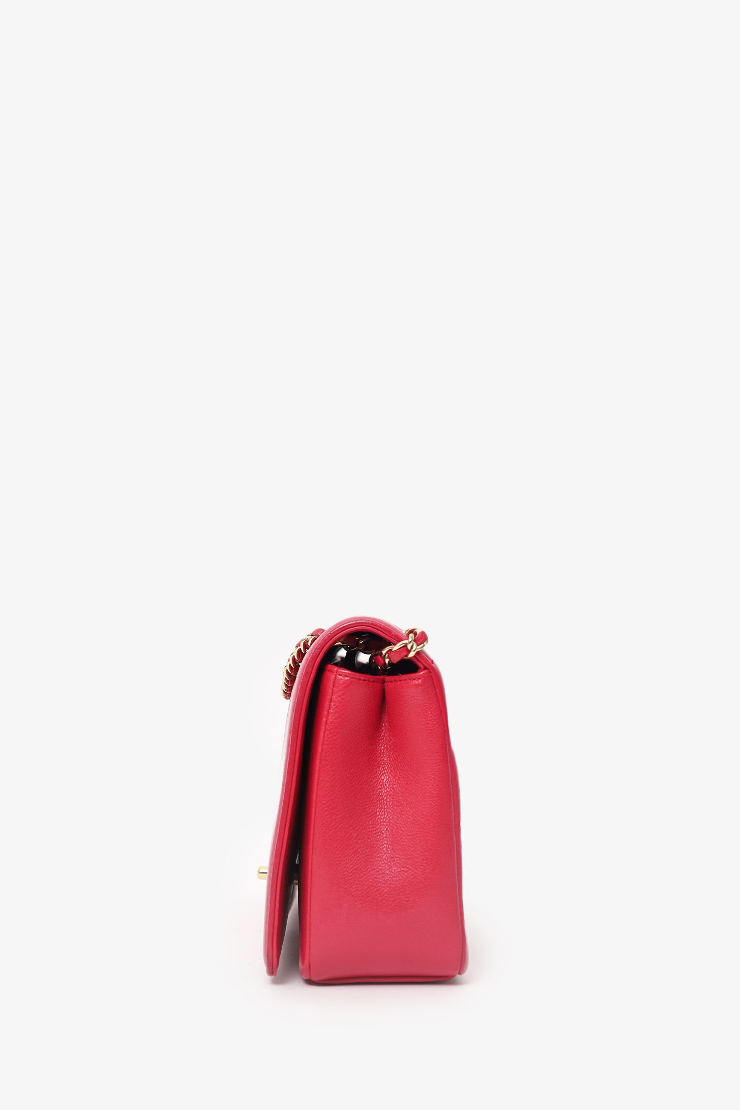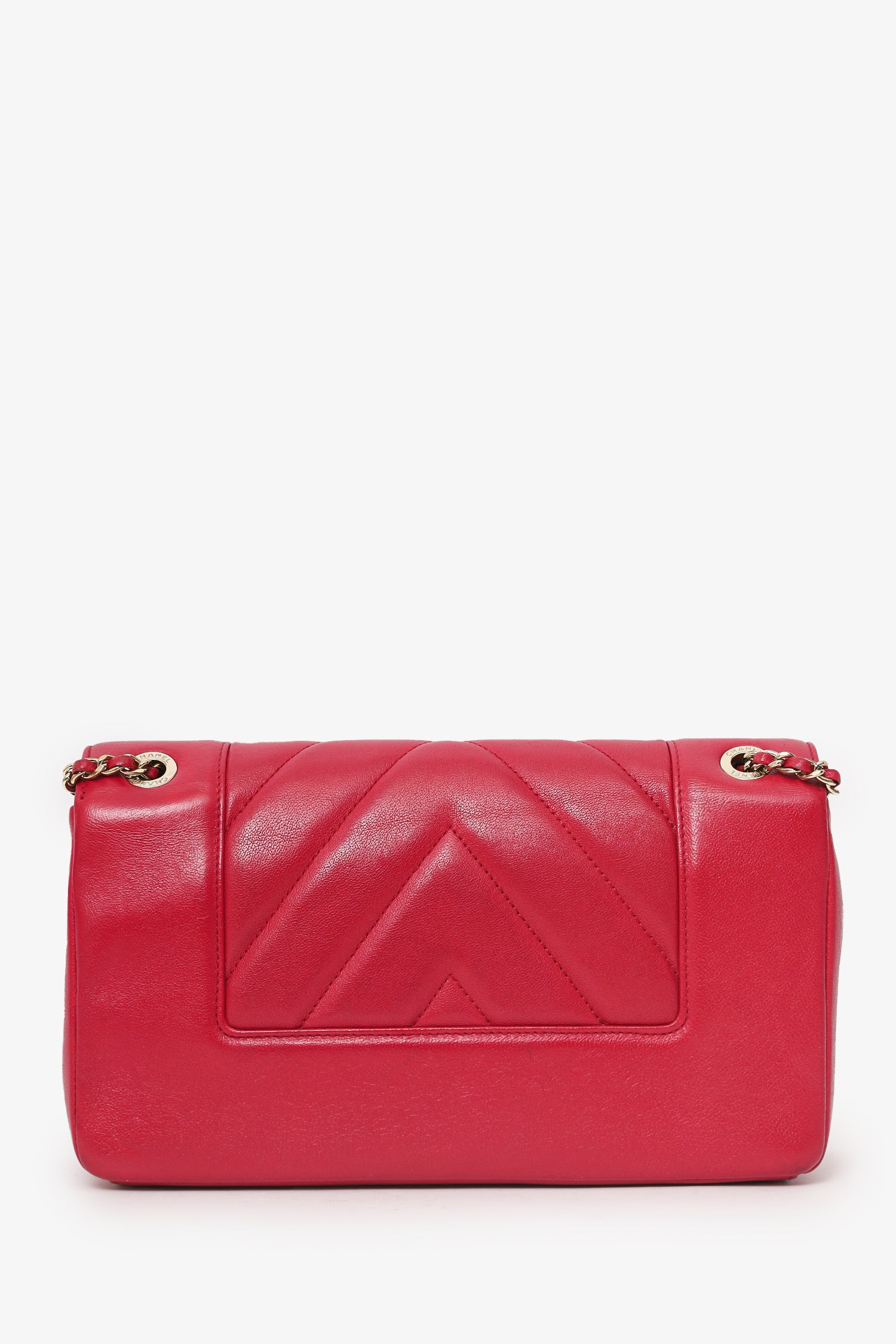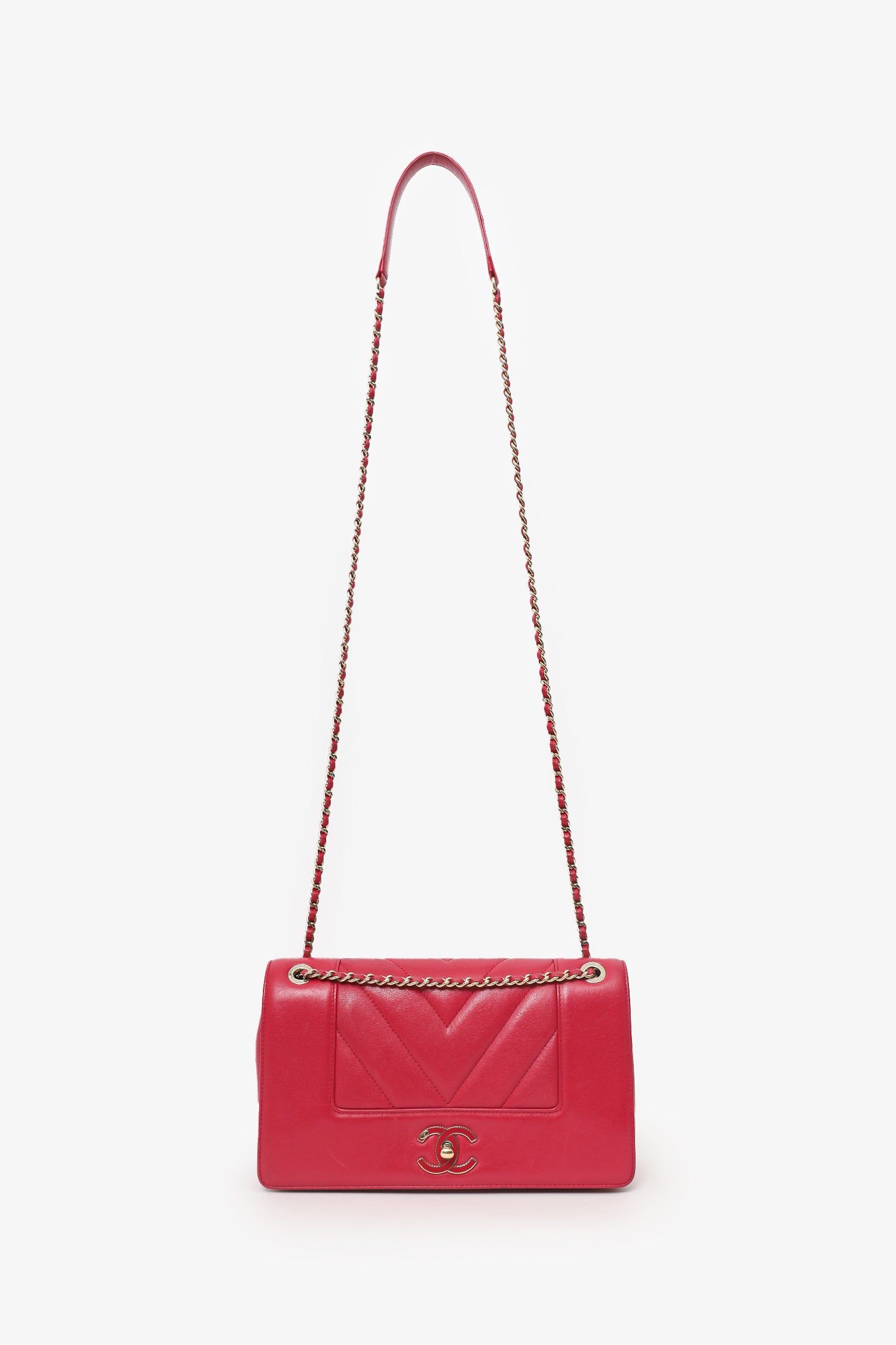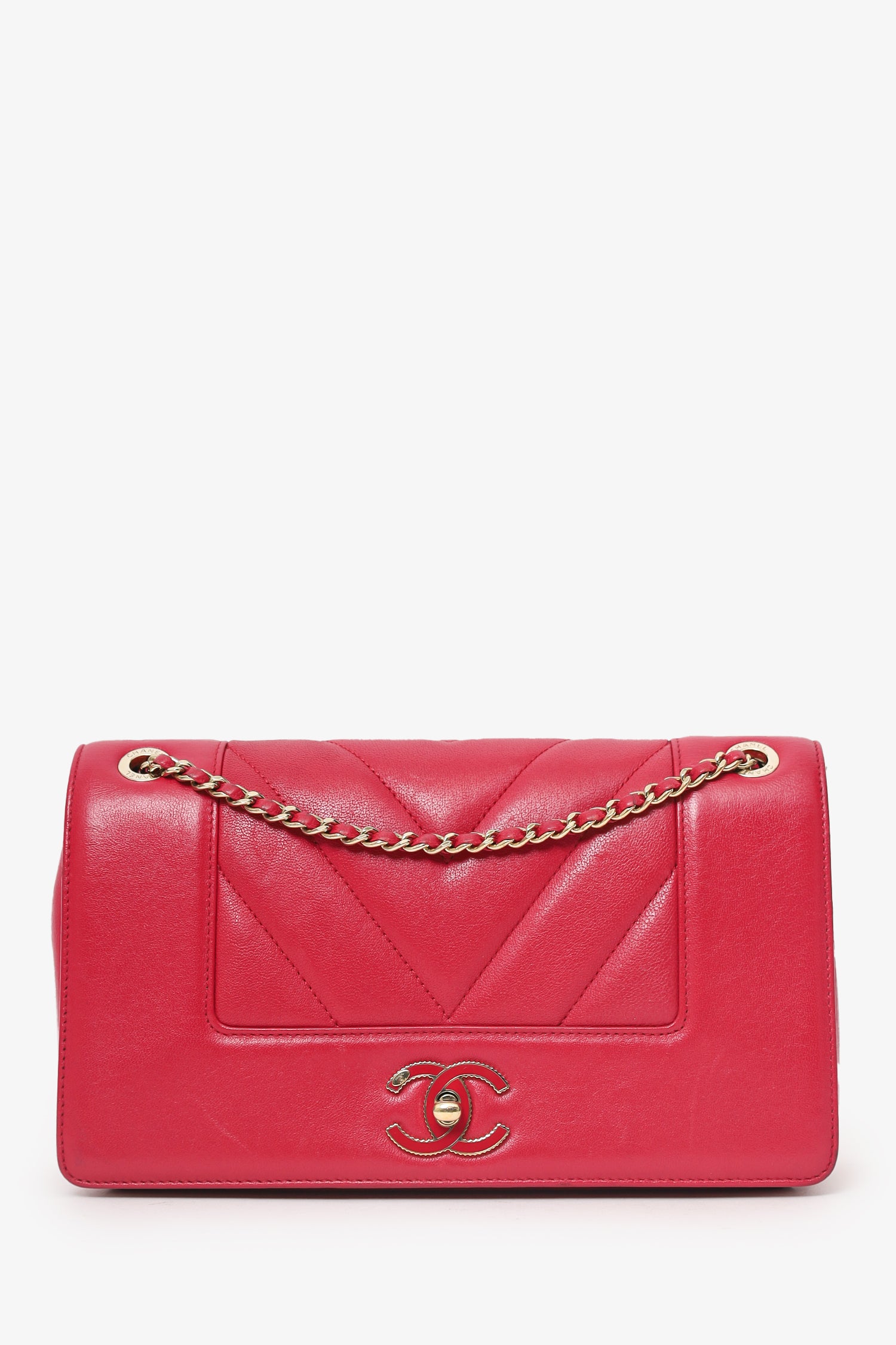 Refresh availabilityPre-Loved Chanel™ 2017/18 Pink Leather Quilted Chevron Mademoiselle Bag. Front fold-over flap with turn-lock closure. Twin chainlink strap that can be pulled into one longer strap. Lined interior with front fold-over flap and snap closure. Single interior zip pocket. Gold-tone hardware. Tonal stitching.