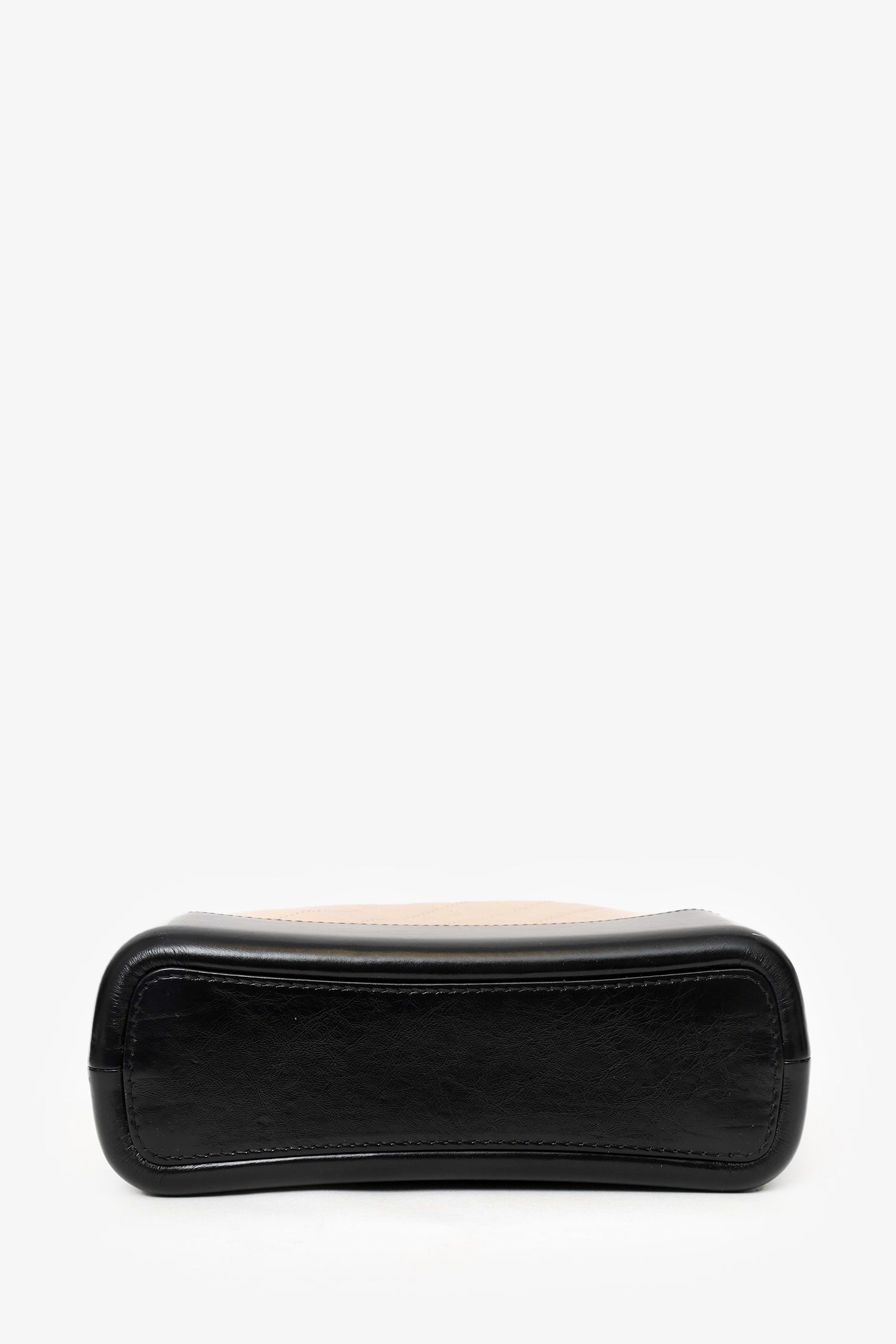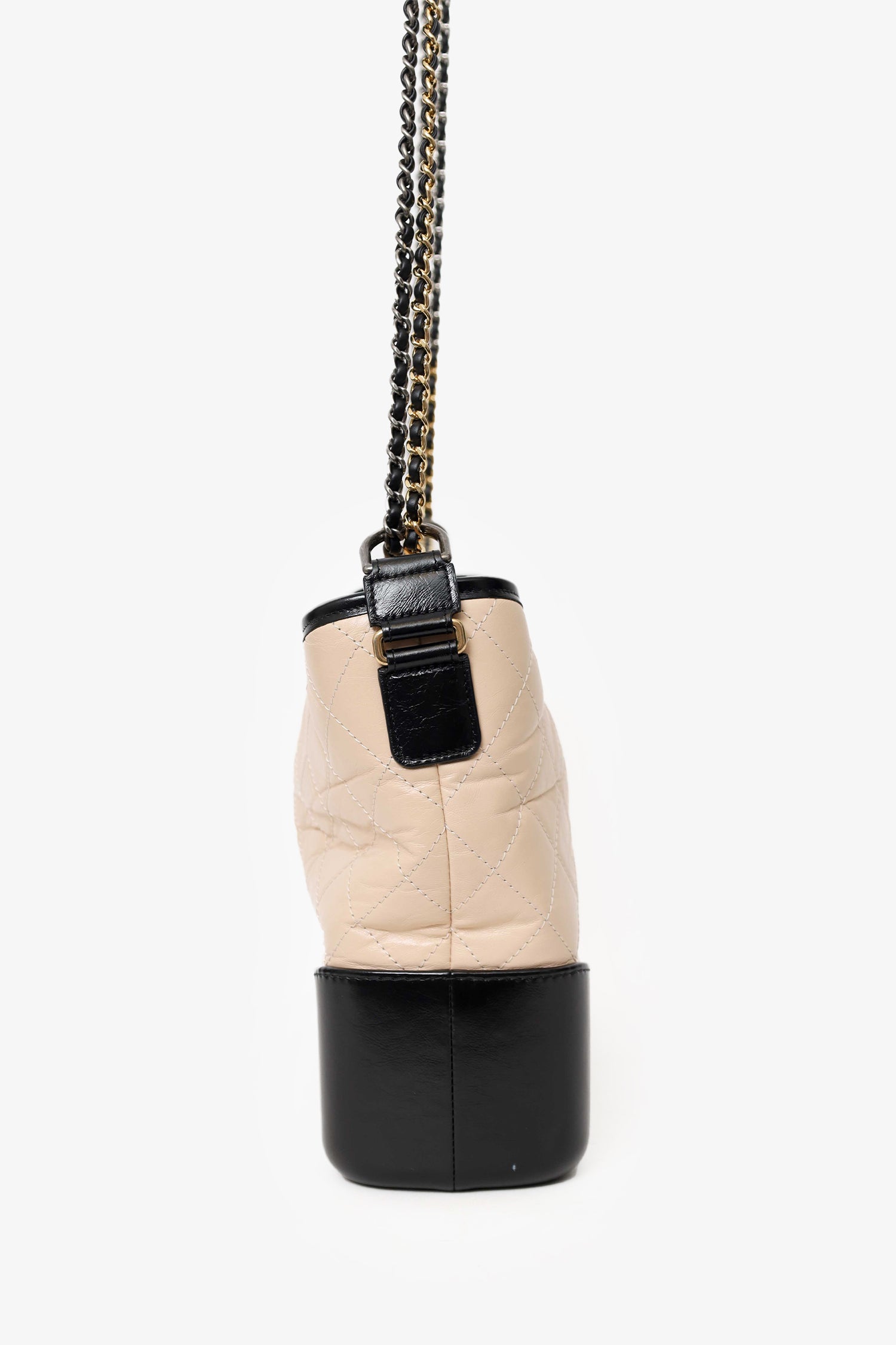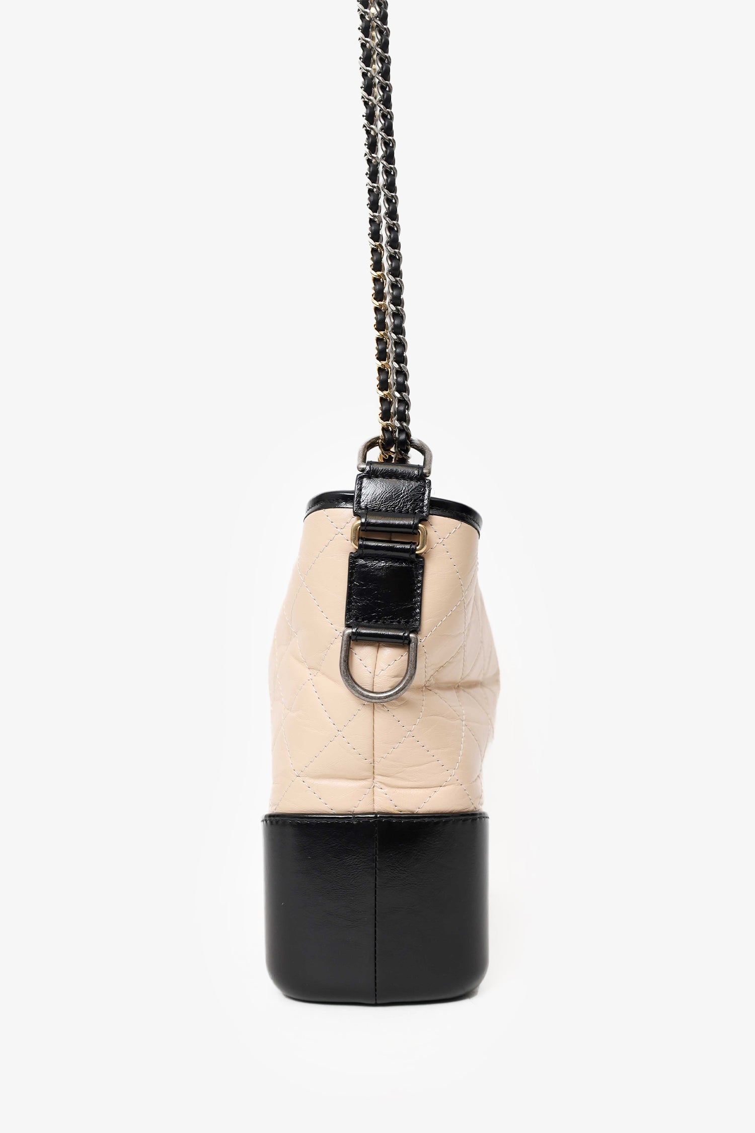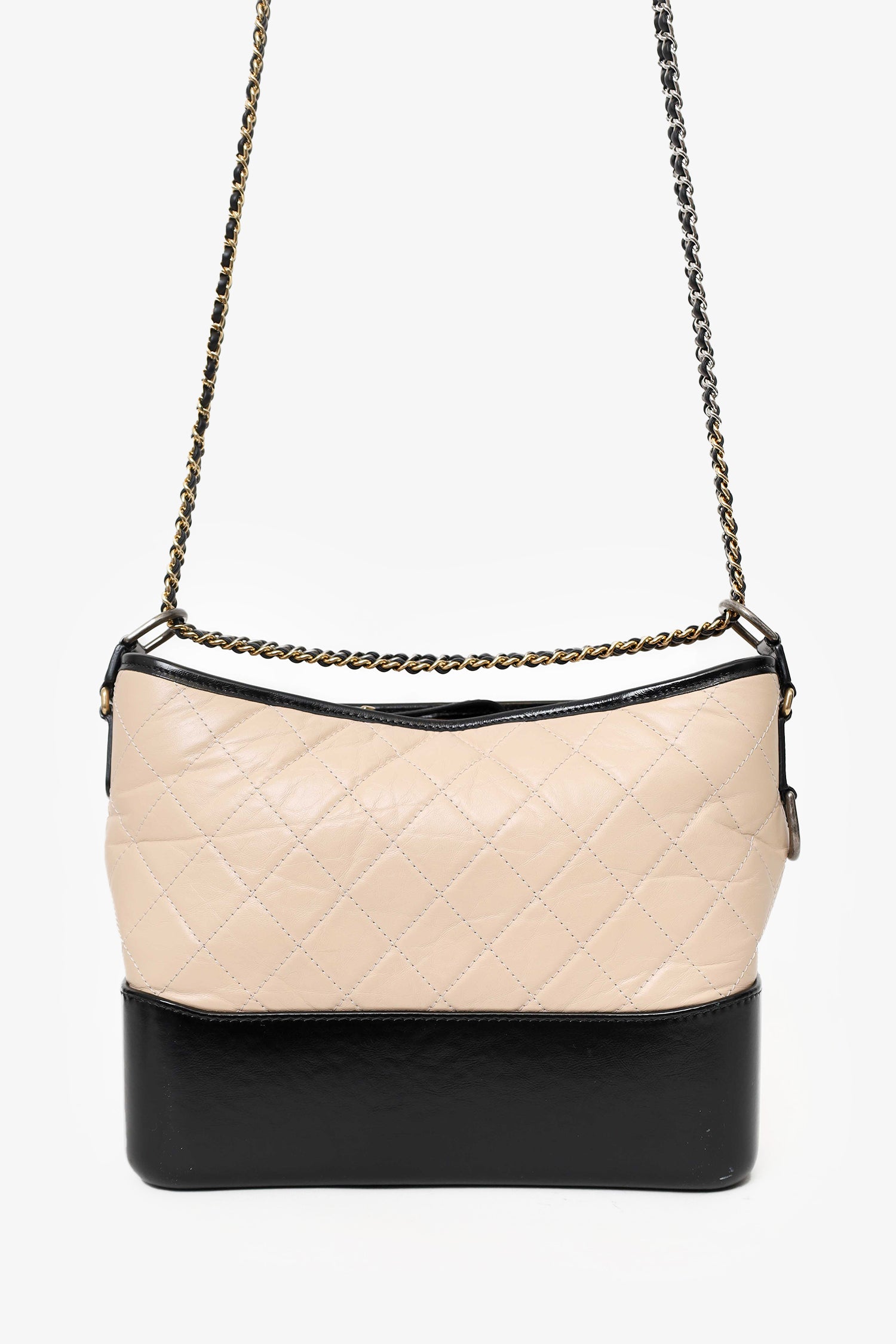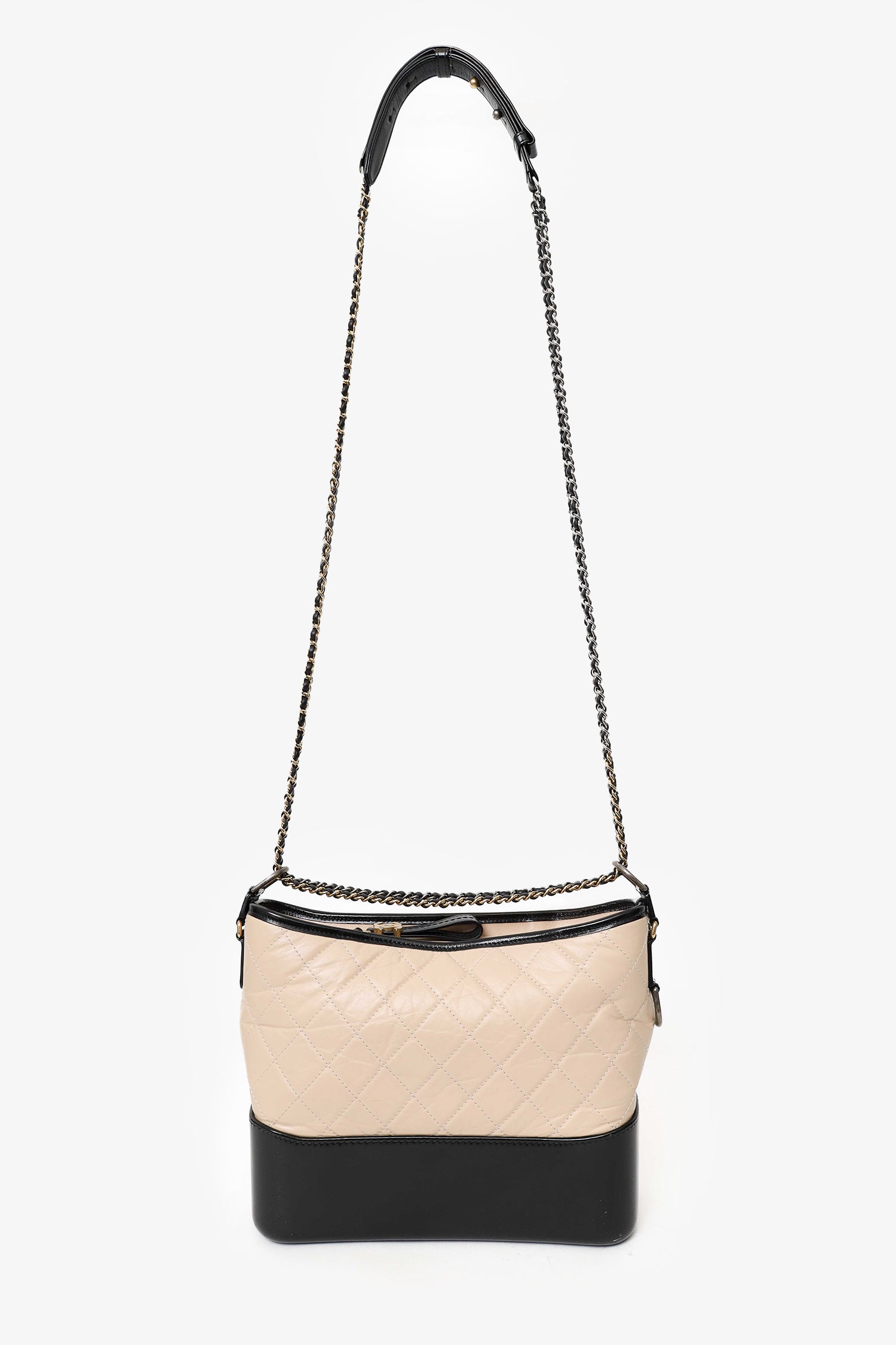 Refresh availabilityPre-Loved Chanel™ 2018-19 Beige/Black Leather Medium Gabrielle Chain Bag. Top zip closure. Twin chainlink strap that can be pulled into one longer strap. Lined interior. 3 interior pockets; 2 slip and 1 zip. Gold and silver-tone hardware. Tonal stitching.