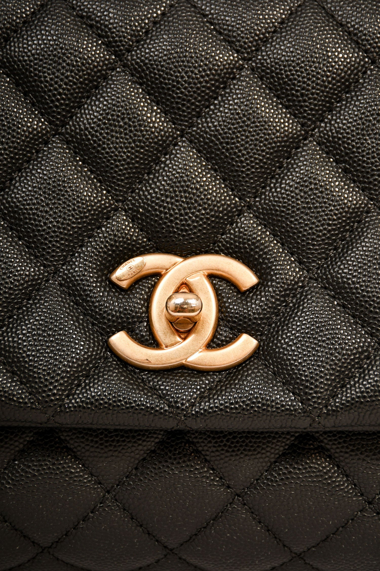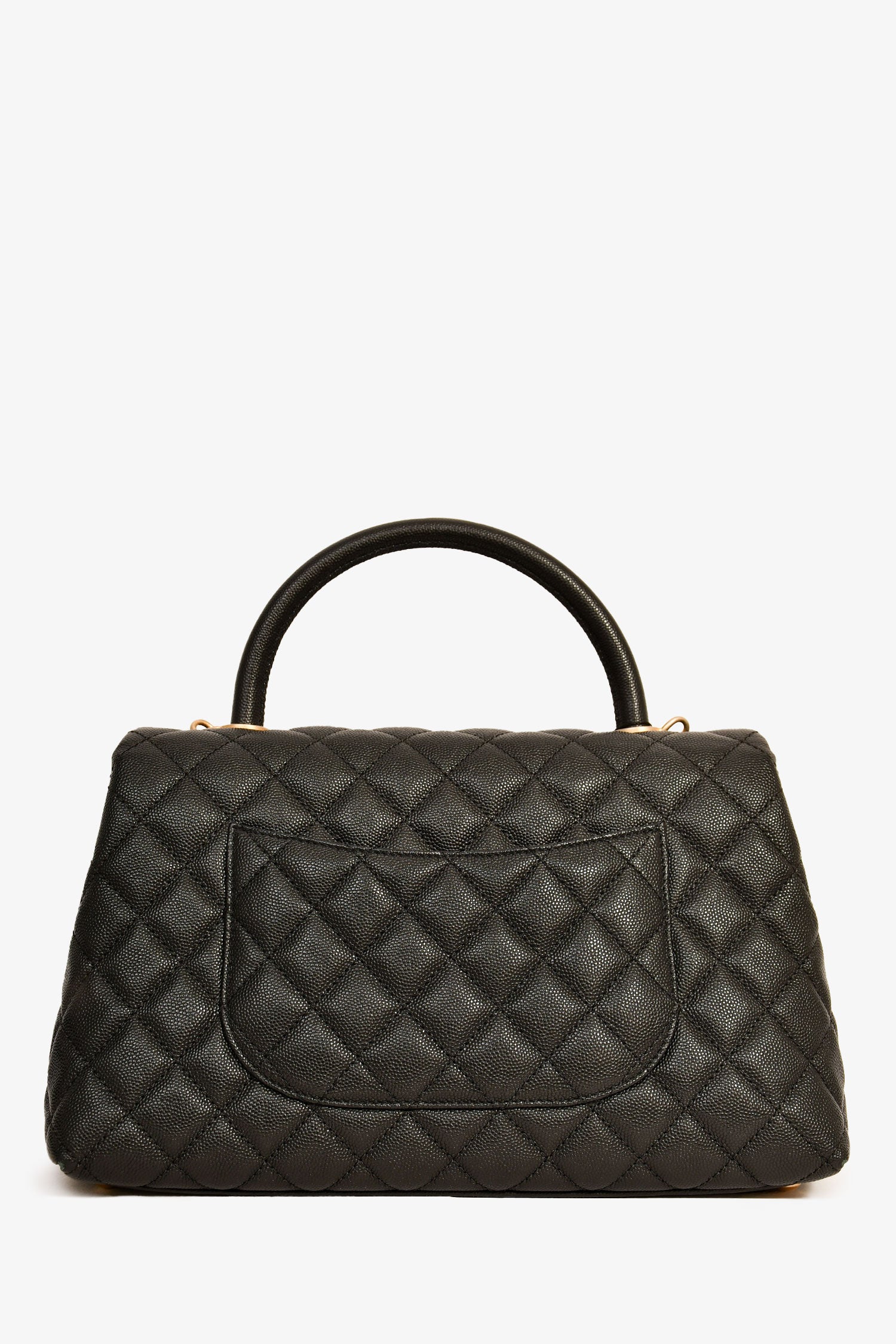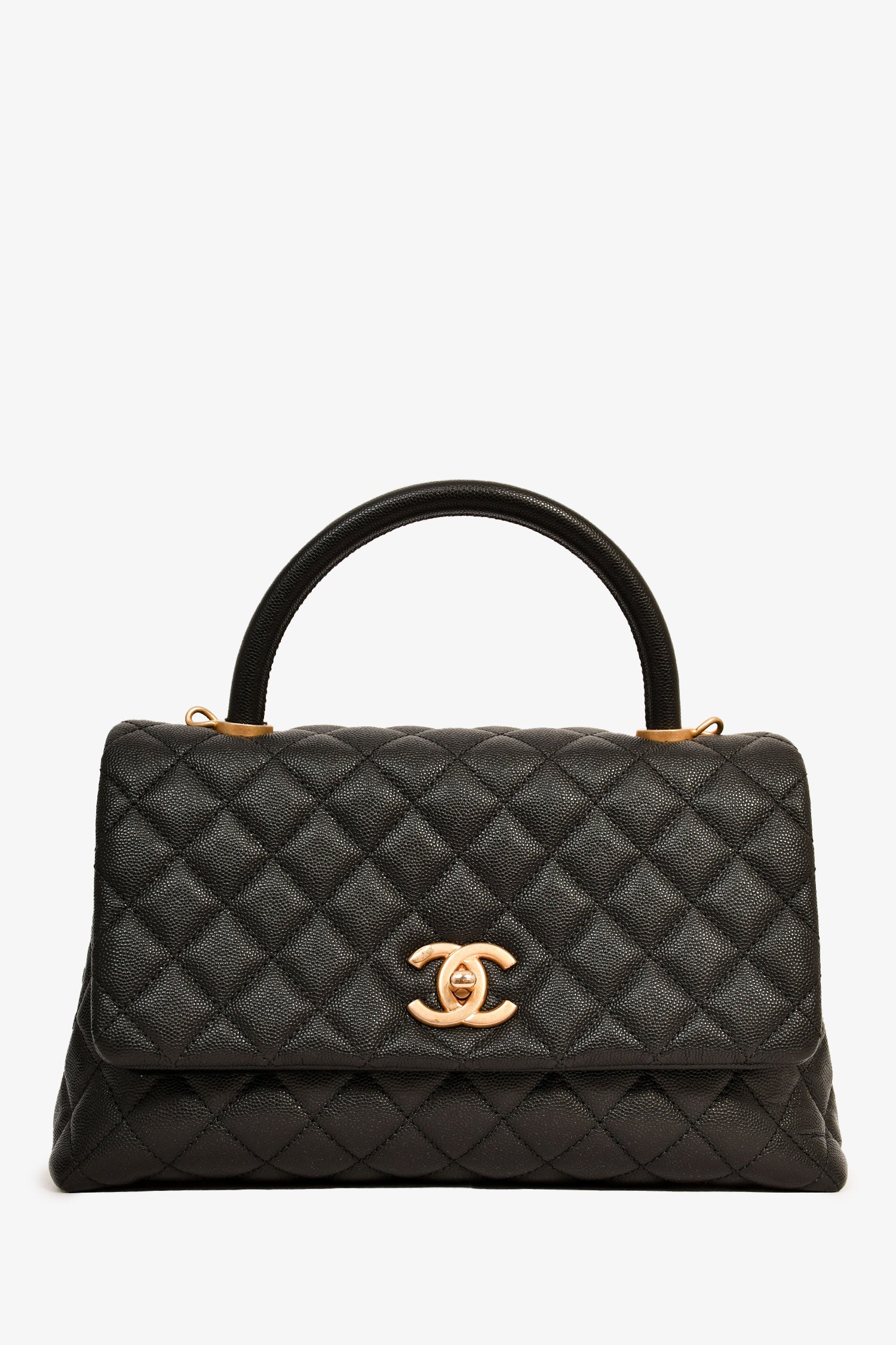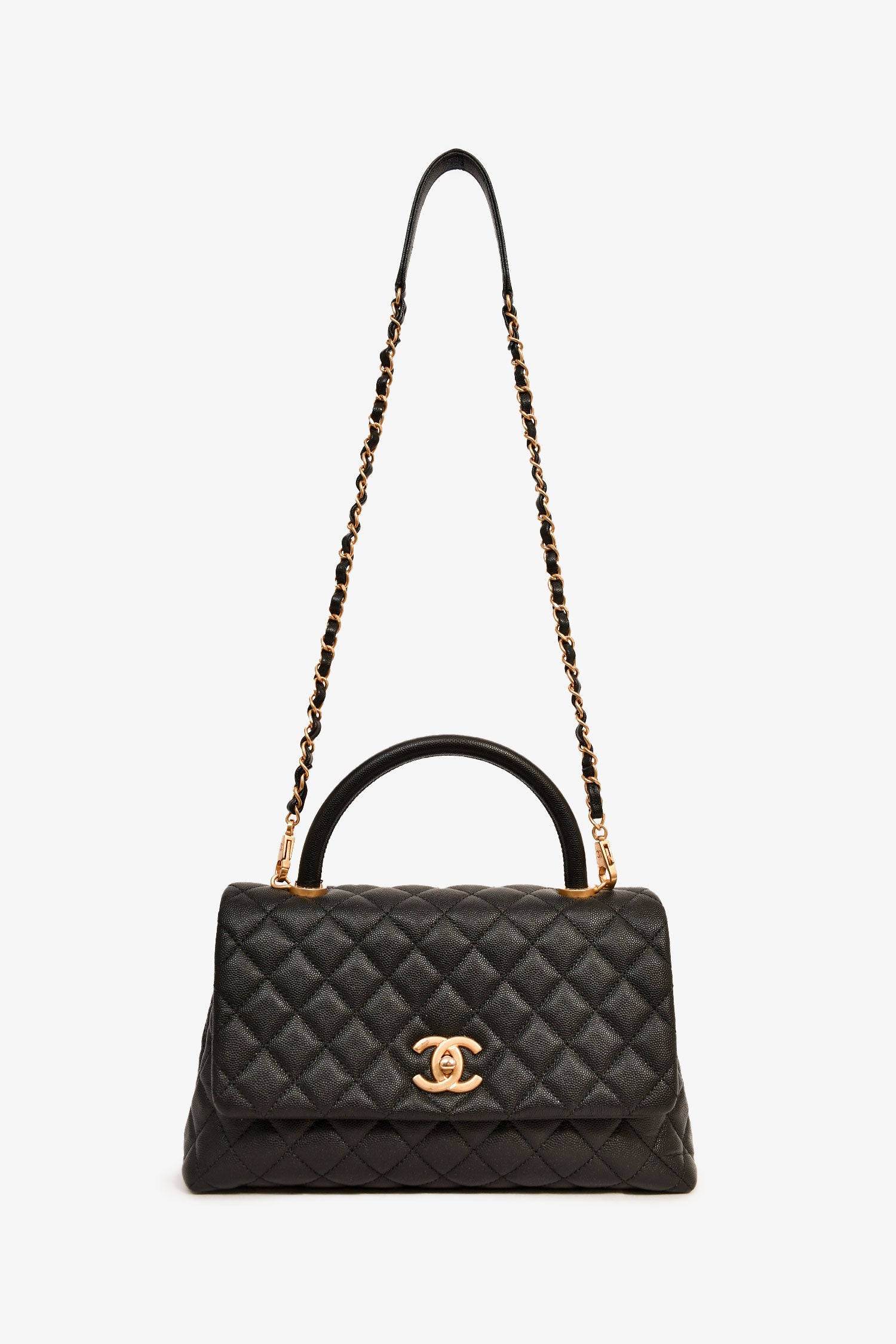 Pre-Loved Chanel™ 2018-19 Black Caviar Leather Medium Coco Handle Bag. Rolled top handle. Fold-over flap with a turn-lock closure. Chain-link and leather shoulder strap. Lined interior with 2 zipped compartments. Tonal stitching.