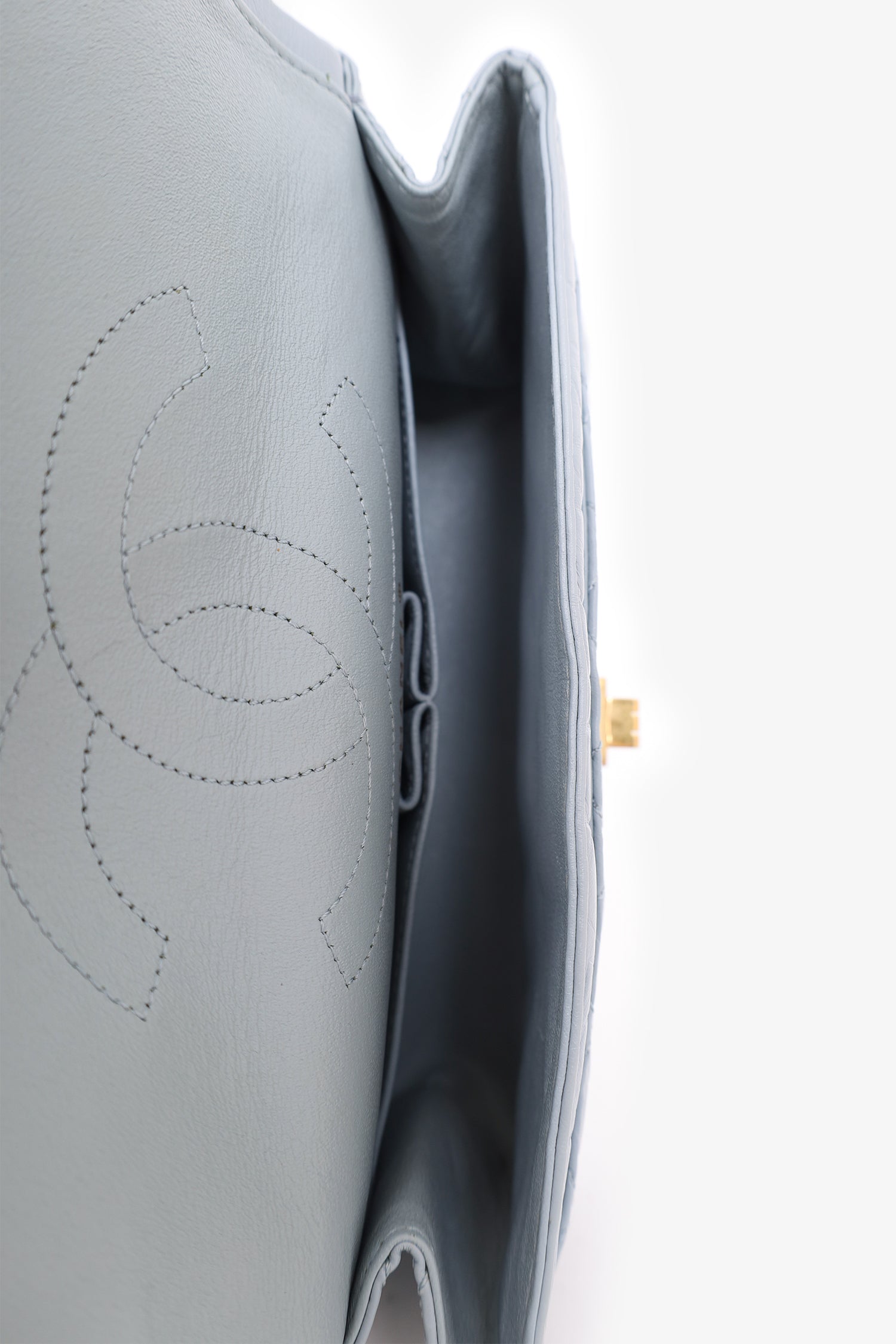 Refresh availabilityPre-Loved Chanel™ 2018-2019 Baby Blue Quilted Leather Reissue 225 Double Flap Bag. Top flap with turn lock closure. Zip pocket on interior top flap. 1 exterior slip pocket. 2 interior slip pockets. Gold-toned hardware. Tonal stitching. Comes with original dust bag.