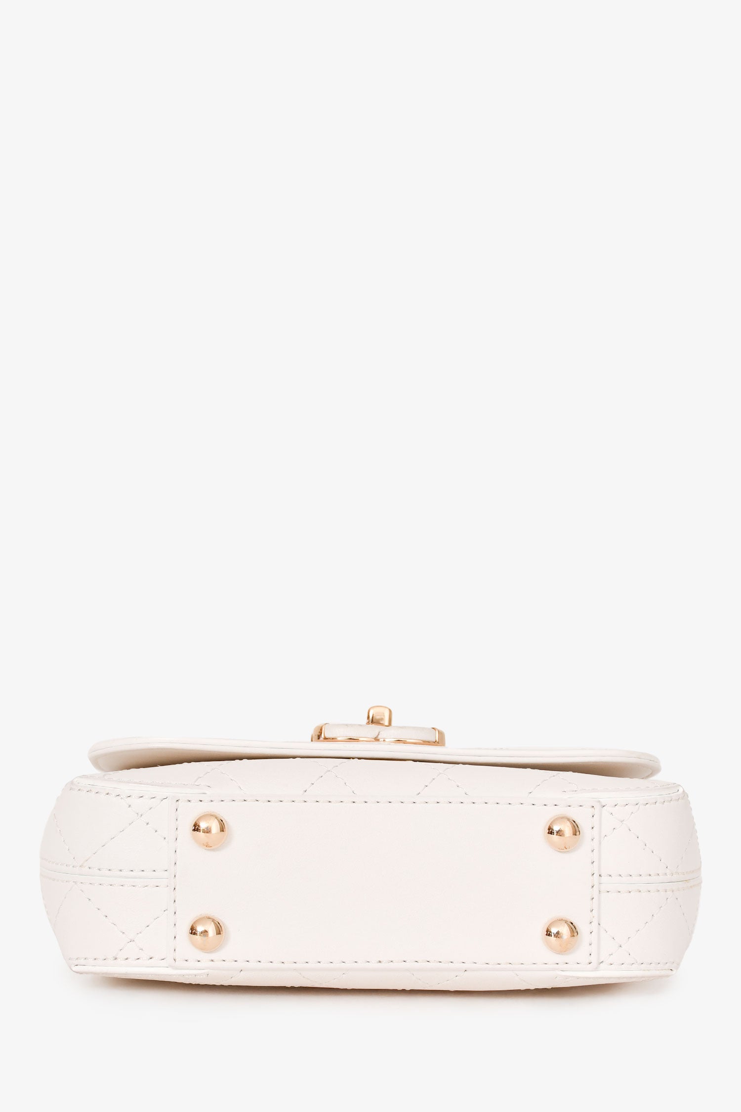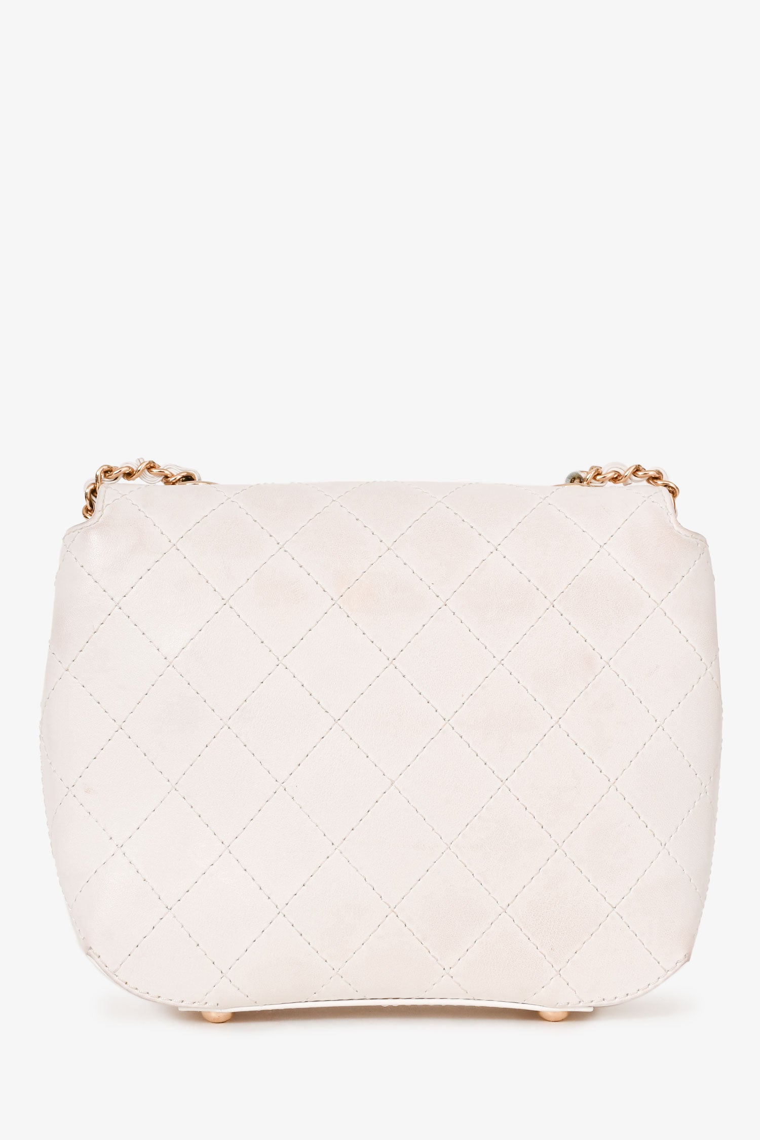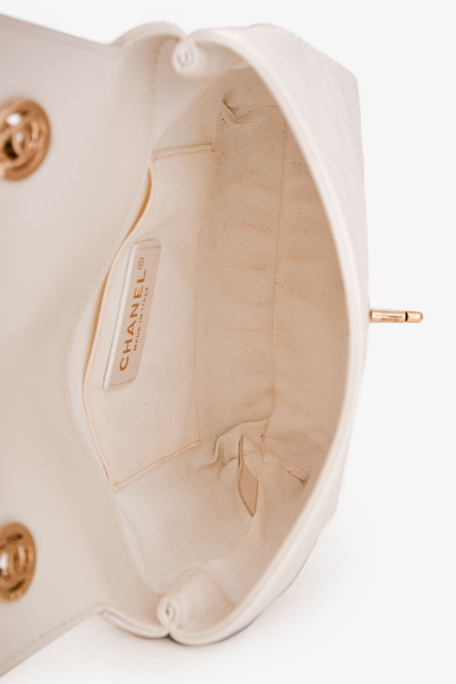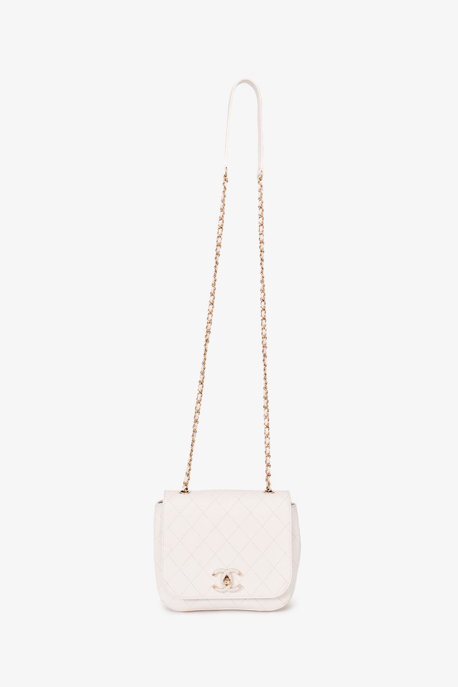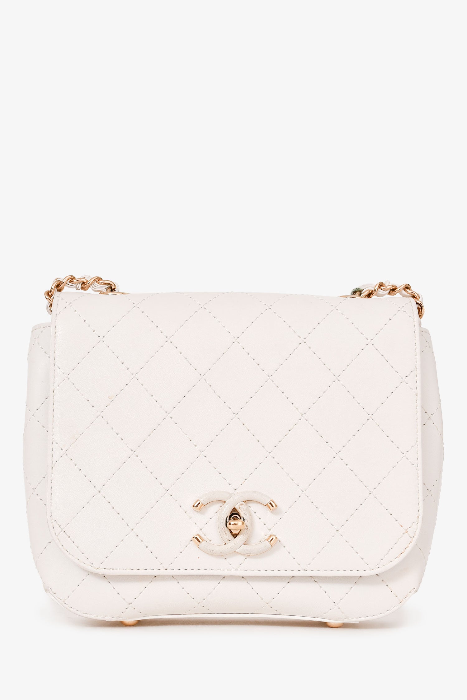 Refresh availabilityPre-Loved Chanel™ 2018/19 White Leather Small Covered CC Flap Bag. Gold-tone hardware. Fold-over flap with a turn-lock closure. Grosgrain-lined interior. Single slip compartment. Chain-link and leather shoulder strap. Bag feet at the bottom. Tonal stitching.