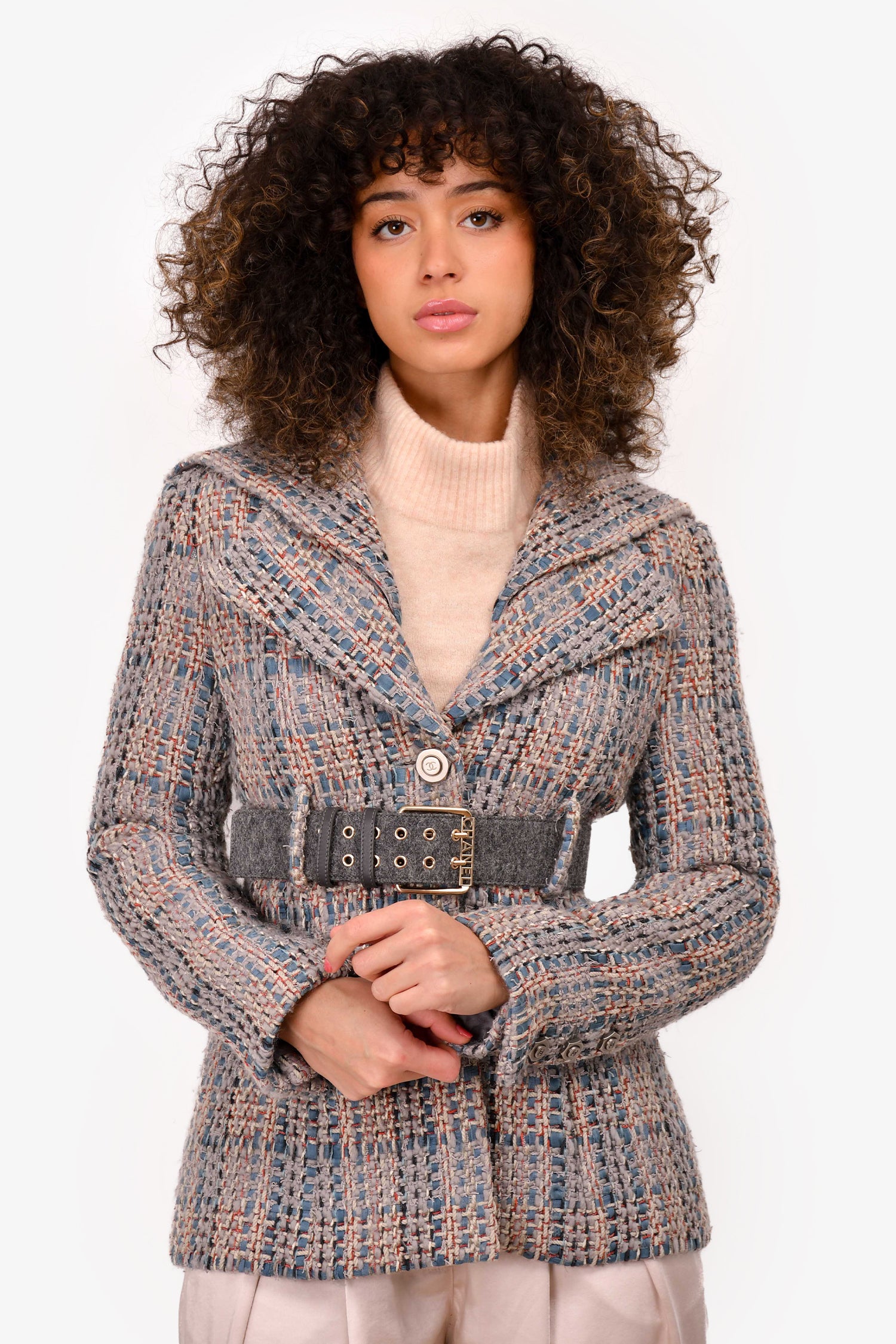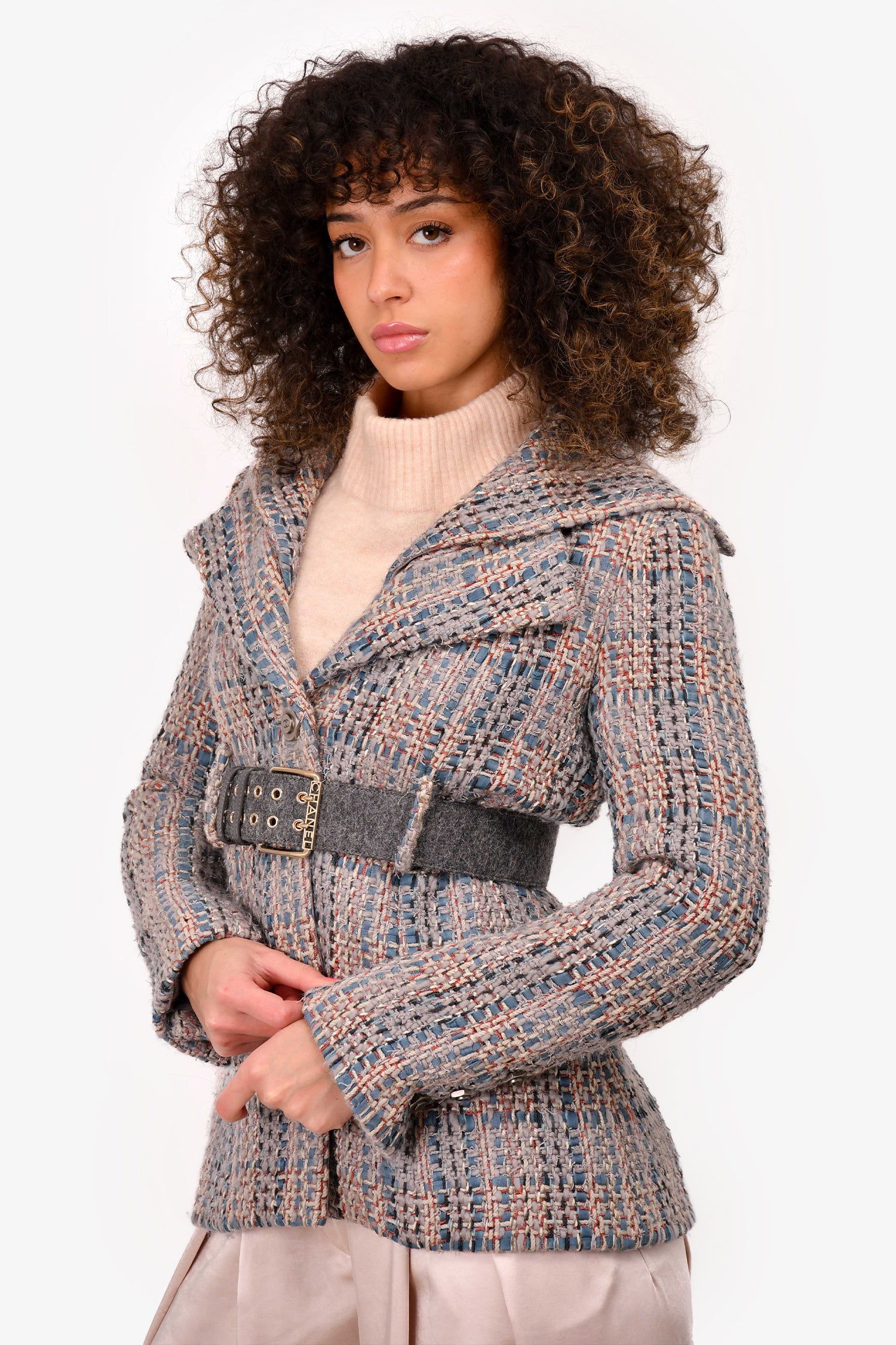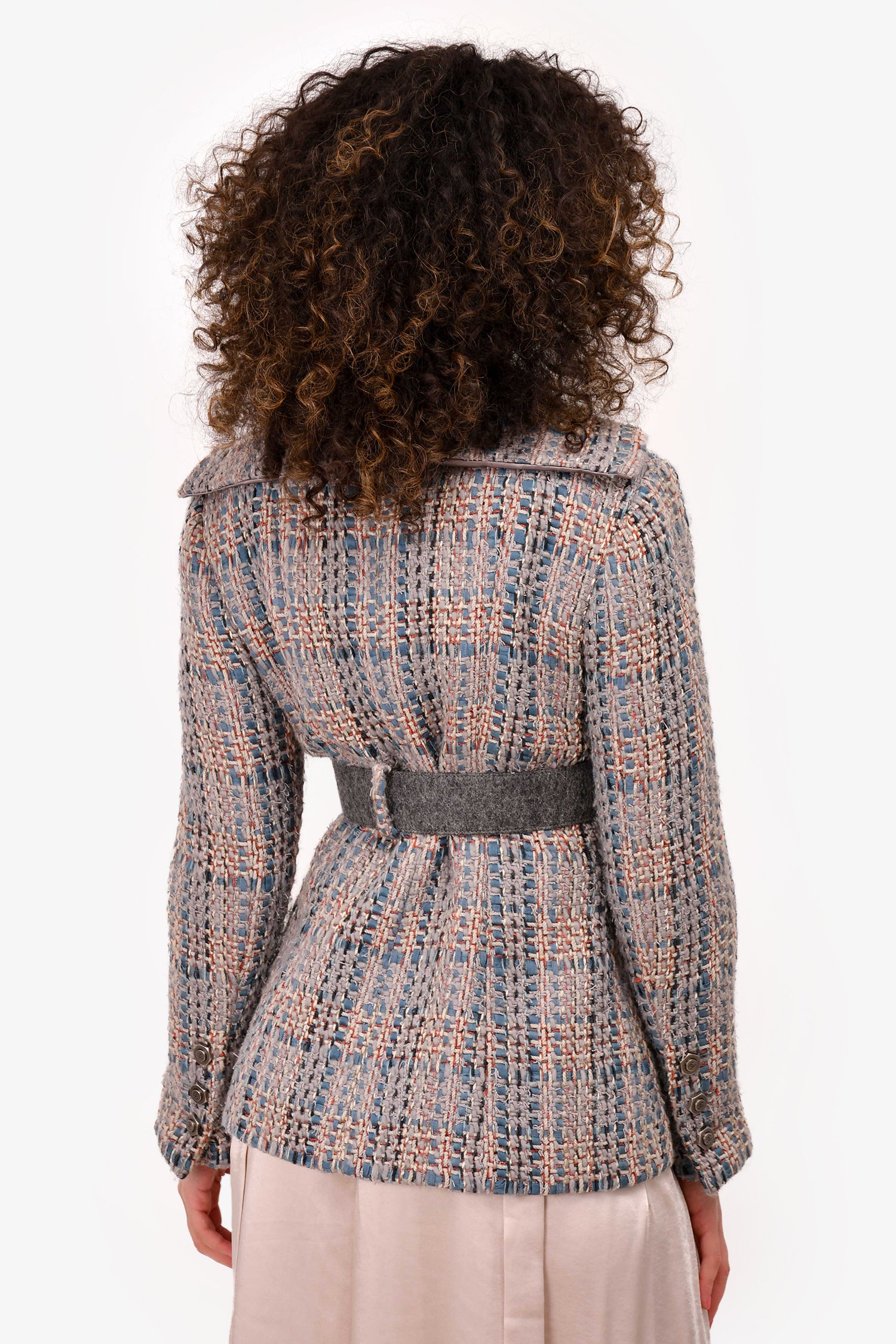 Refresh availabilityPre-Loved Chanel™ 2018 Autumn Grey/Blue Tweed Belted Jacket. Front button-up closure. Waist belt with buckle closure. Front pockets. Lined. Padded shoulders.