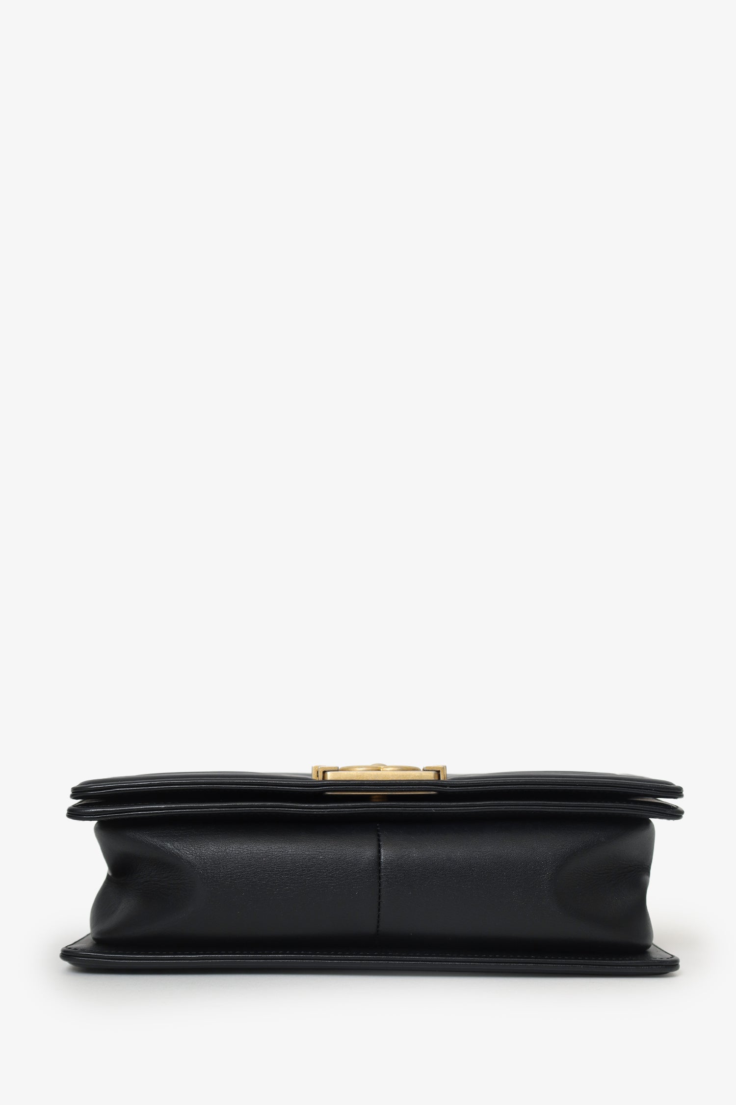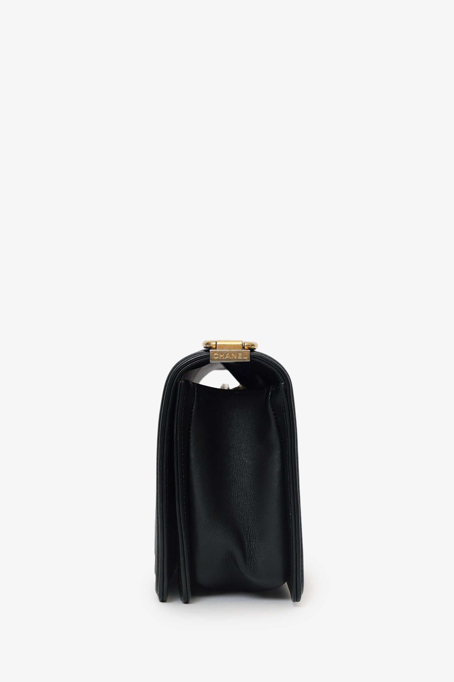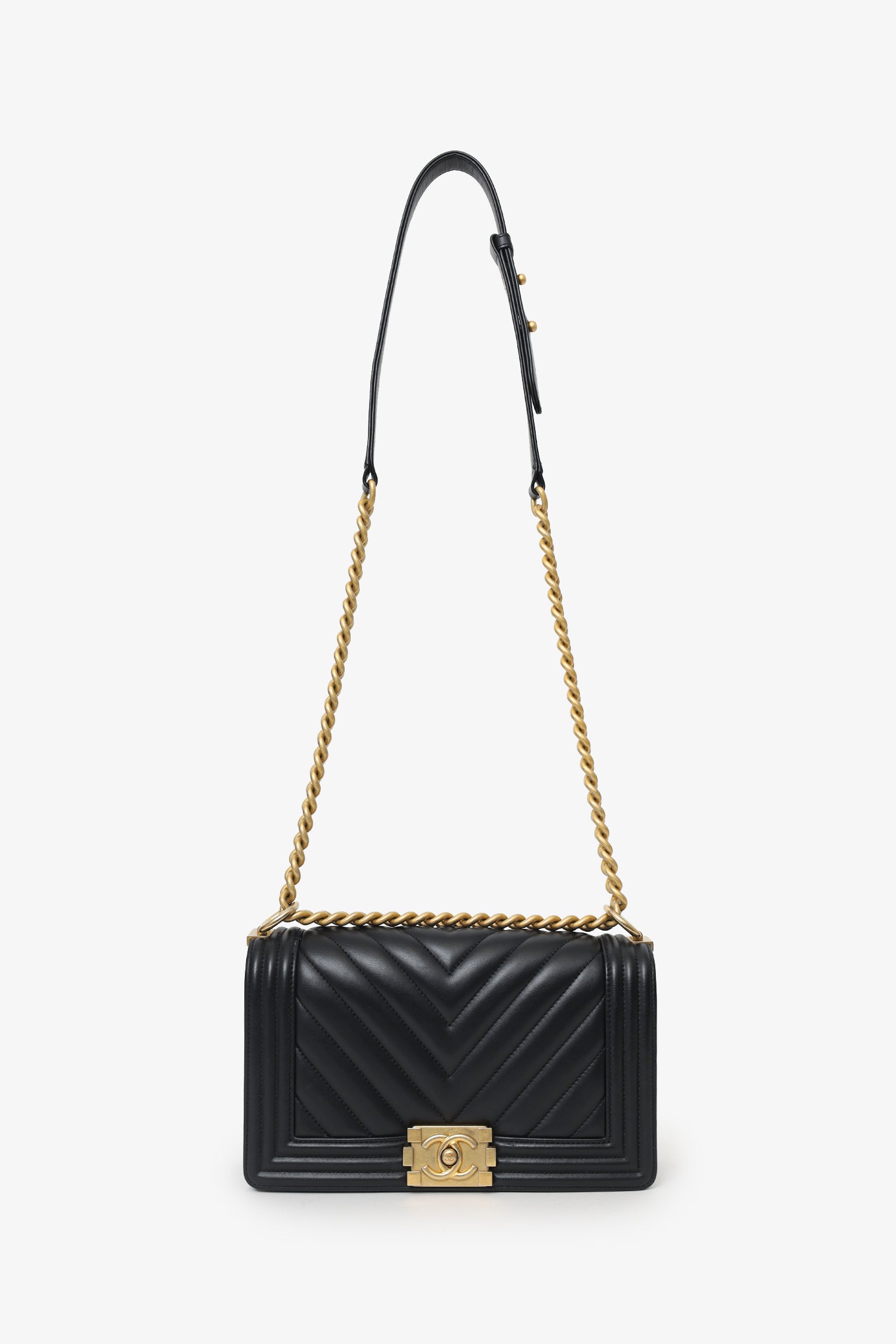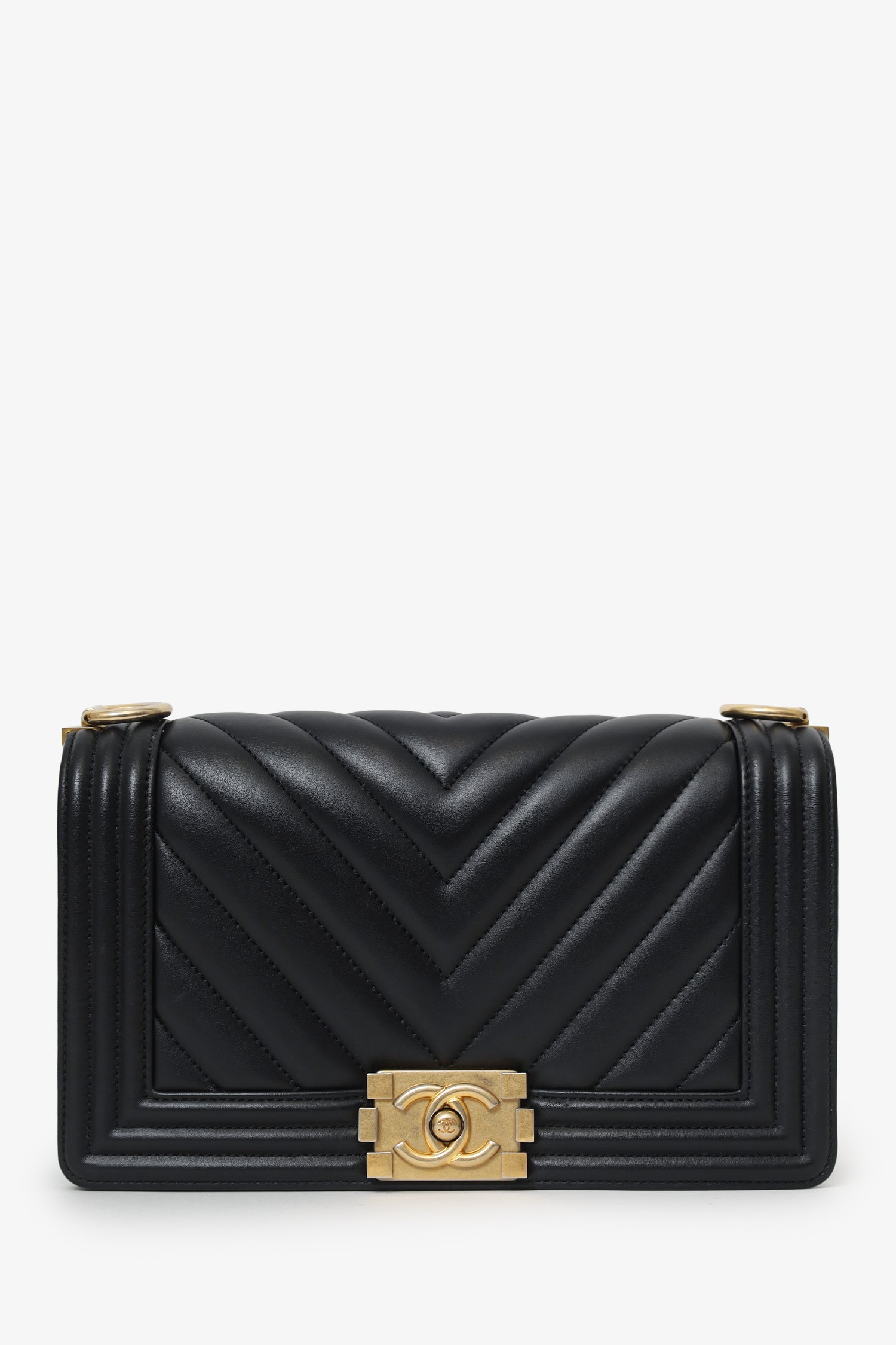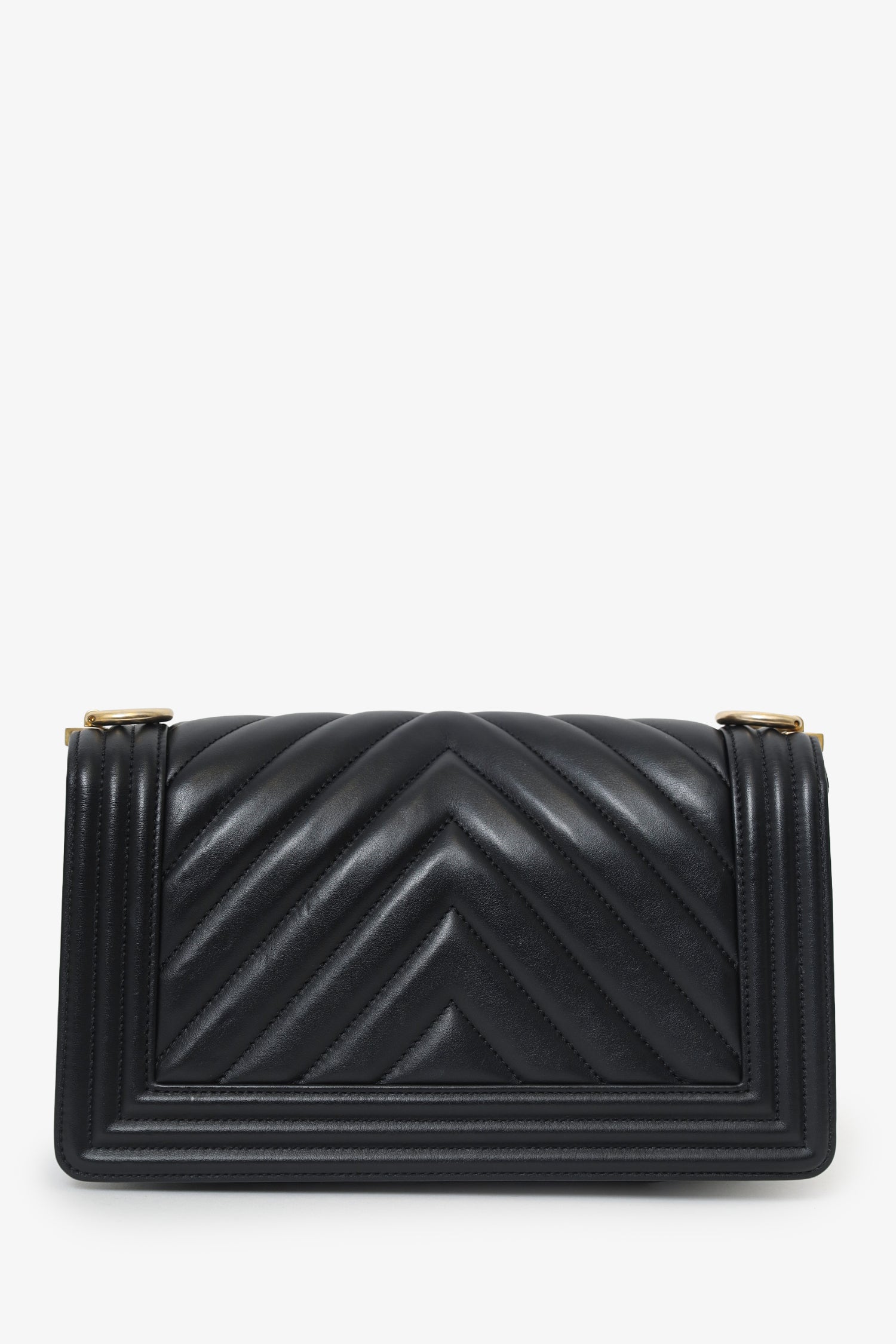 Refresh availabilityPre-Loved Chanel™ 2018 Black Leather Chevron Medium Boy Bag. Front fold-over flap with push pin closure. Twin chain link shoulder straps that can be pulled in and extended to one long strap with push pin closure detail. Lined interior. Open interior compartment with single wall slip pocket. Gold-tone hardware. Tonal stitching.