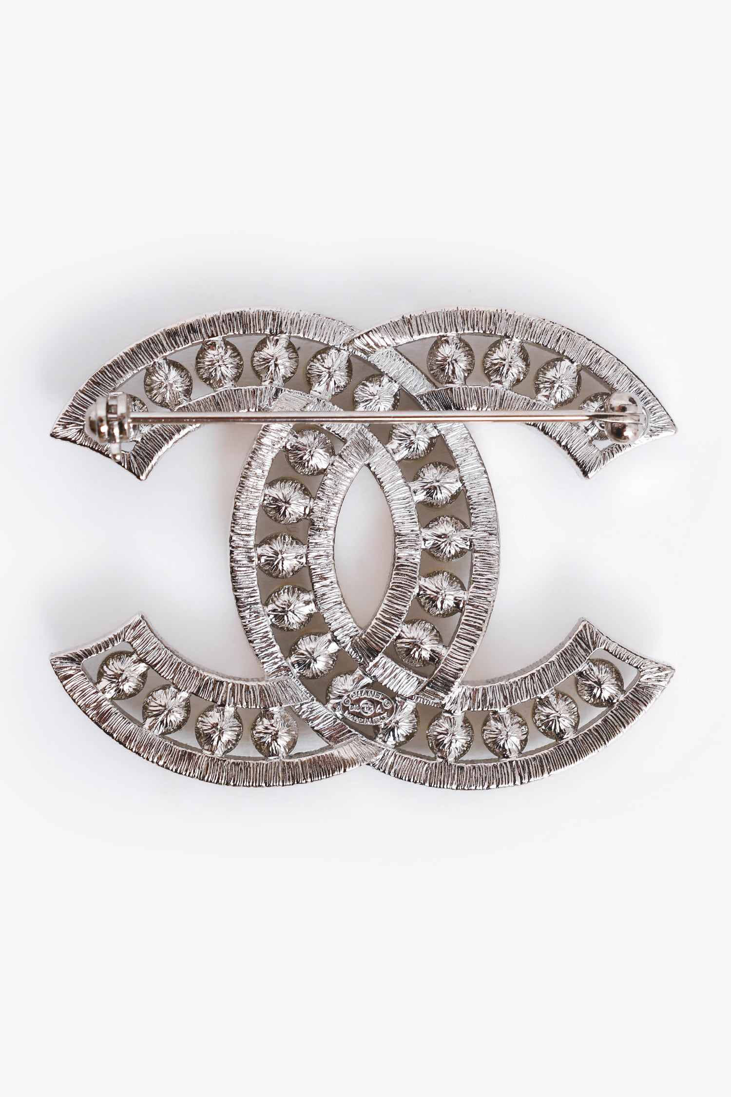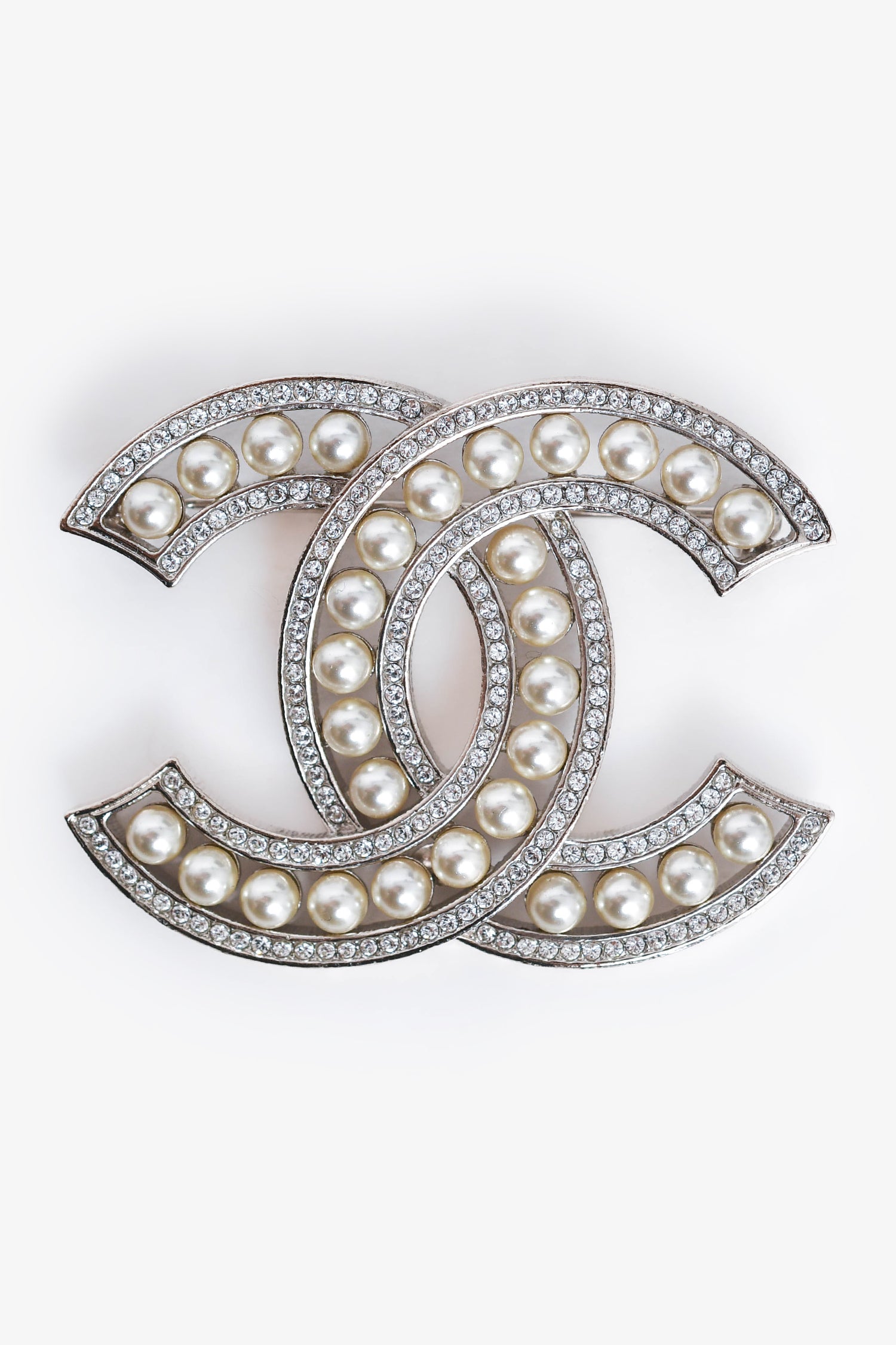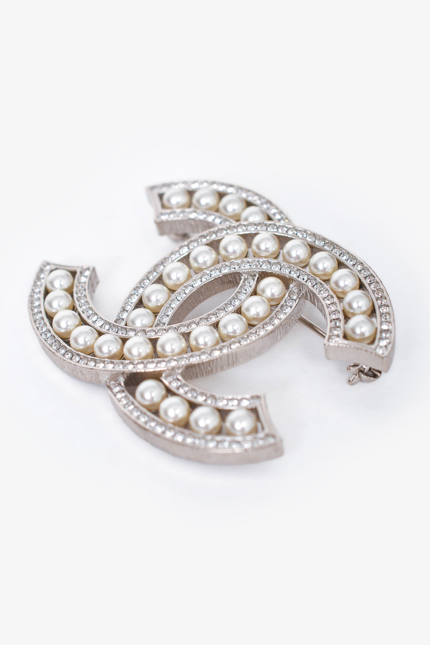 Pre-Loved Chanel™ 2018 Crystal Embellished Faux Pearl CC Brooch. Silver-tone hardware.