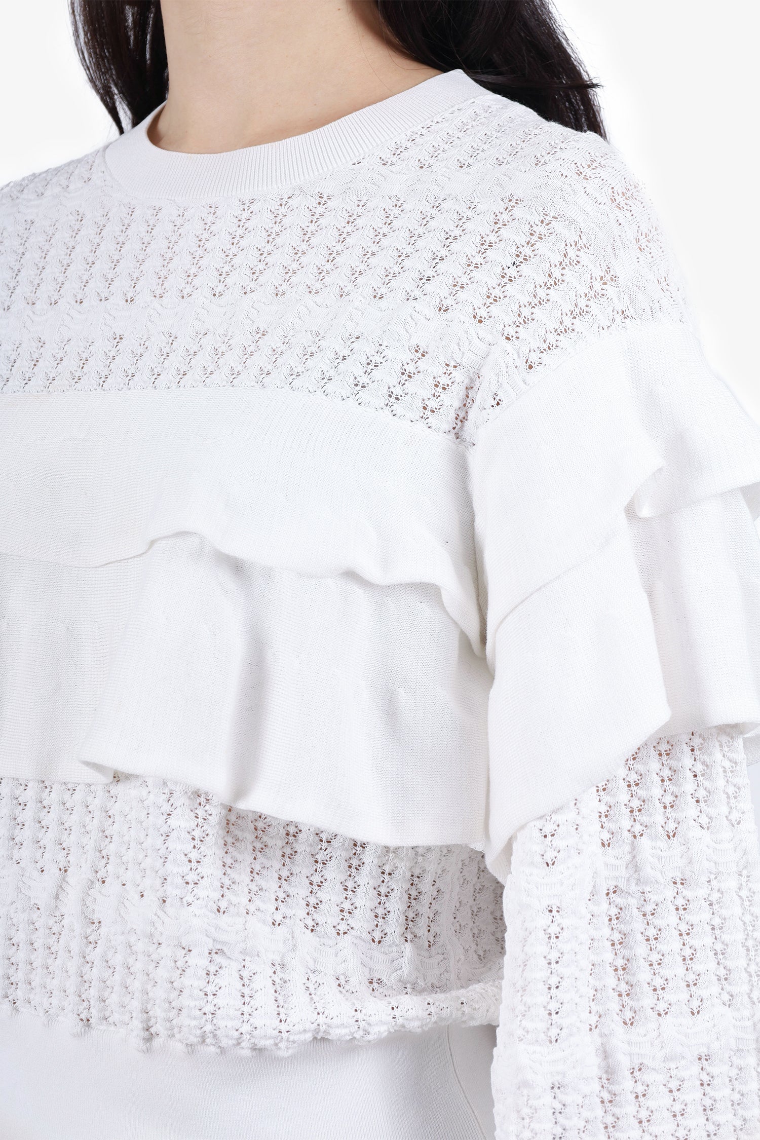 Chanel 2018 White Ruffled Knitted Jumper. Rear button closure. Round neckline. Tonal stitching.