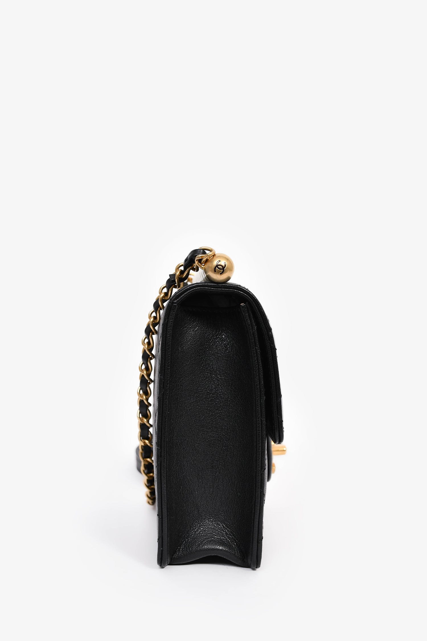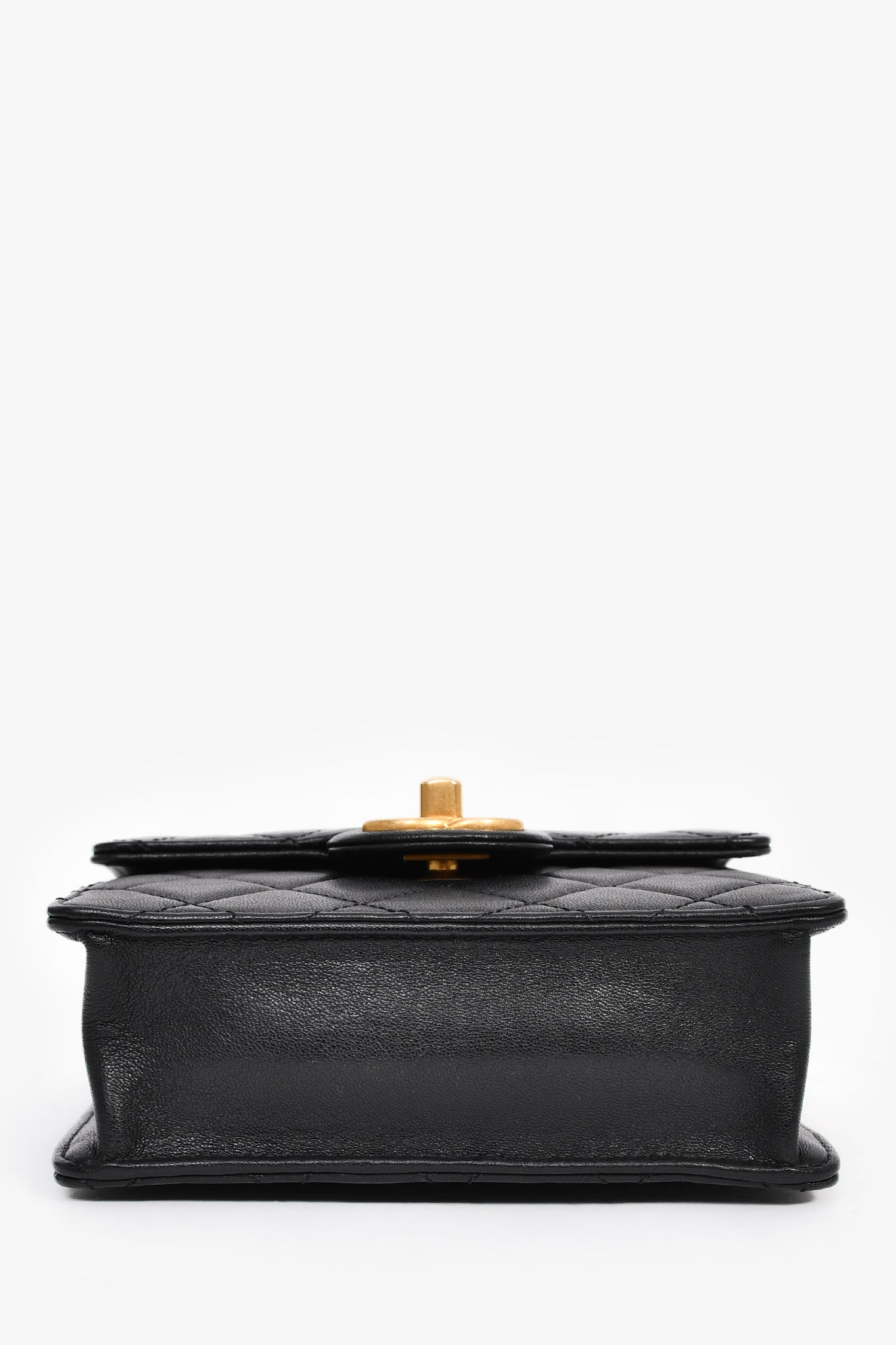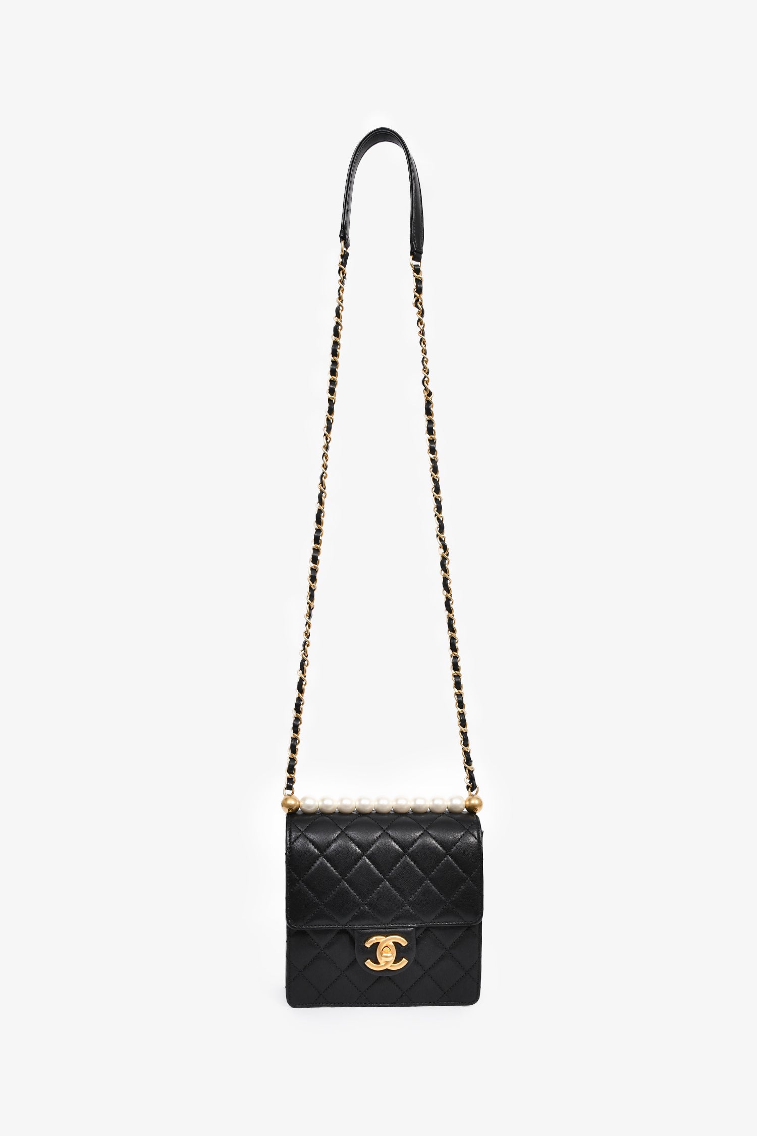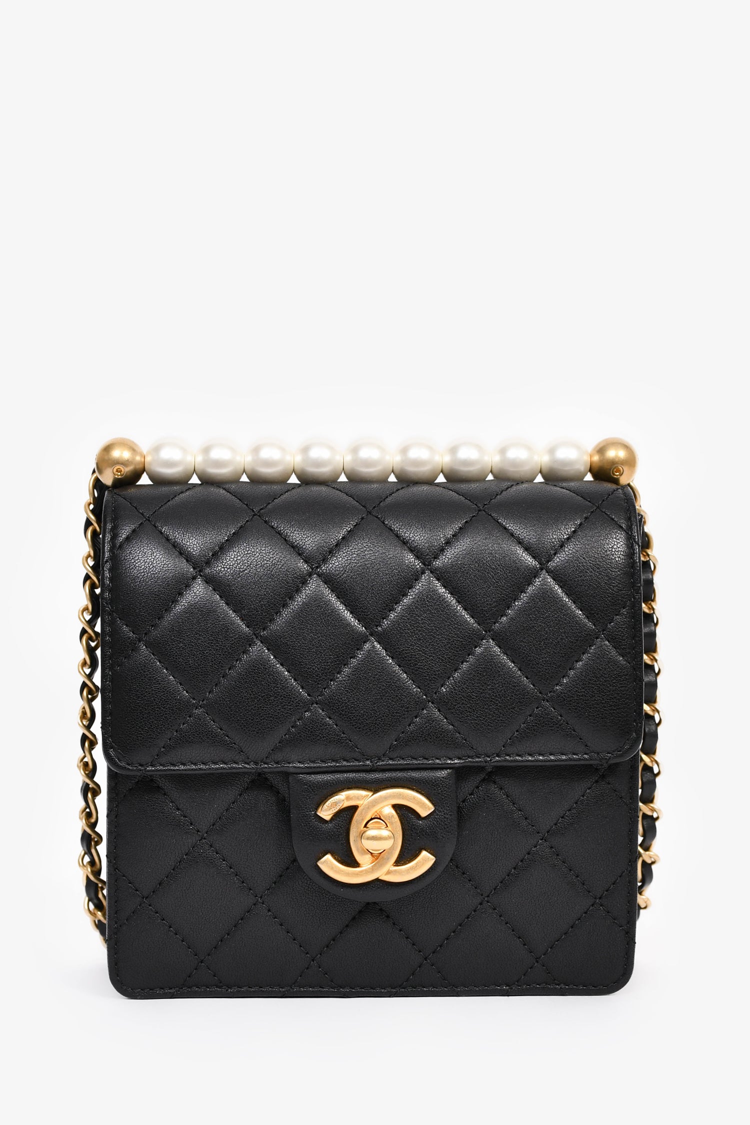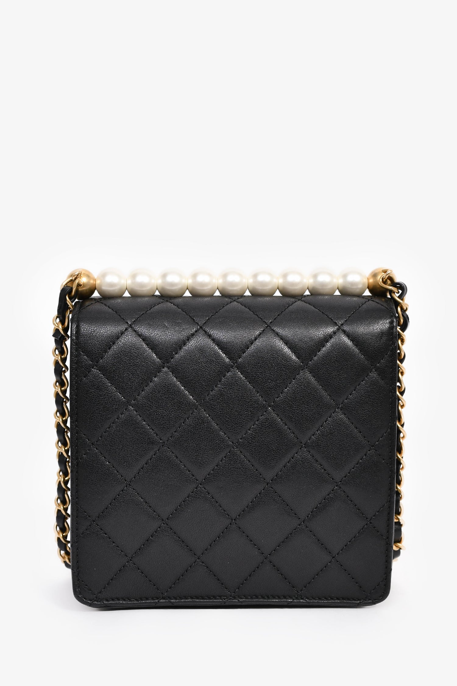 Refresh availabilityPre-Loved Chanel™ 2018-19 Black Quilted Leather Chic Pearl Square Flap Bag. Front fold-over flap with turn-lock closure. Chain strap with leather trims. Leather-lined interior. 2 interior slip pockets. Gold-tone hardware. Tonal stitching.
