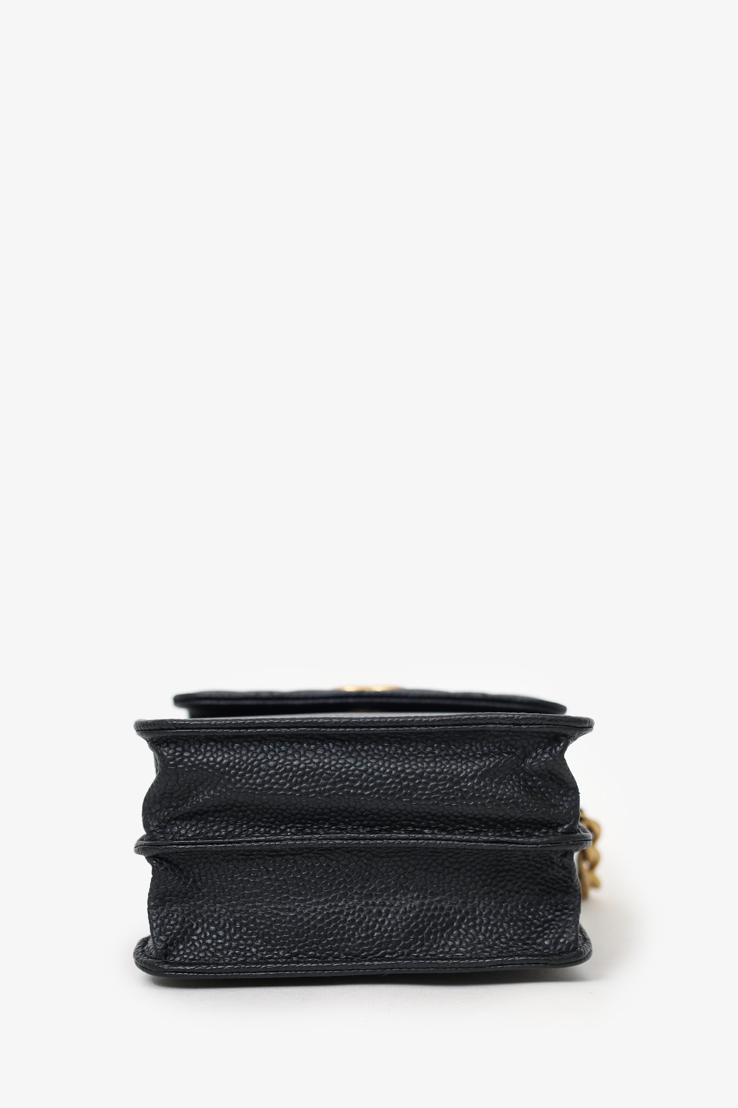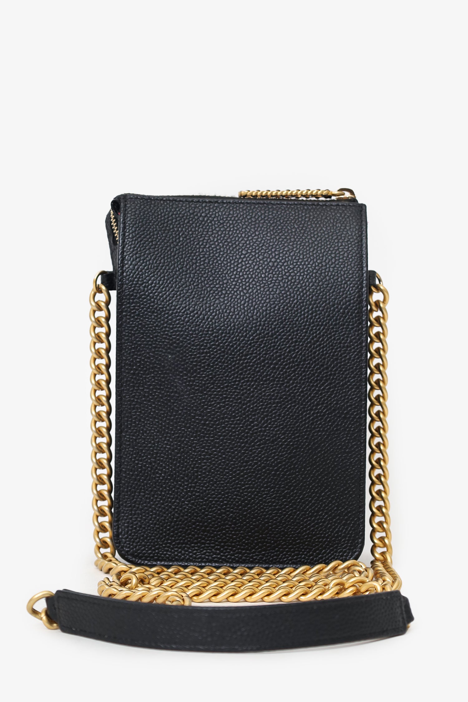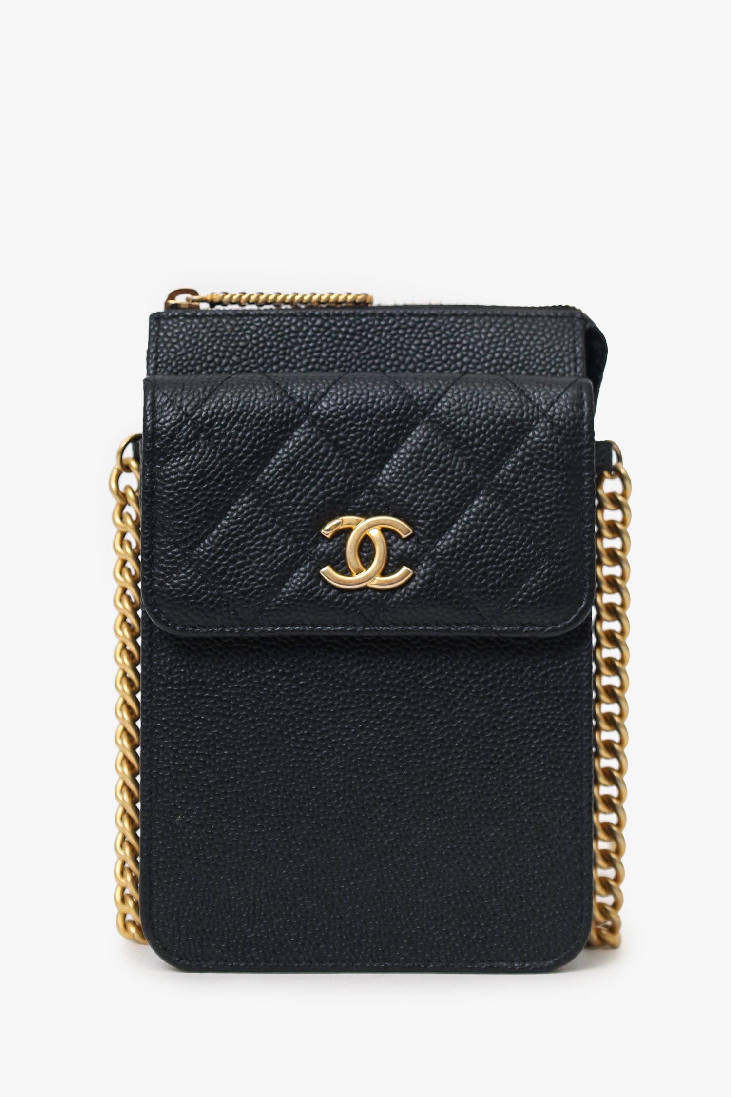 Pre-Loved Chanel™ 2019-20 Black Caviar Leather Crossbody Phone Holder. Top zip closure. Chainlink crossbody strap with leather panel. Front exterior flap slip compartment with snap-button closure. 2 interior slip compartments. Gold-tone hardware. Tonal stitching.