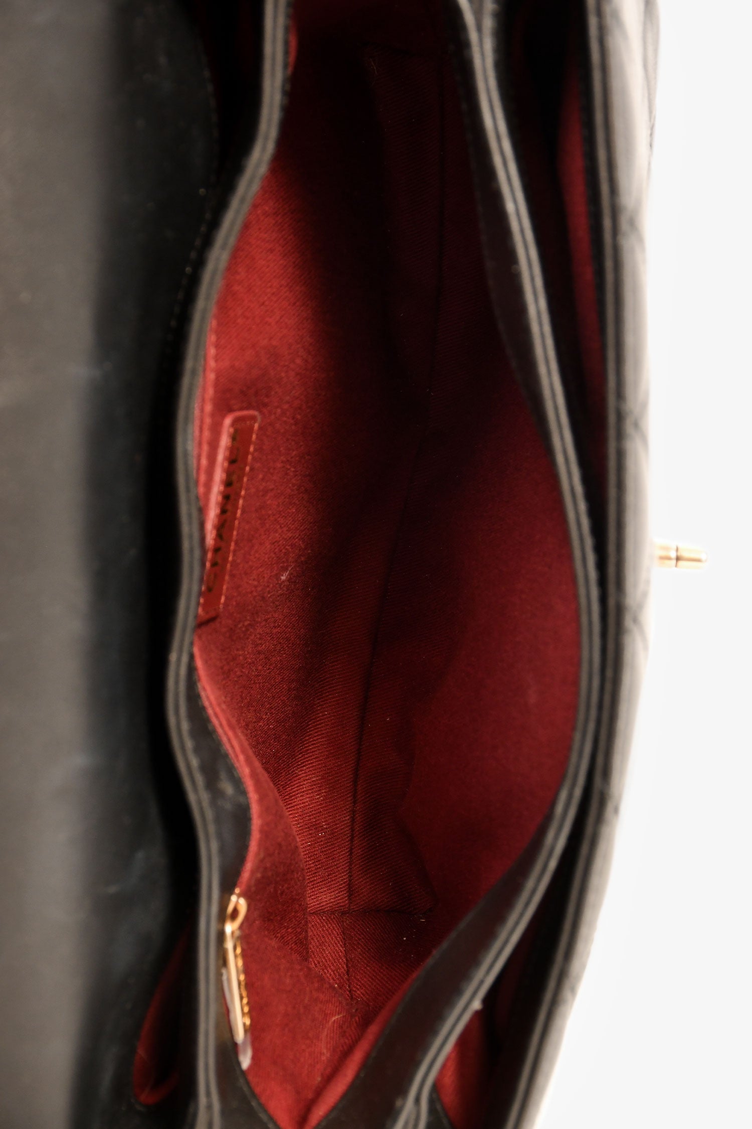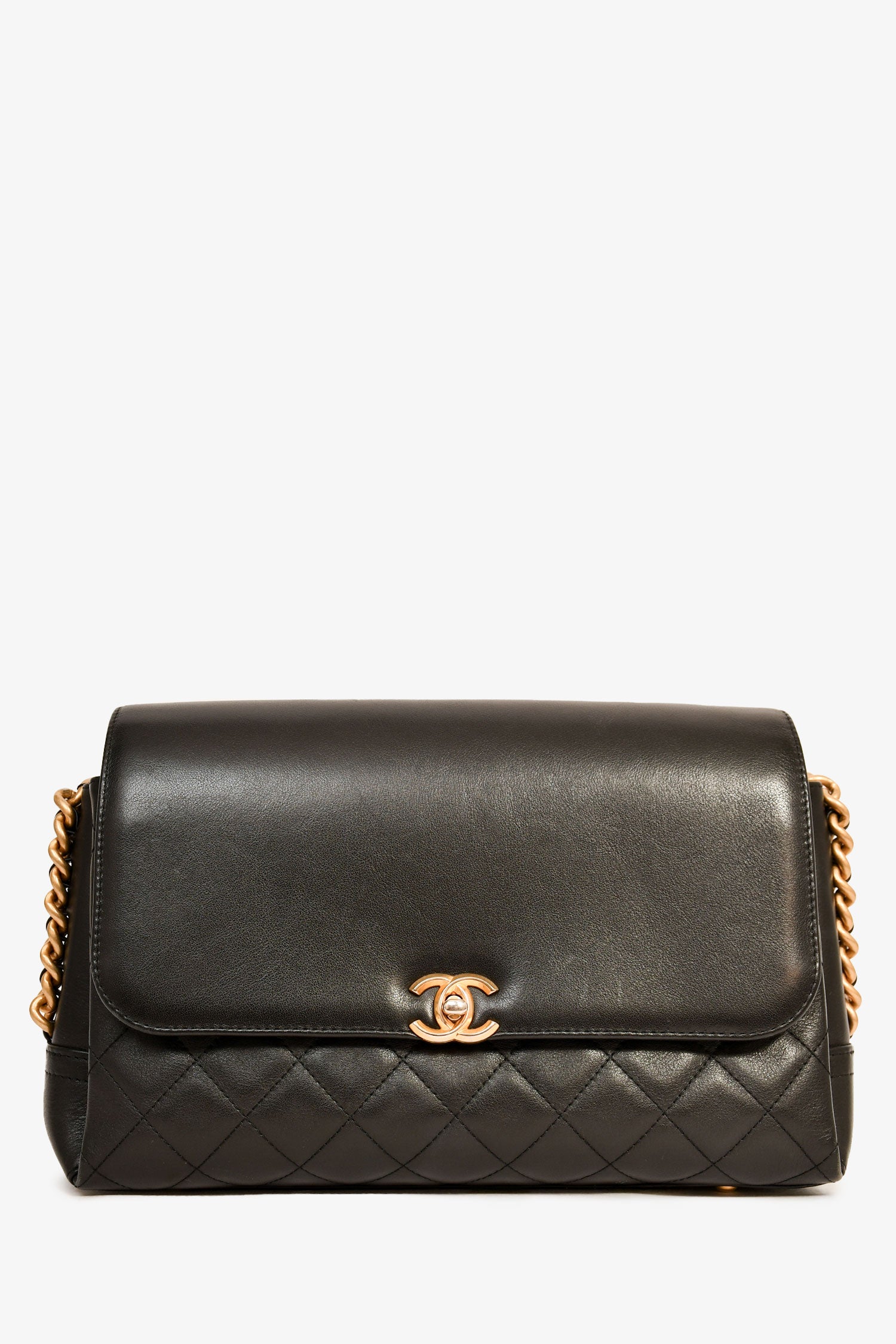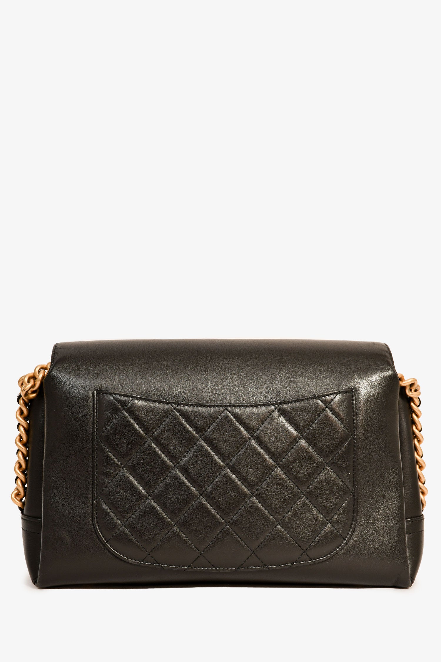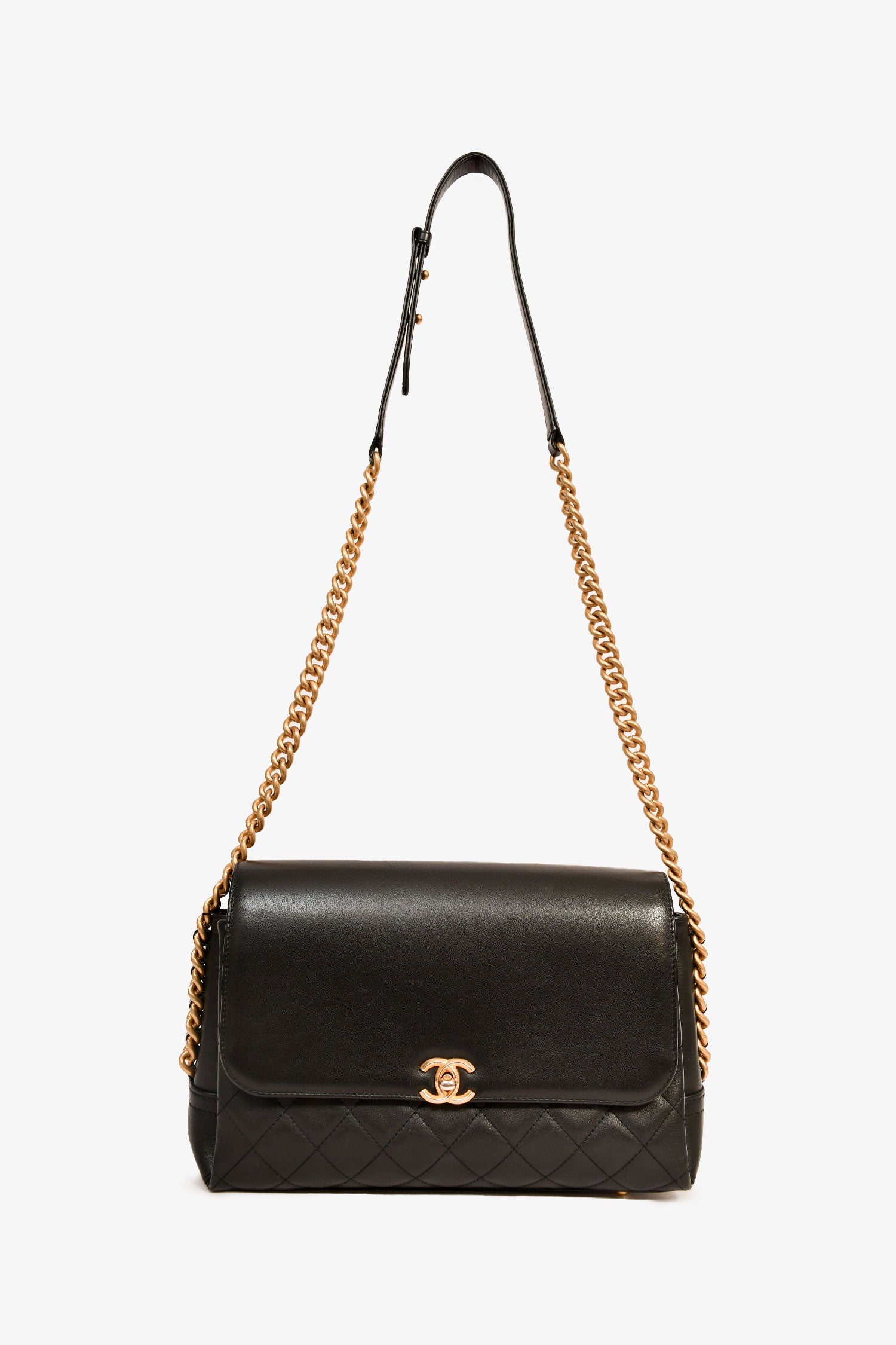 Pre-Loved Chanel™ 2019-20 Black Leather Side Chain Large CC Crossbody Bag. Gold-tone hardware. Turn-lock closure. Fold-over smooth leather flap. Quilted exterior. Chain-link and leather bag strap. 3 interior compartments. Zipped pocket. Tonal stitching.