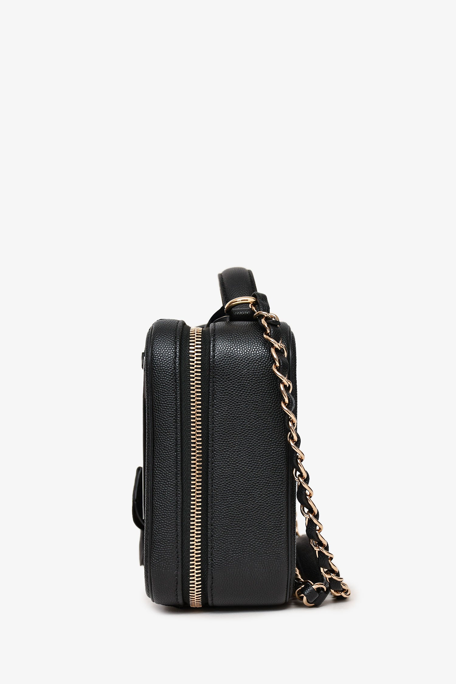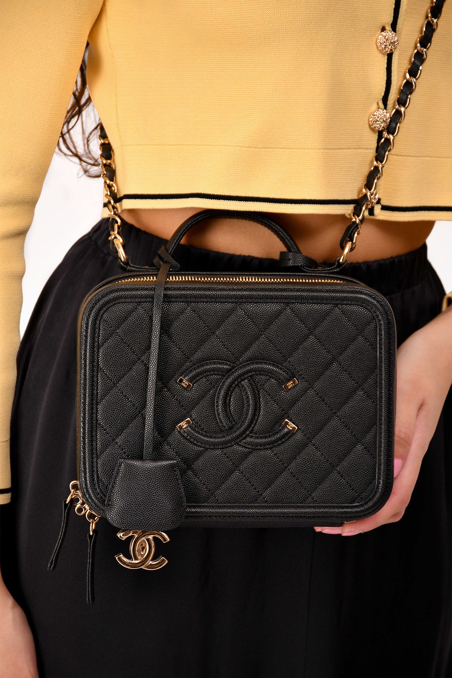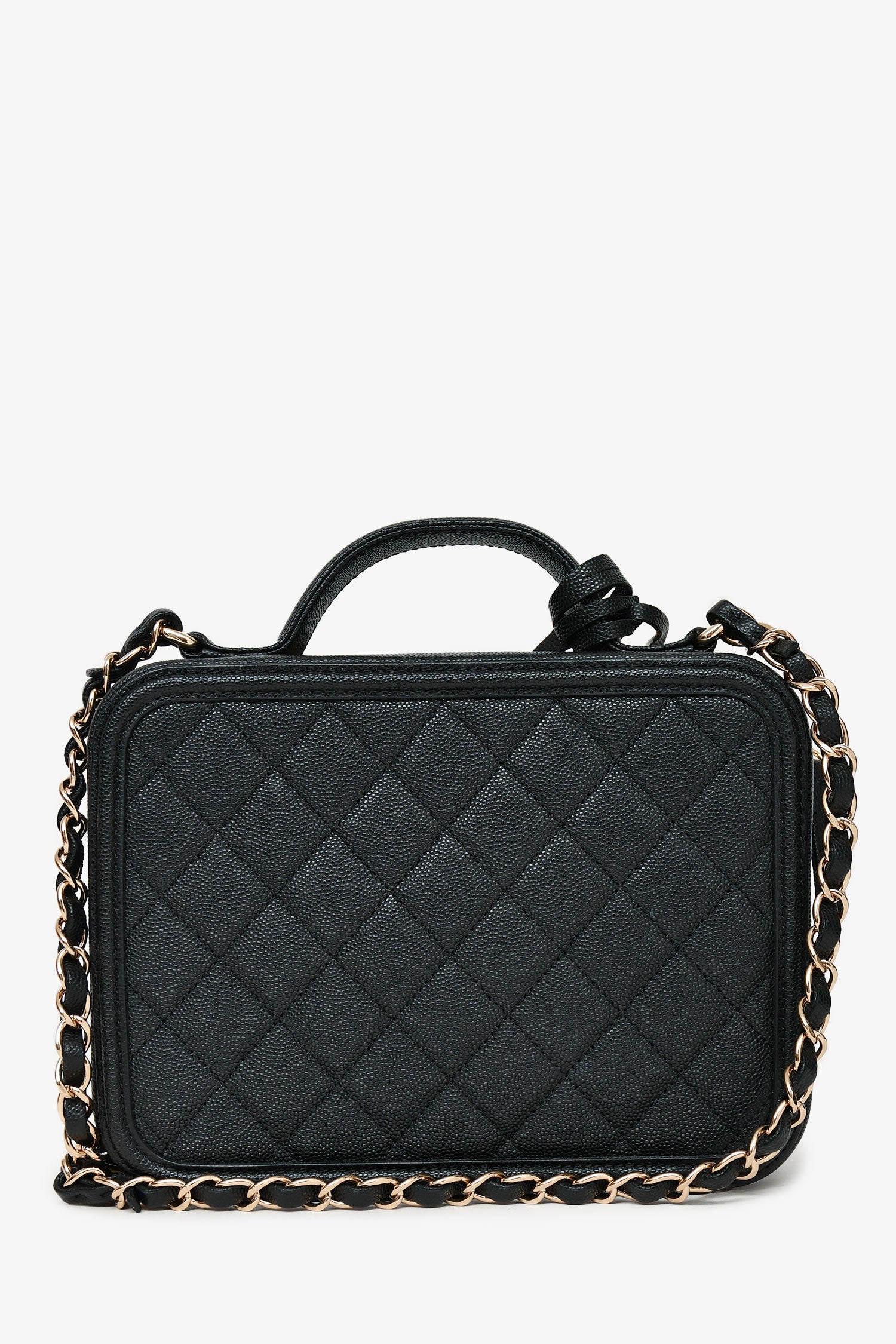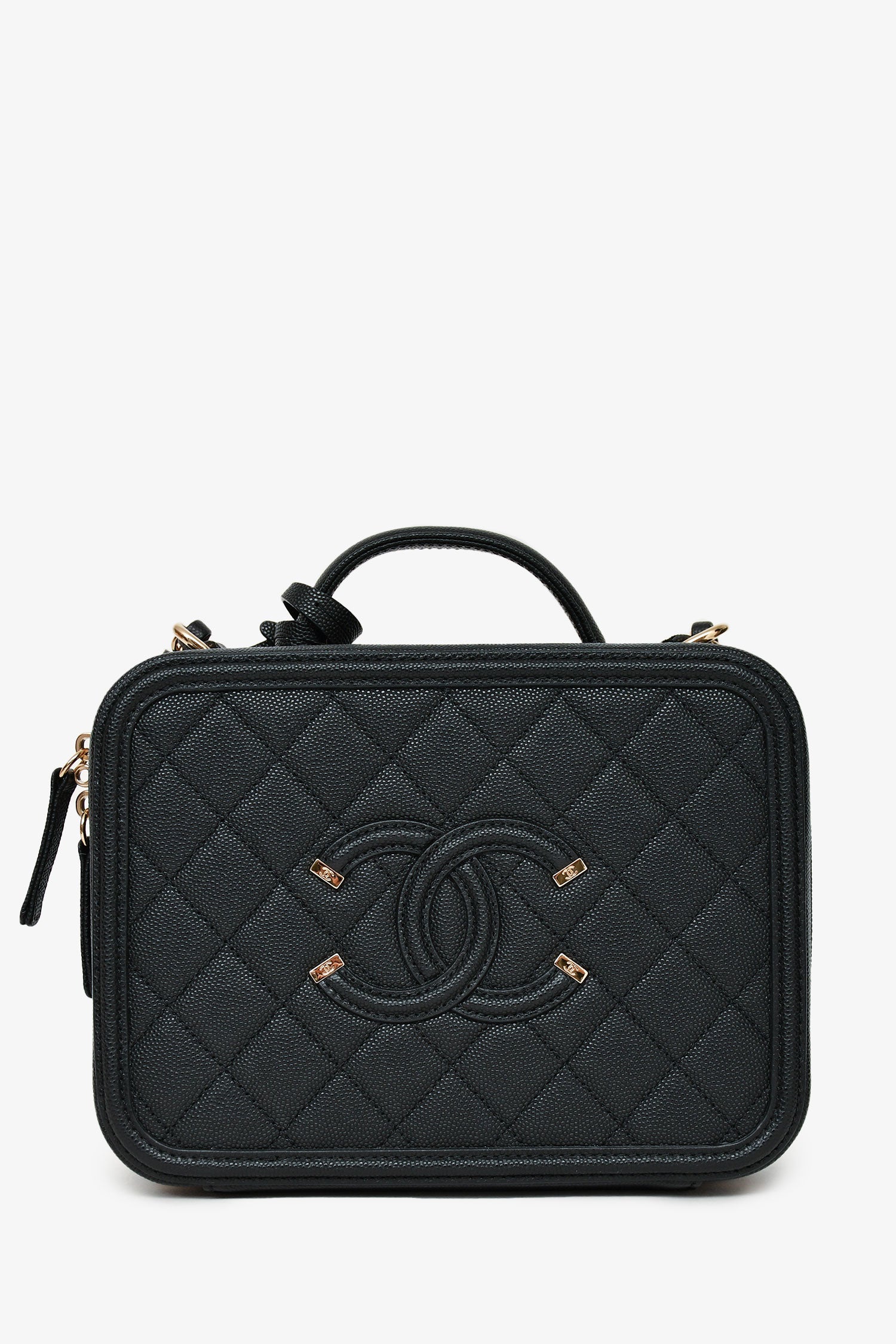 Refresh availabilityPre-Loved Chanel™ 2019 Black Caviar Medium CC Filigree Vanity Case. Signature interlocking CC logo at the front. Dual zip-around closure with leather. Top handle and chain-link leather strap. Lined interior with two open compartments and one zippered compartment in the middle. One wall zip pocket. Gold-tone hardware. Tonal stitching. Comes with dust bag.