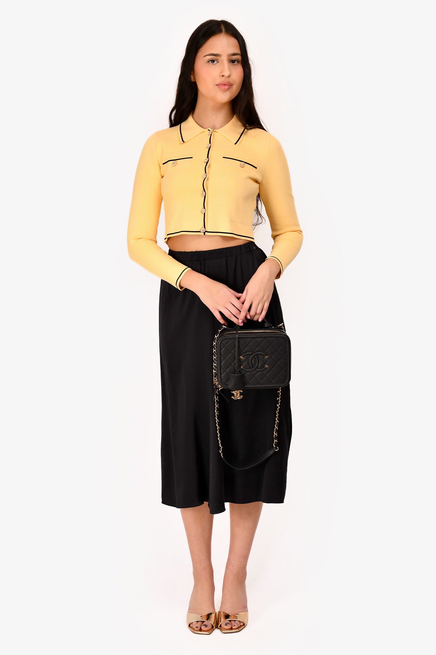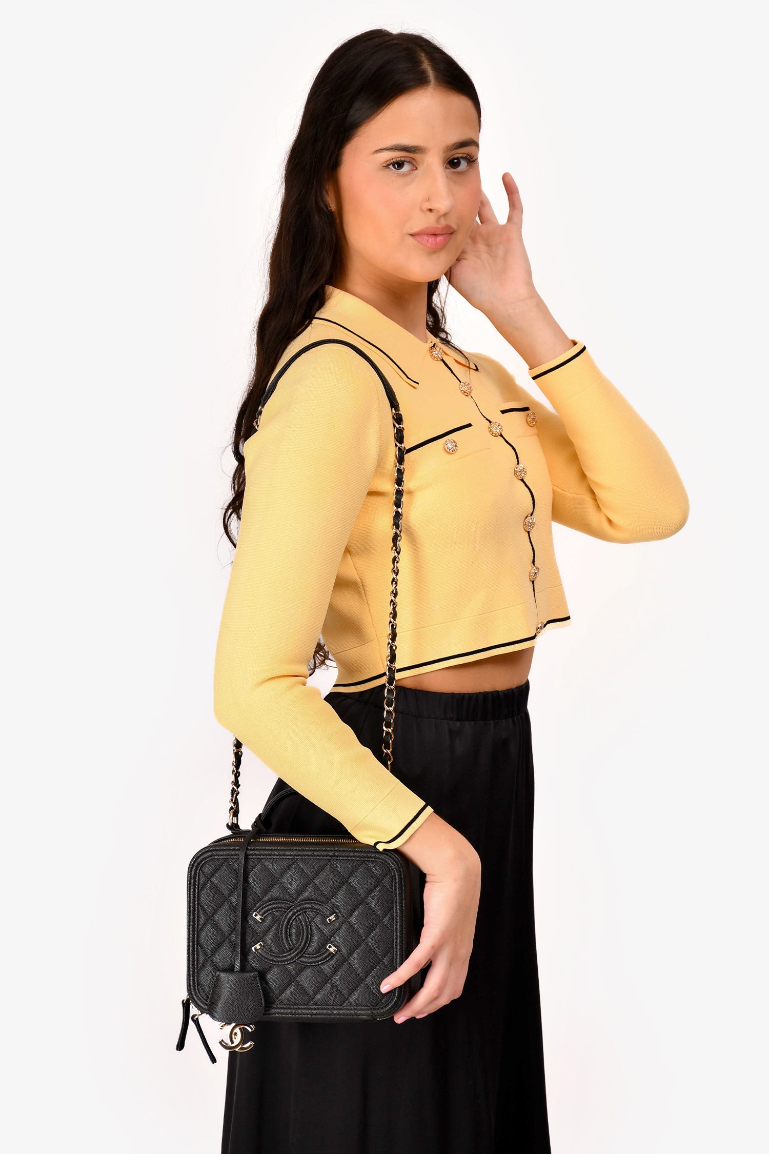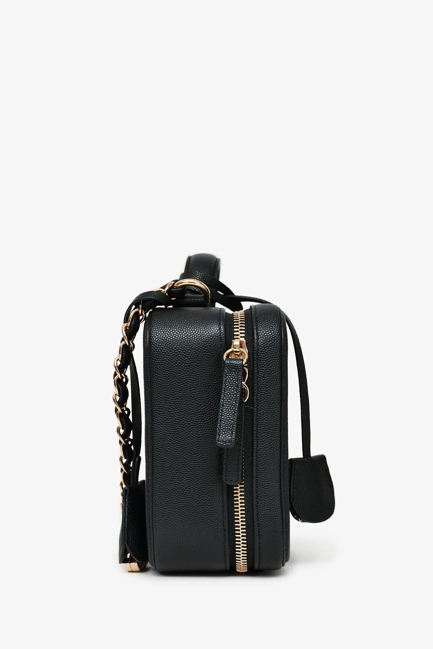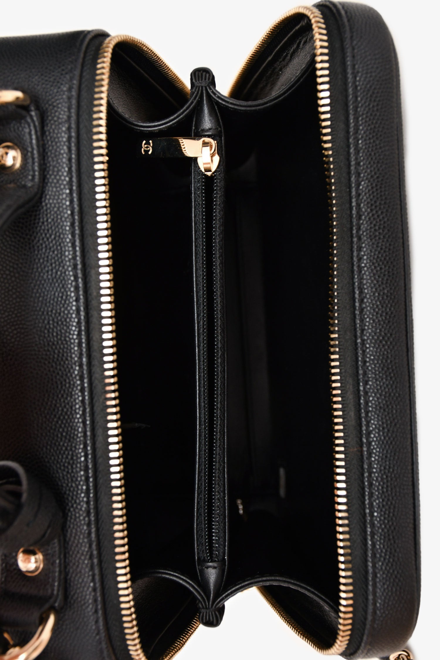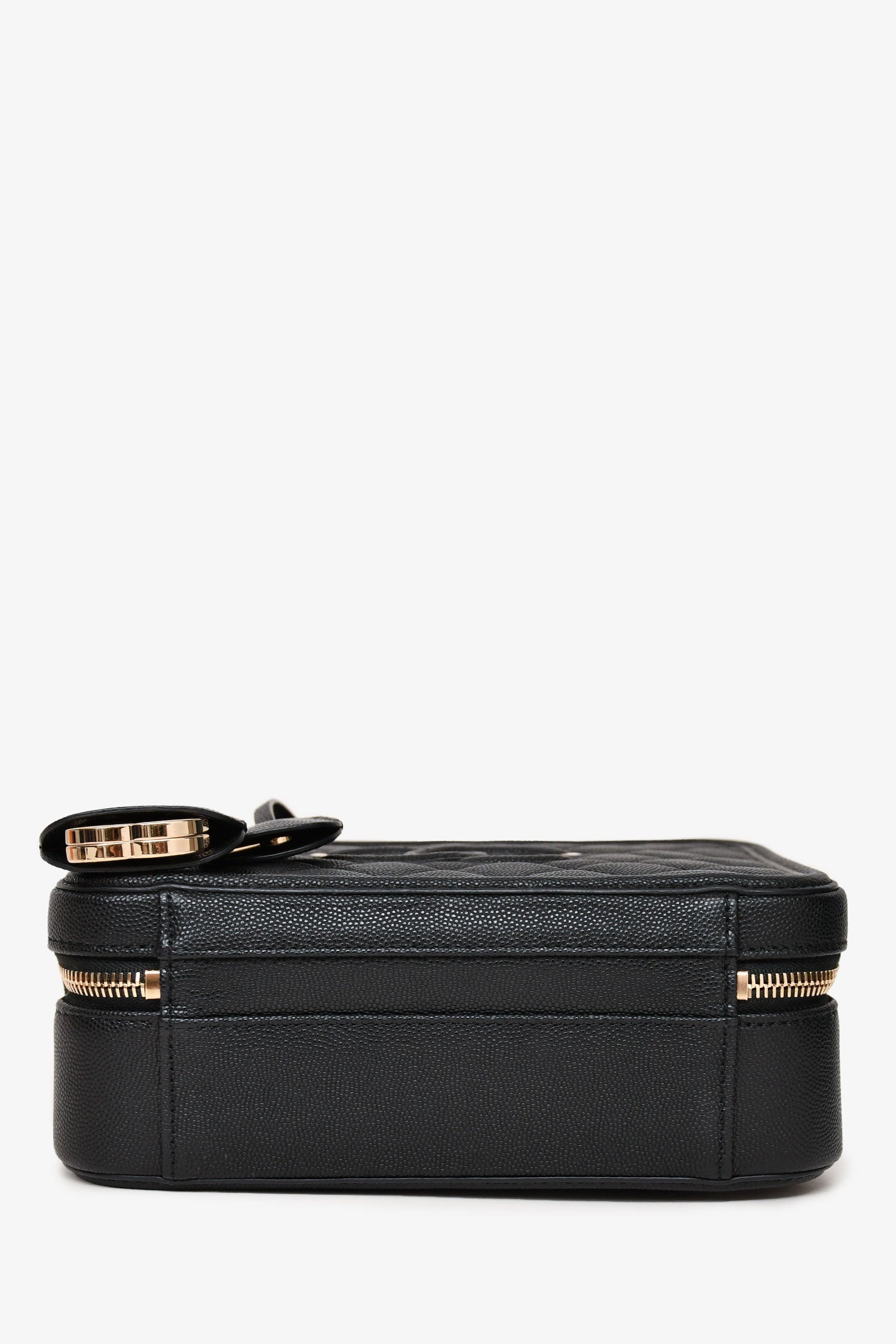 Refresh availabilityPre-Loved Chanel™ 2019 Black Caviar Medium CC Filigree Vanity Case. Signature interlocking CC logo at the front. Dual zip-around closure with leather. Top handle and chain-link leather strap. Lined interior with two open compartments and one zippered compartment in the middle. One wall zip pocket. Gold-tone hardware. Tonal stitching. Comes with dust bag.