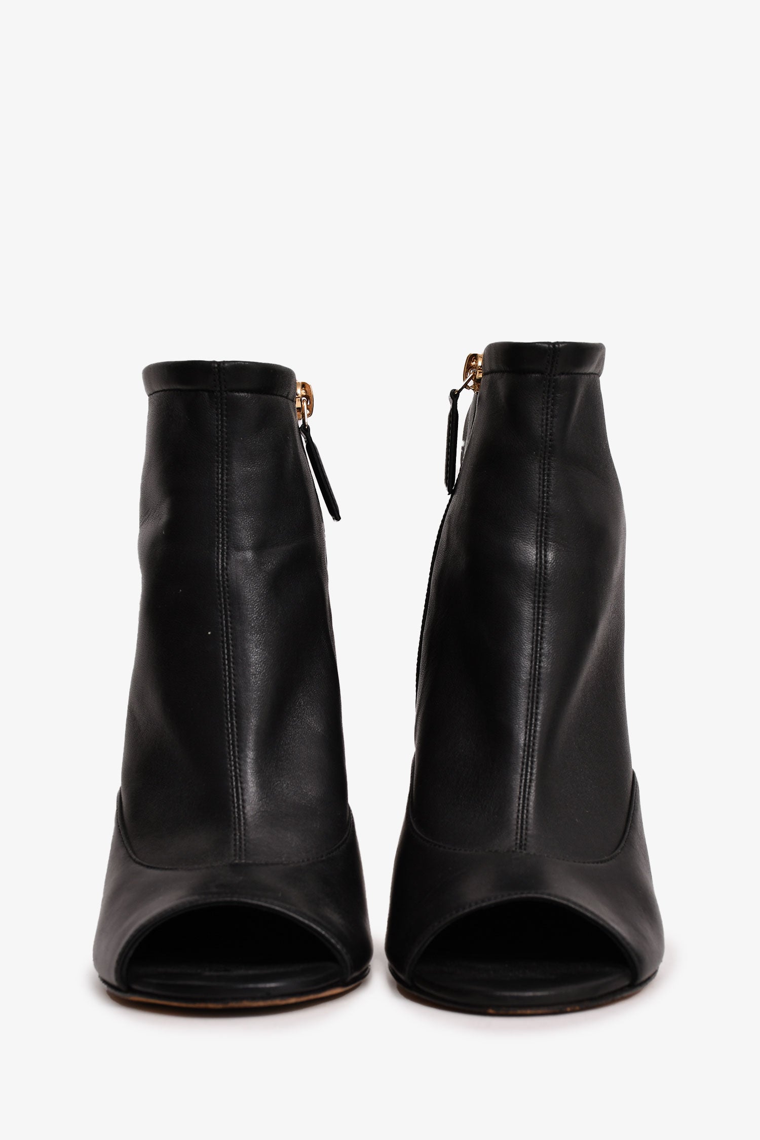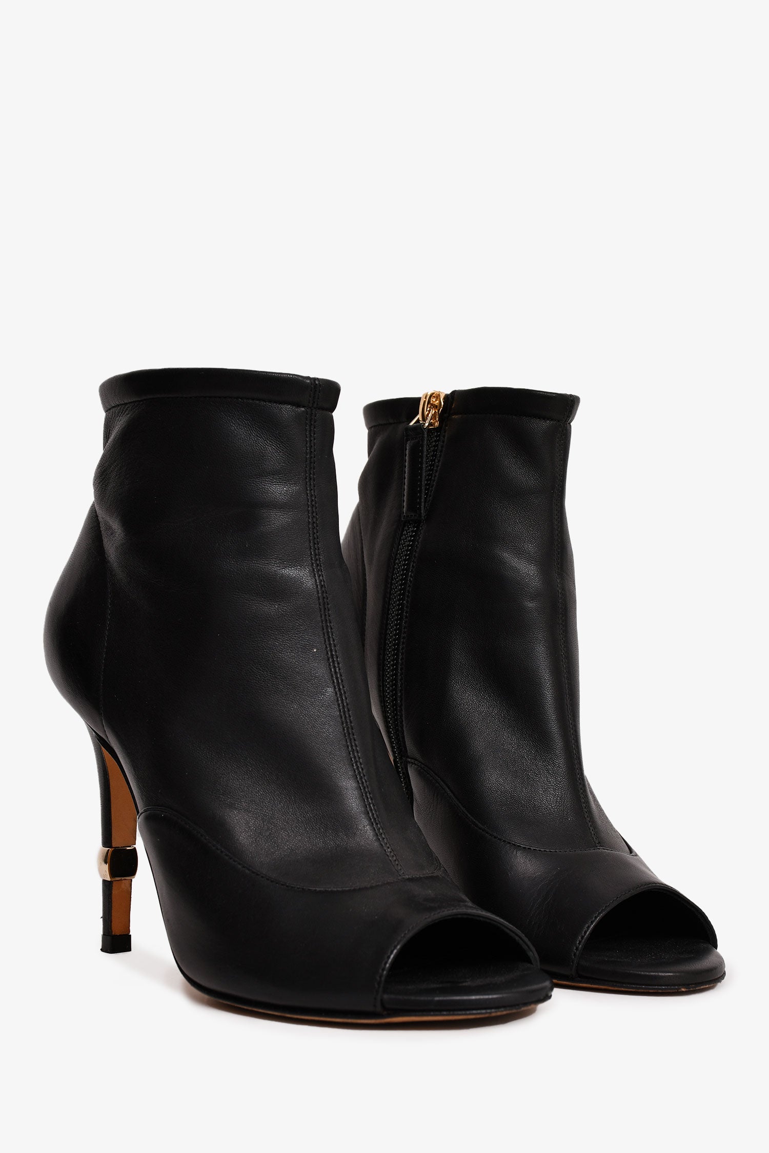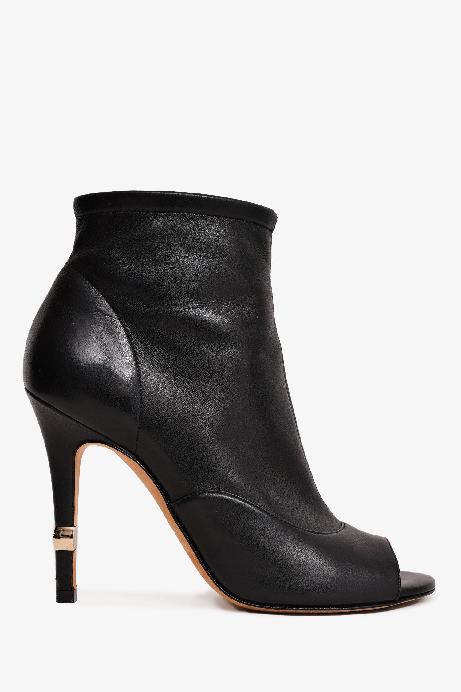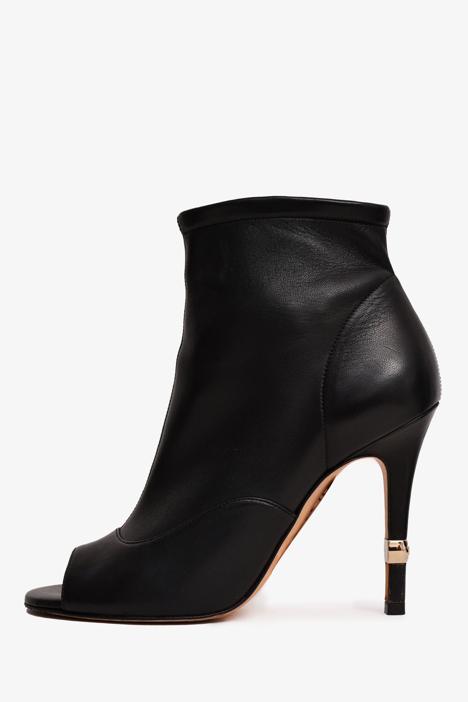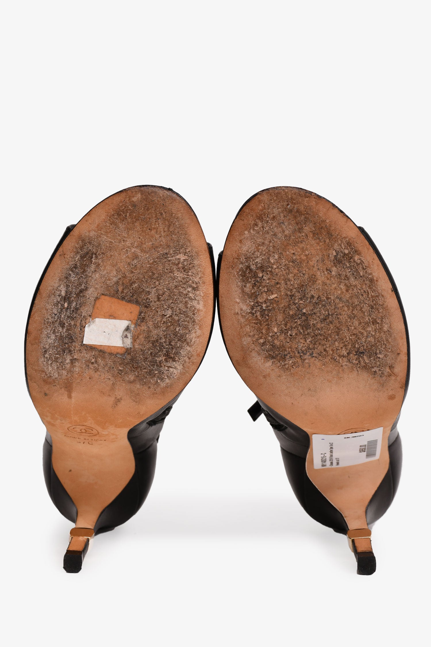 Refresh availabilityPre-Loved Chanel™ 2019 Black Leather Open Toe CC Heels. Side zip closure. Gold-tone hardware detailing.