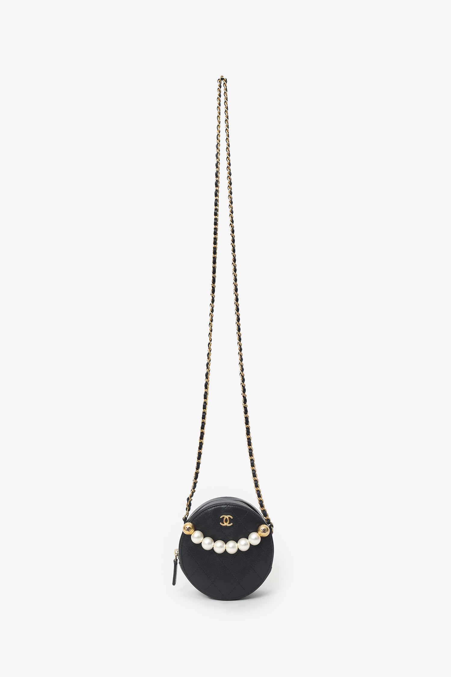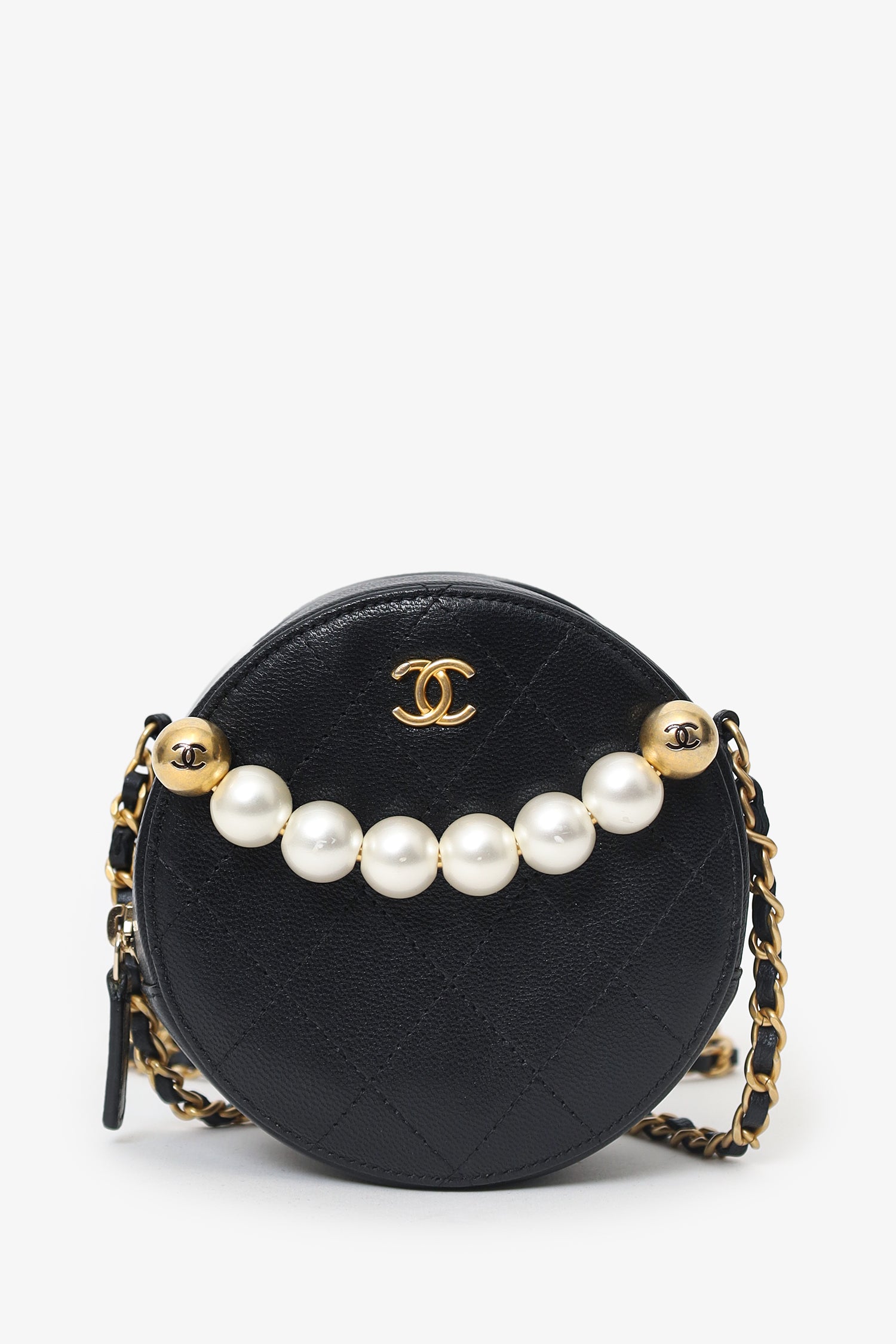 Pre-Loved Chanel™ 2019 Black Quilted Lambskin Round Chic Pearls Crossbody Bag. Top zip closure. Crossbody chainlink strap. Lined interior. 2 interior slip pockets. Gold-tone hardware. Tonal stitching.