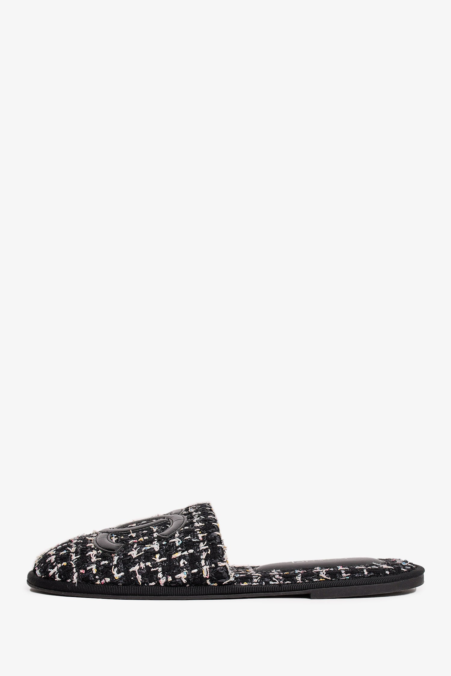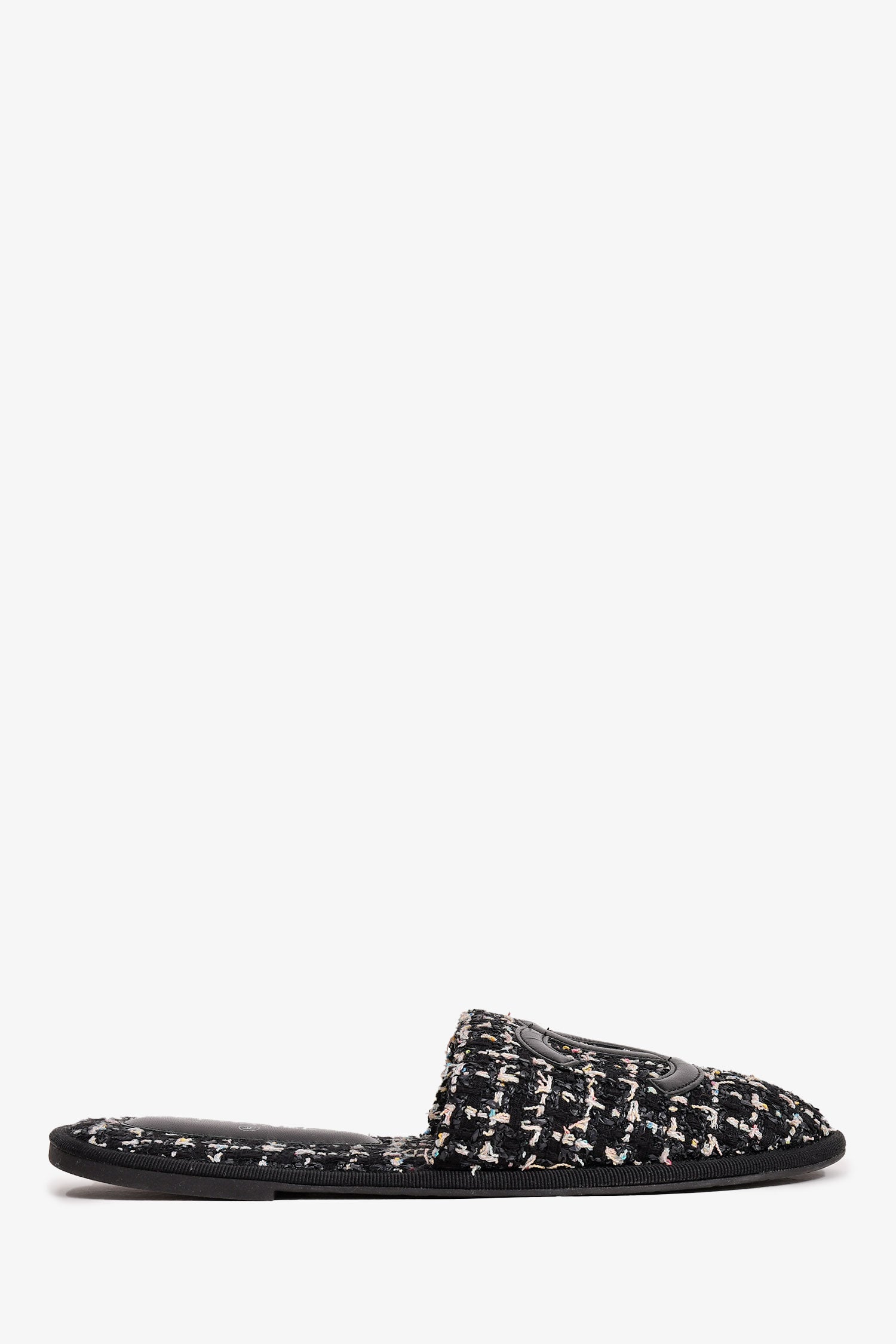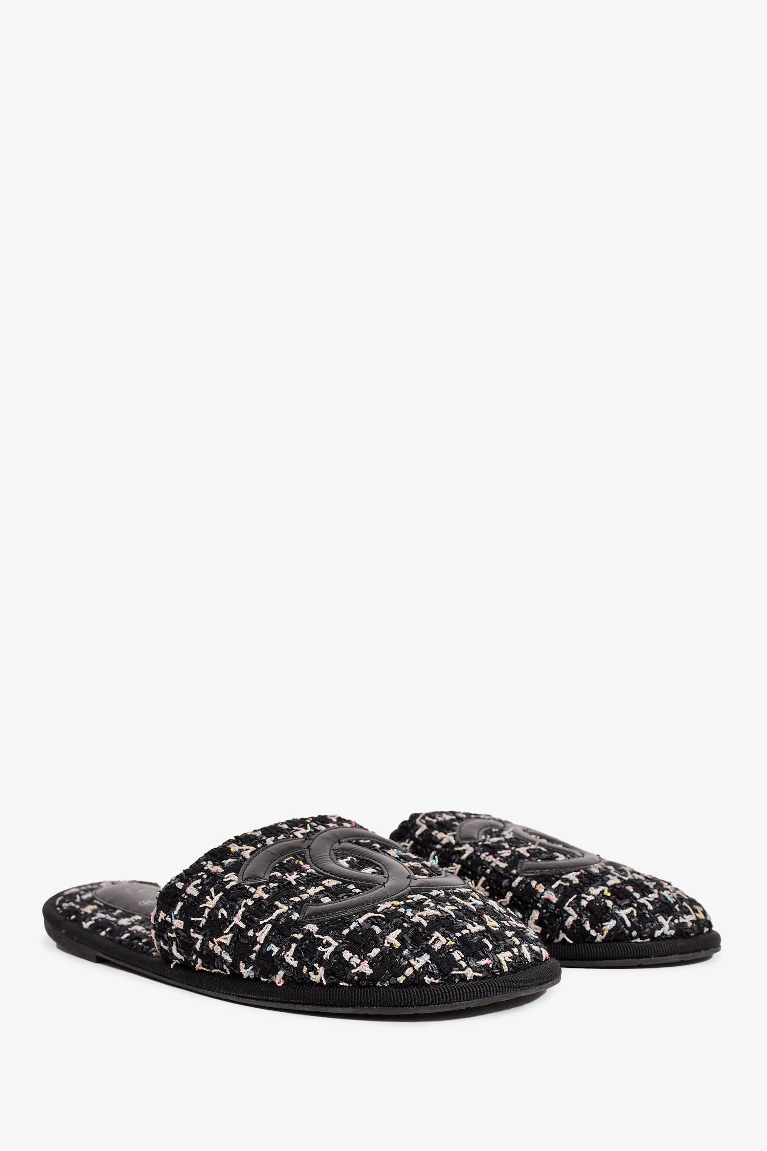 Refresh availabilityPre-Loved Chanel™ 2019 Black Tweed CC Logo Slippers. Slip-on. Round toe. Open back.