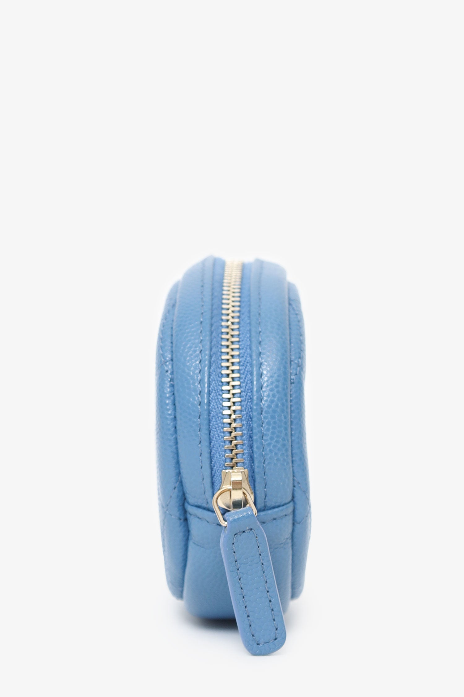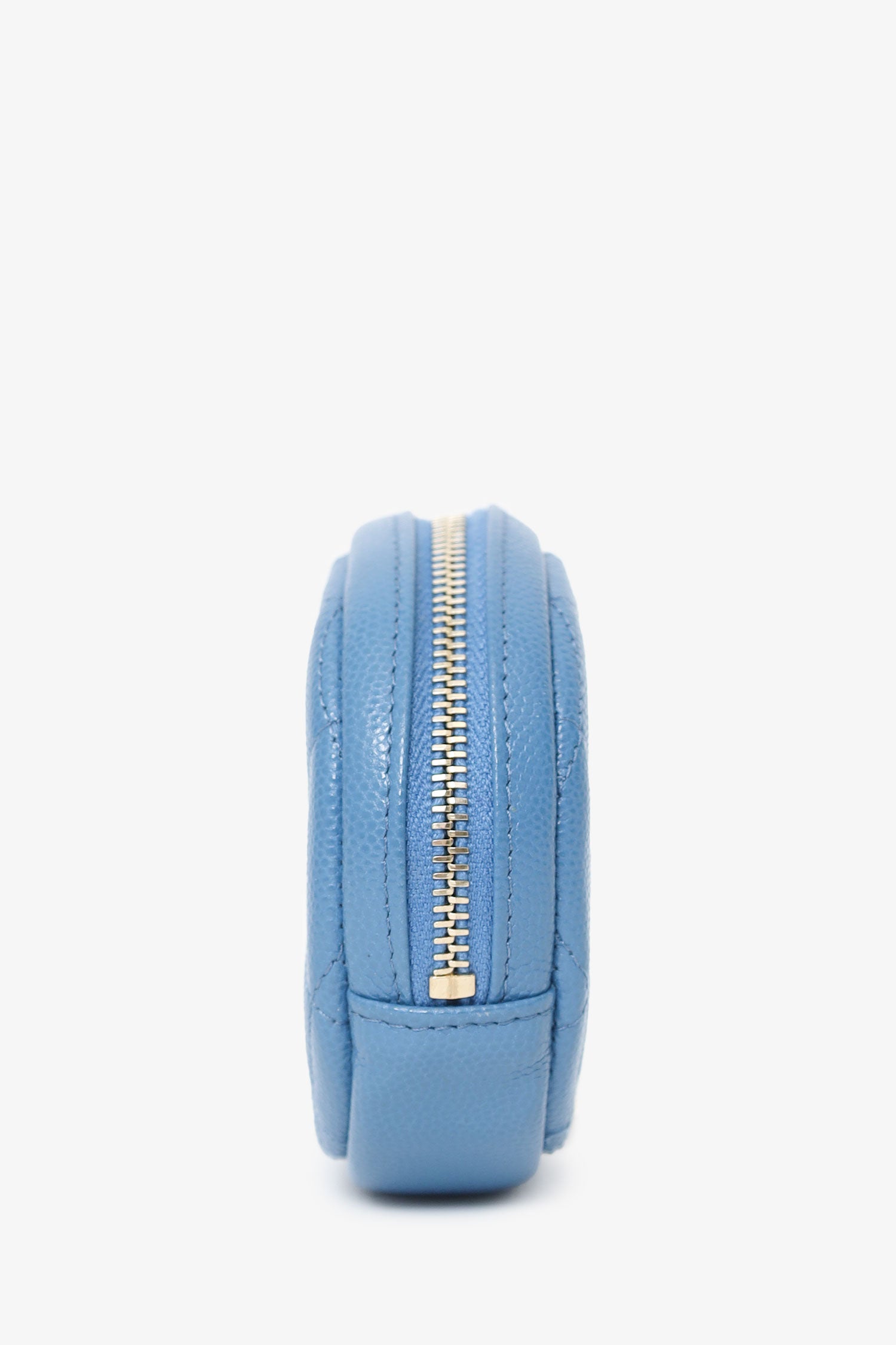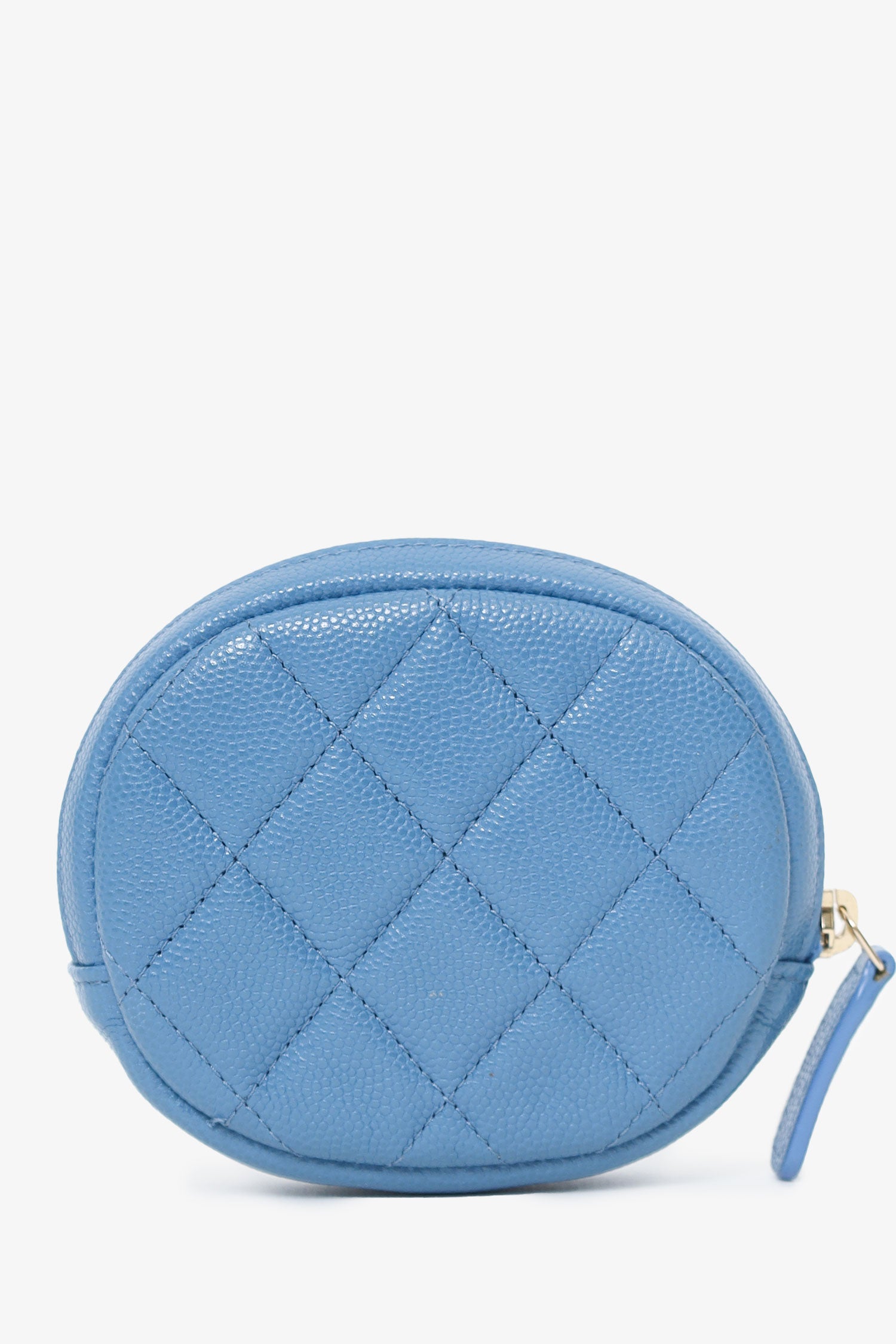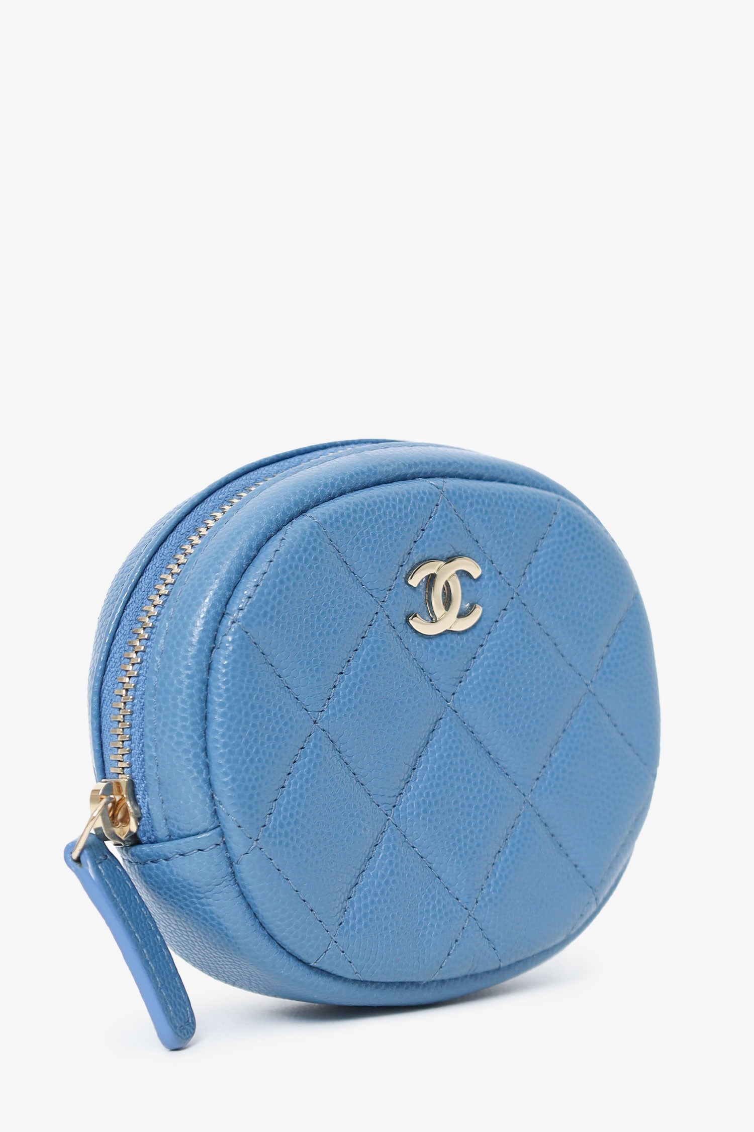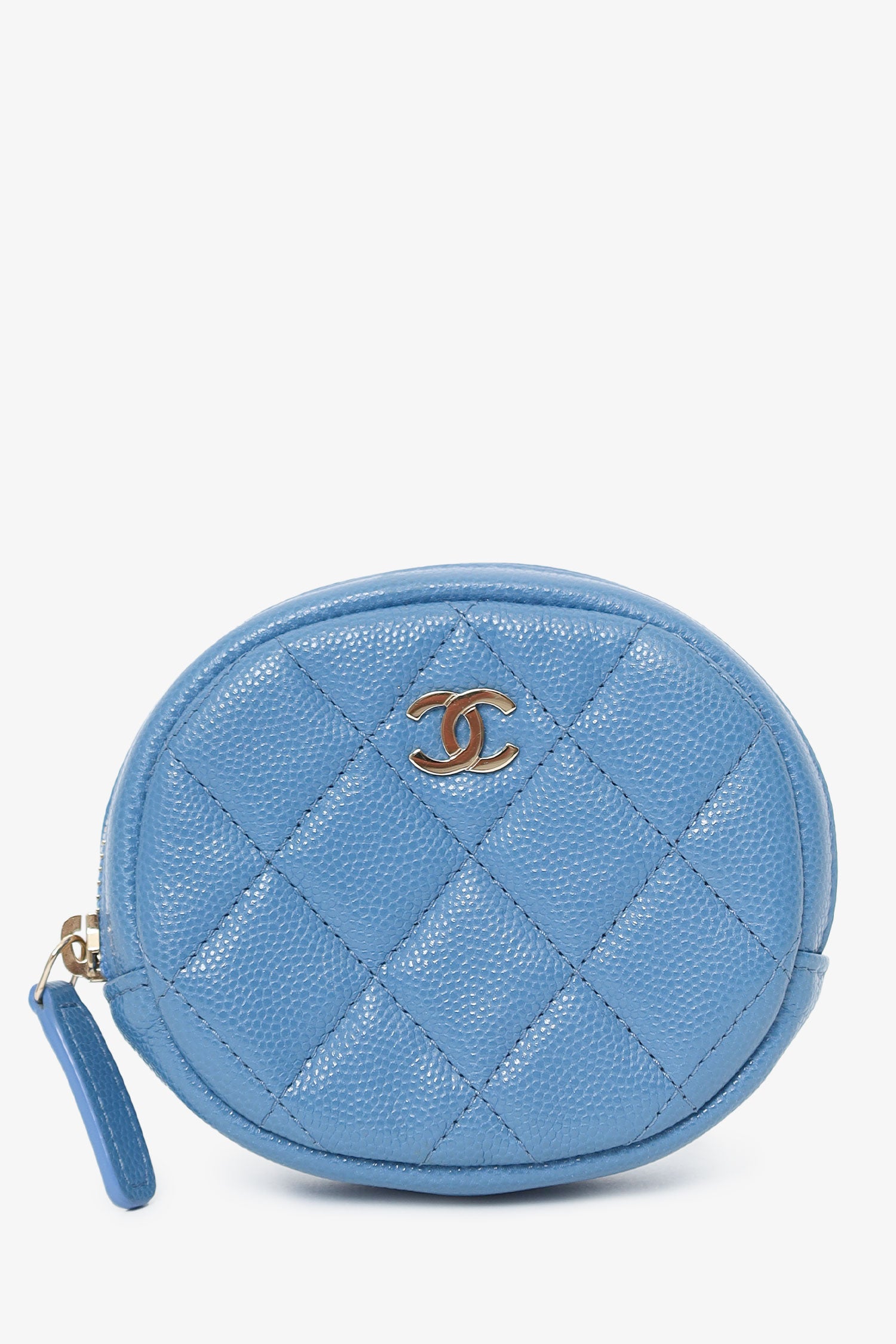 Refresh availabilityPre-Loved Chanel™ 2019 Blue Caviar Leather Round Coin Pouch. Top zip closure. Quilted front and rear. Fabric lined interior. Tonal switching. Gold-tone hardware.
