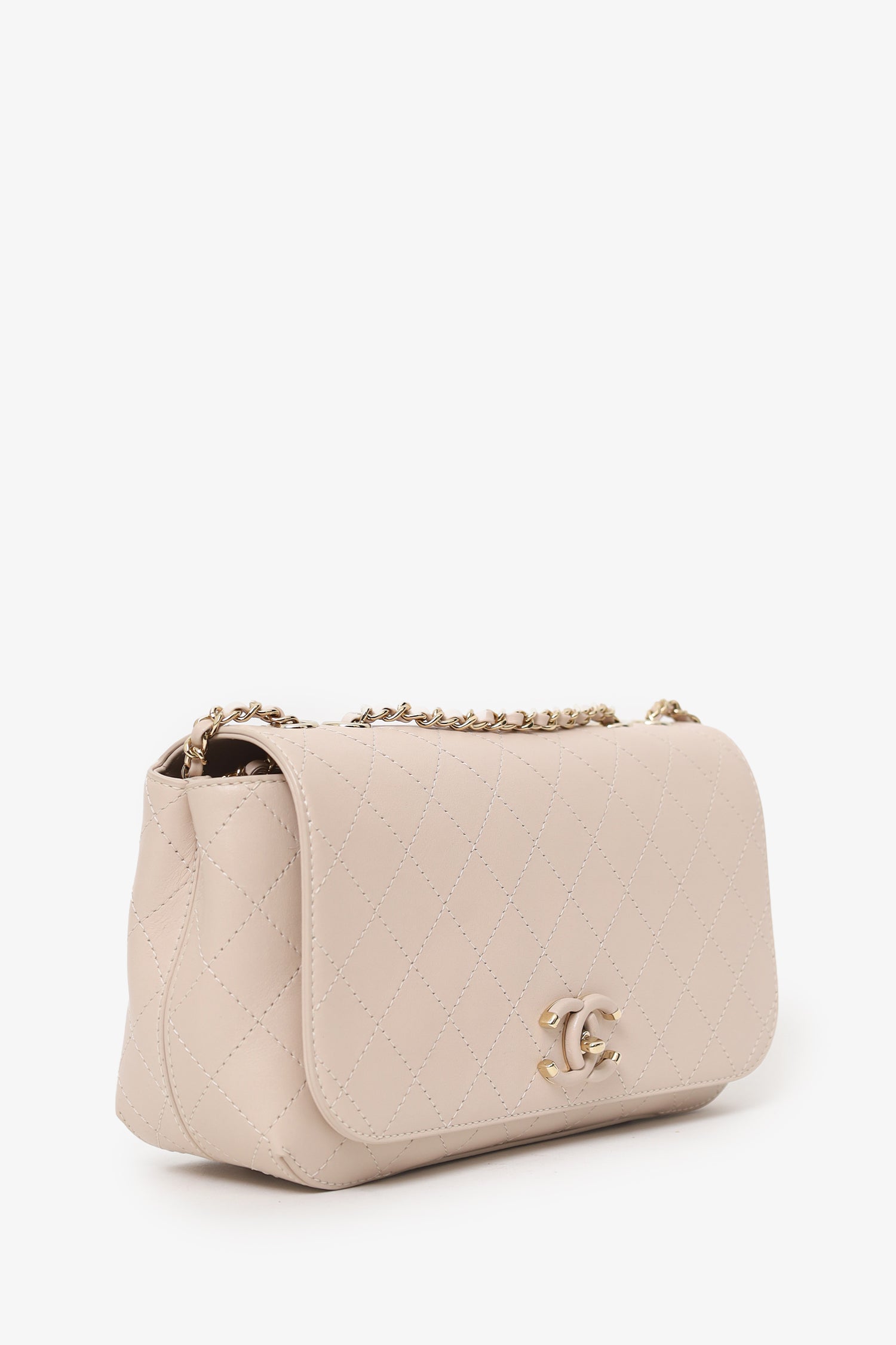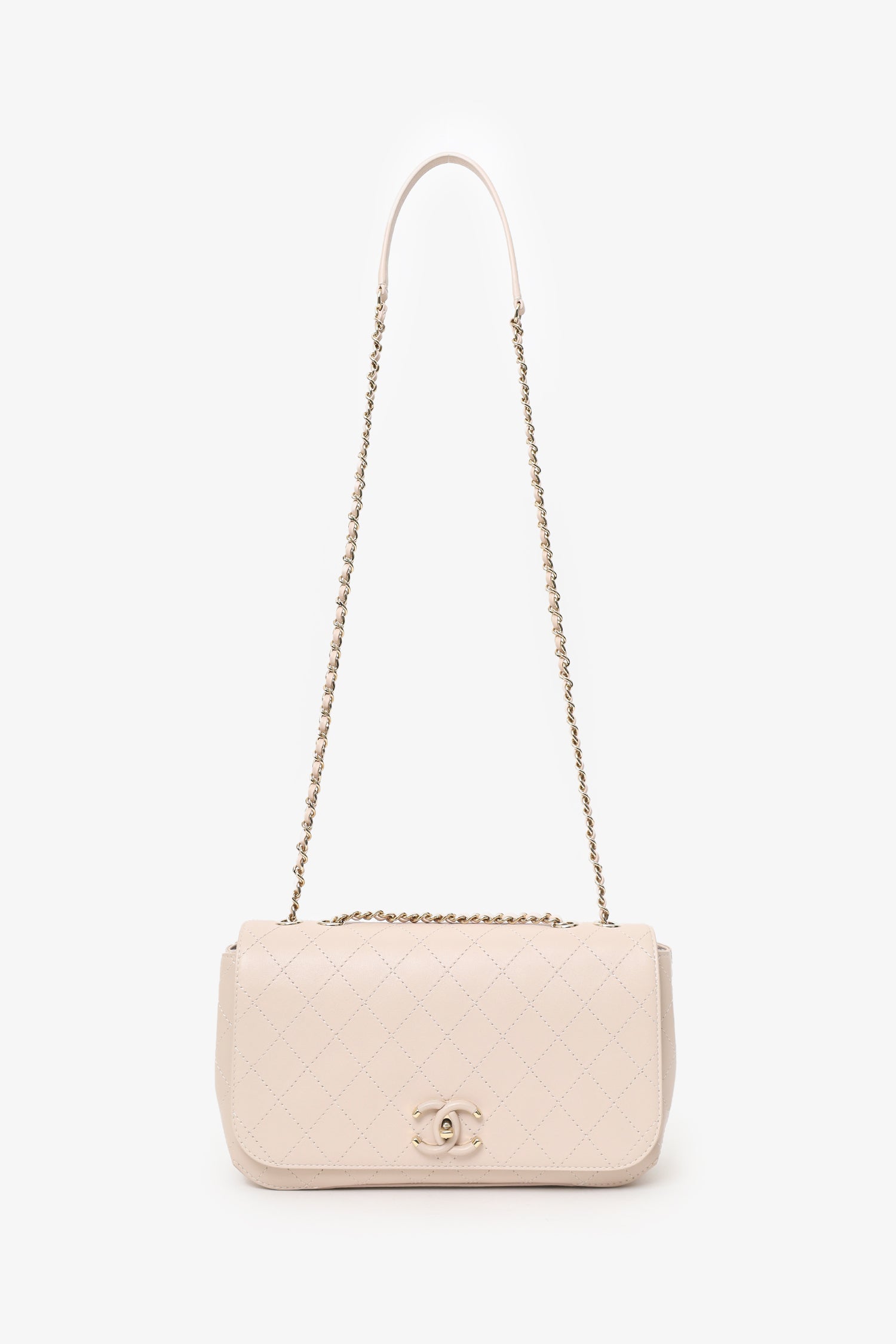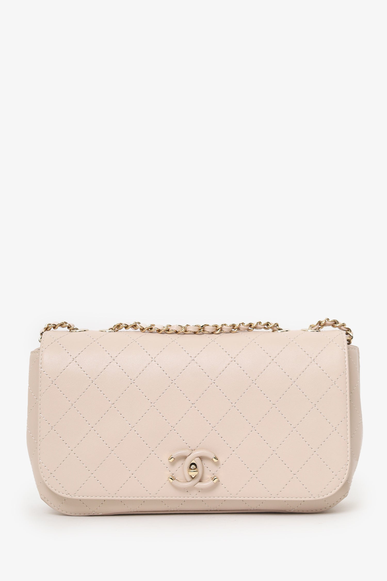 Refresh availabilityPre-Loved Chanel™ 2019 Cream Leather Quilted Flat Bag. Front fold-over-flap with turn-lock closure. Chainlink crossbody strap. Protective base studs. Lined interior with single rear zip pocket. Gold-tone hardware. Tonal stitching.