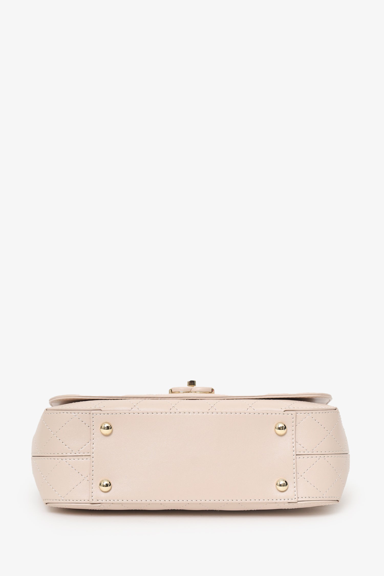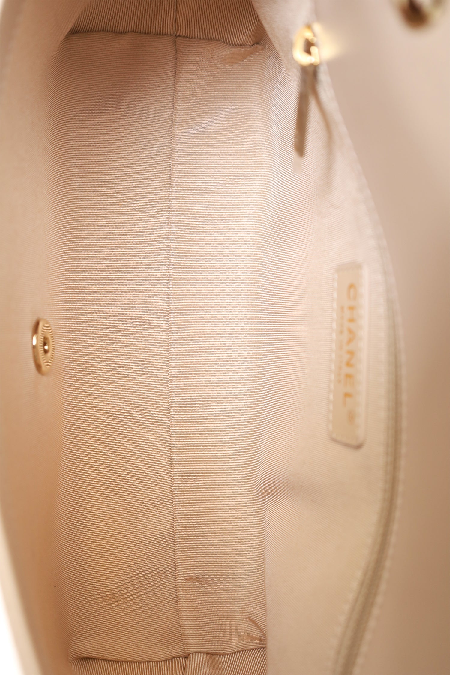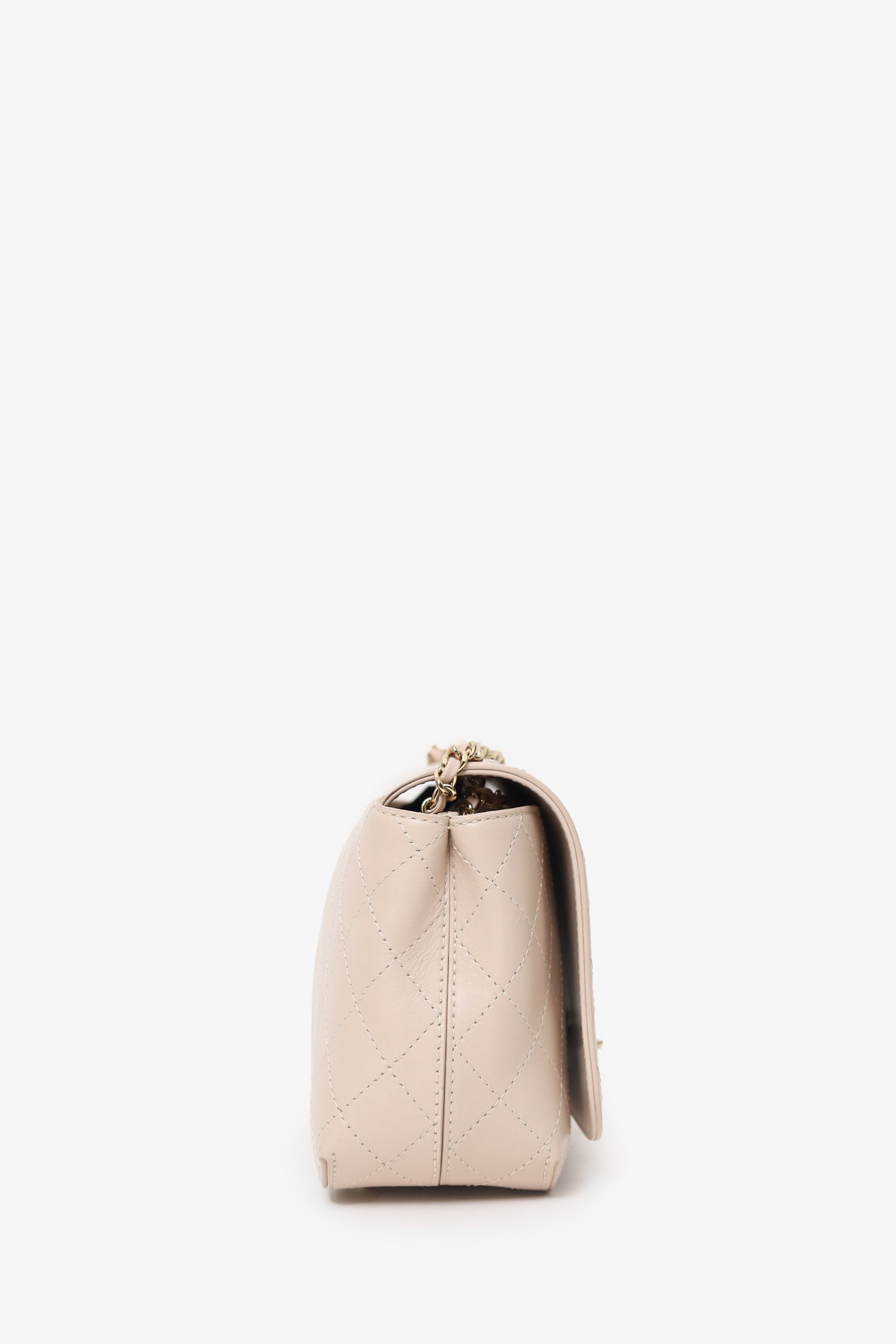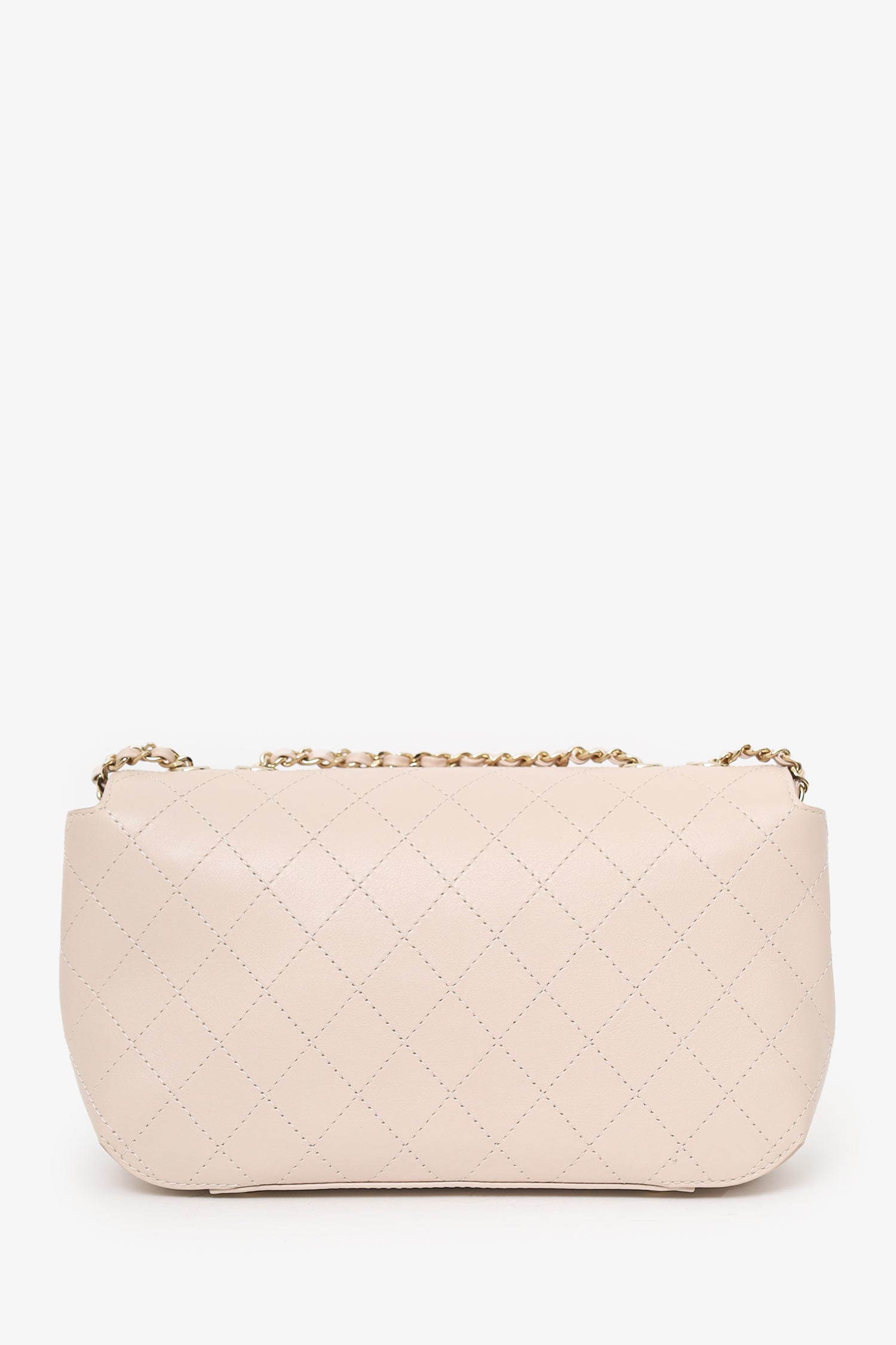 Refresh availabilityPre-Loved Chanel™ 2019 Cream Leather Quilted Flat Bag. Front fold-over-flap with turn-lock closure. Chainlink crossbody strap. Protective base studs. Lined interior with single rear zip pocket. Gold-tone hardware. Tonal stitching.