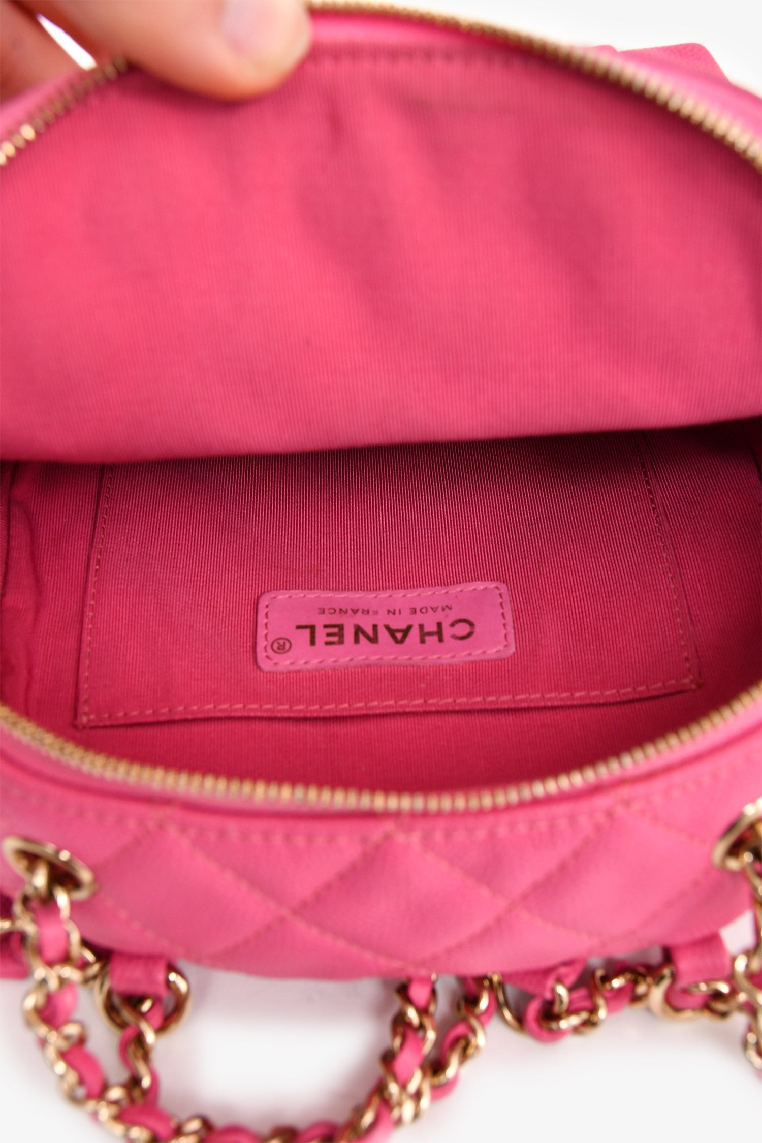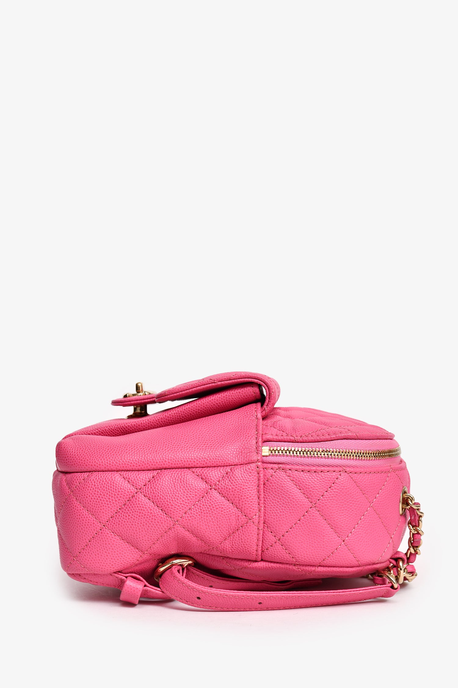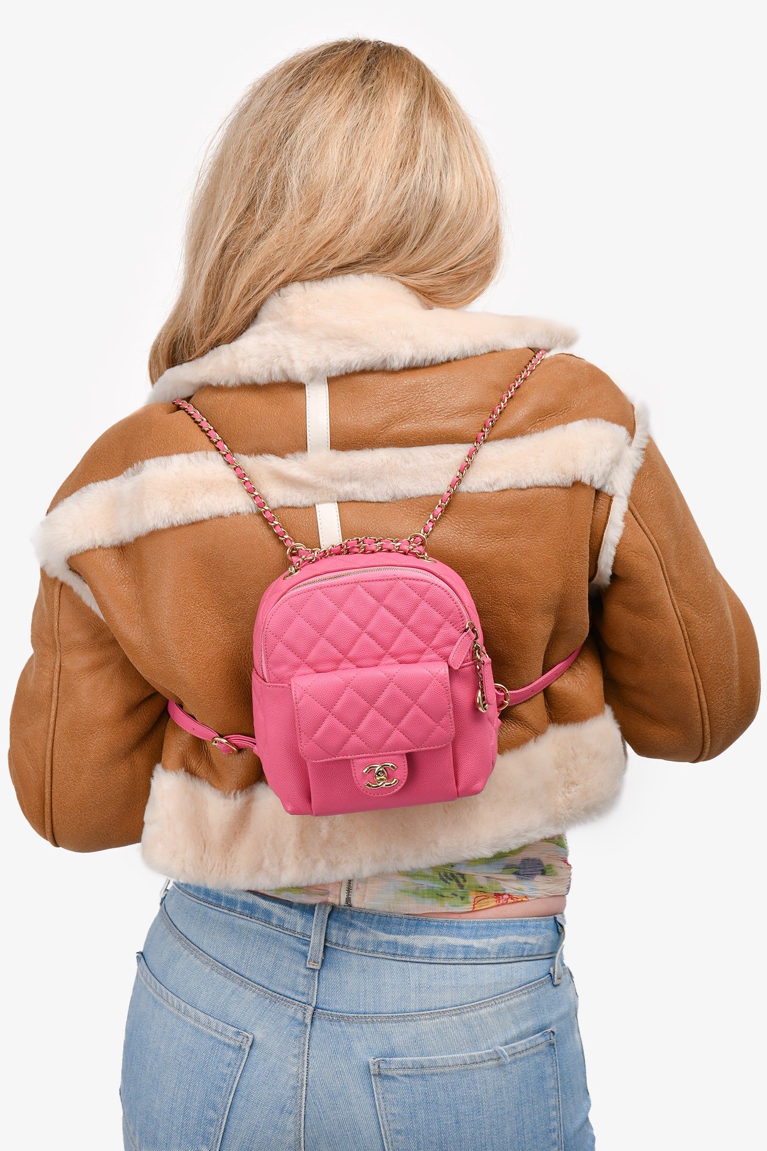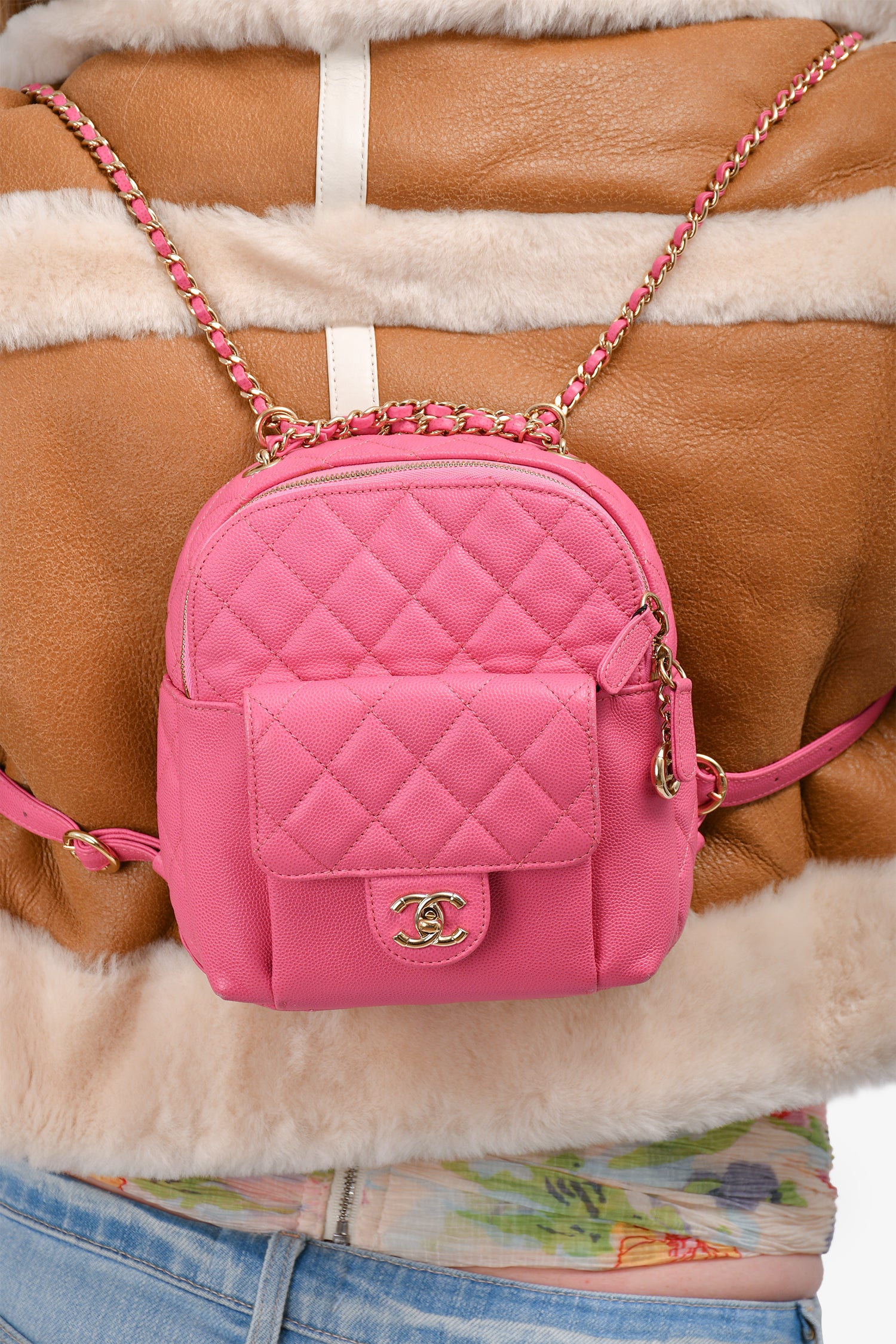 Refresh availabilityPre-Loved Chanel™ 2019 Hot Pink Caviar Leather Mini Chain Backpack. Tonal stitching. Front fold-over flap with a turn-lock closure. Chain-link straps with leather accents. Interior slip pocket.