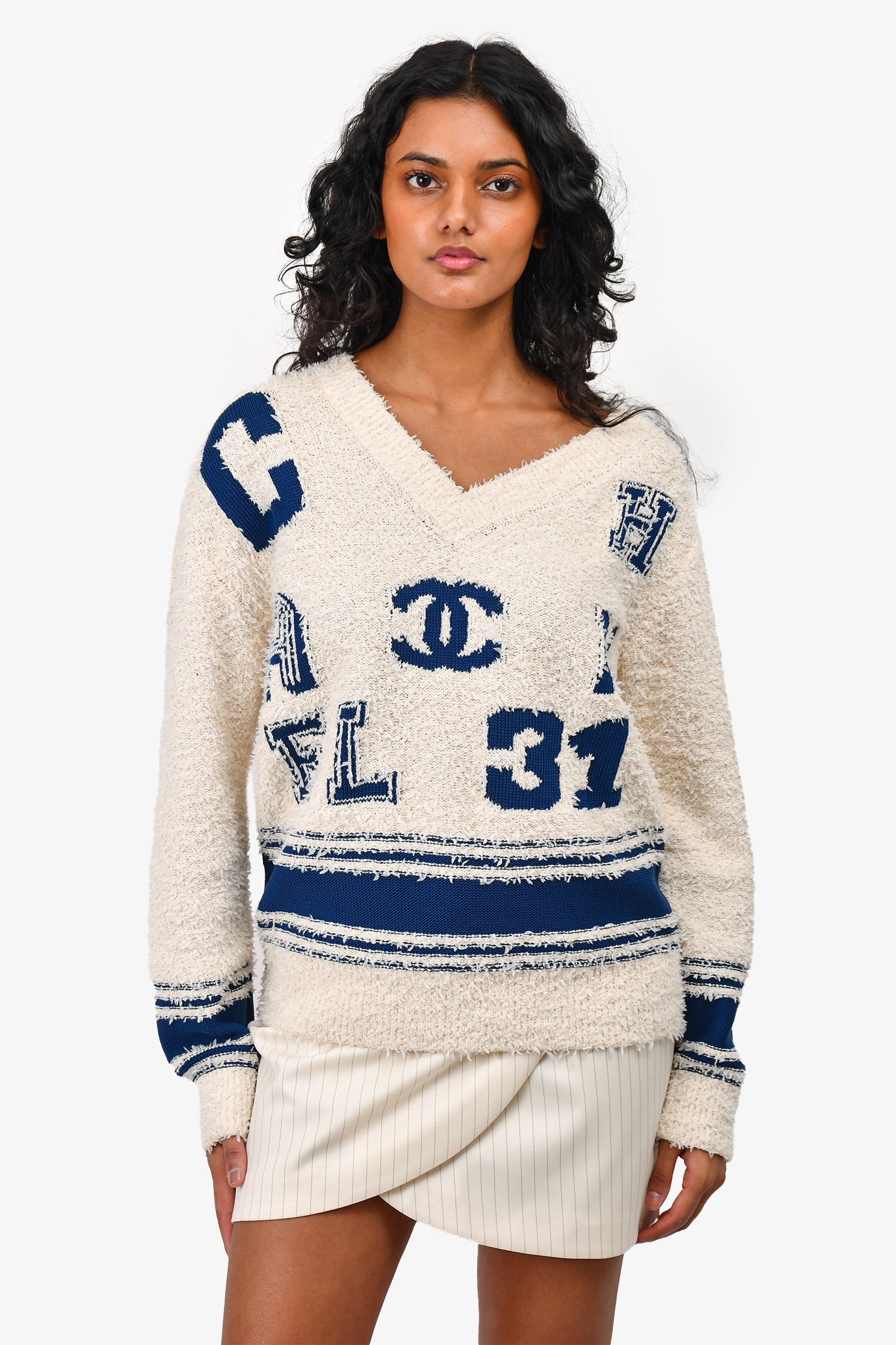 Refresh availabilityPre-Loved Chanel™ 2019 White/Blue Cotton/Silk Varsity Logo Sweater. Round neck. Pull on. Knitted details throughout item. Ribbed collar, sleeves and hem. Unlined. Tonal stitching.