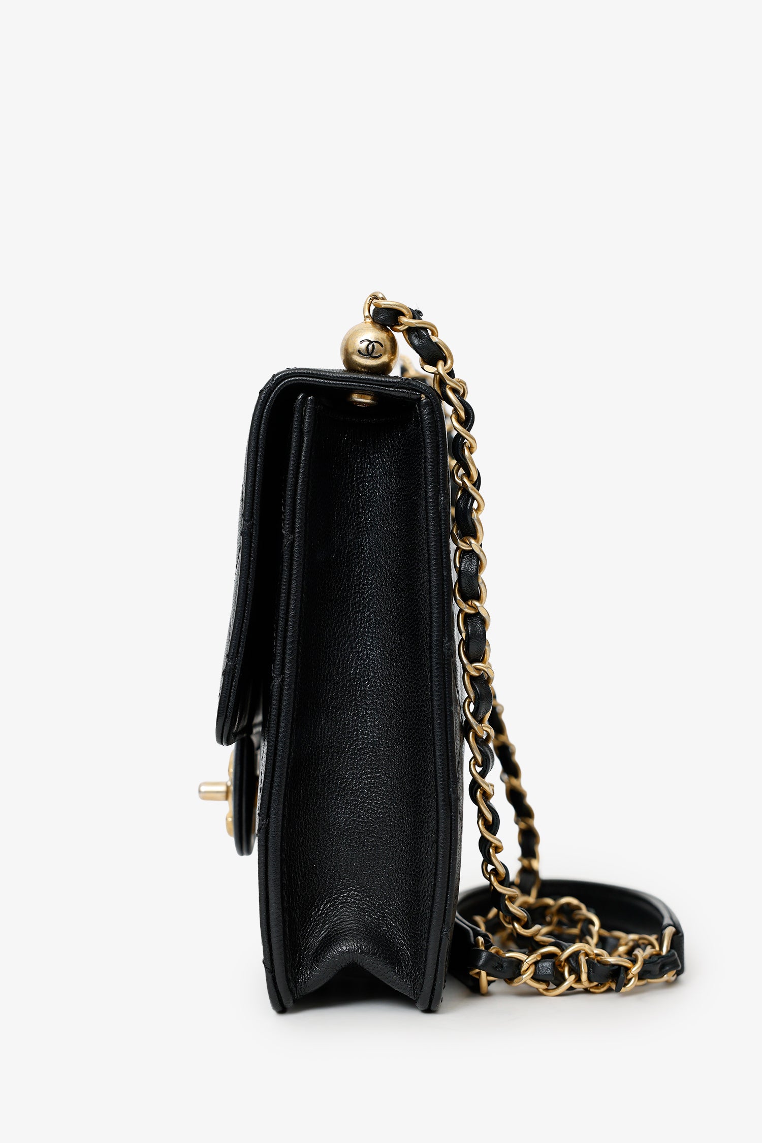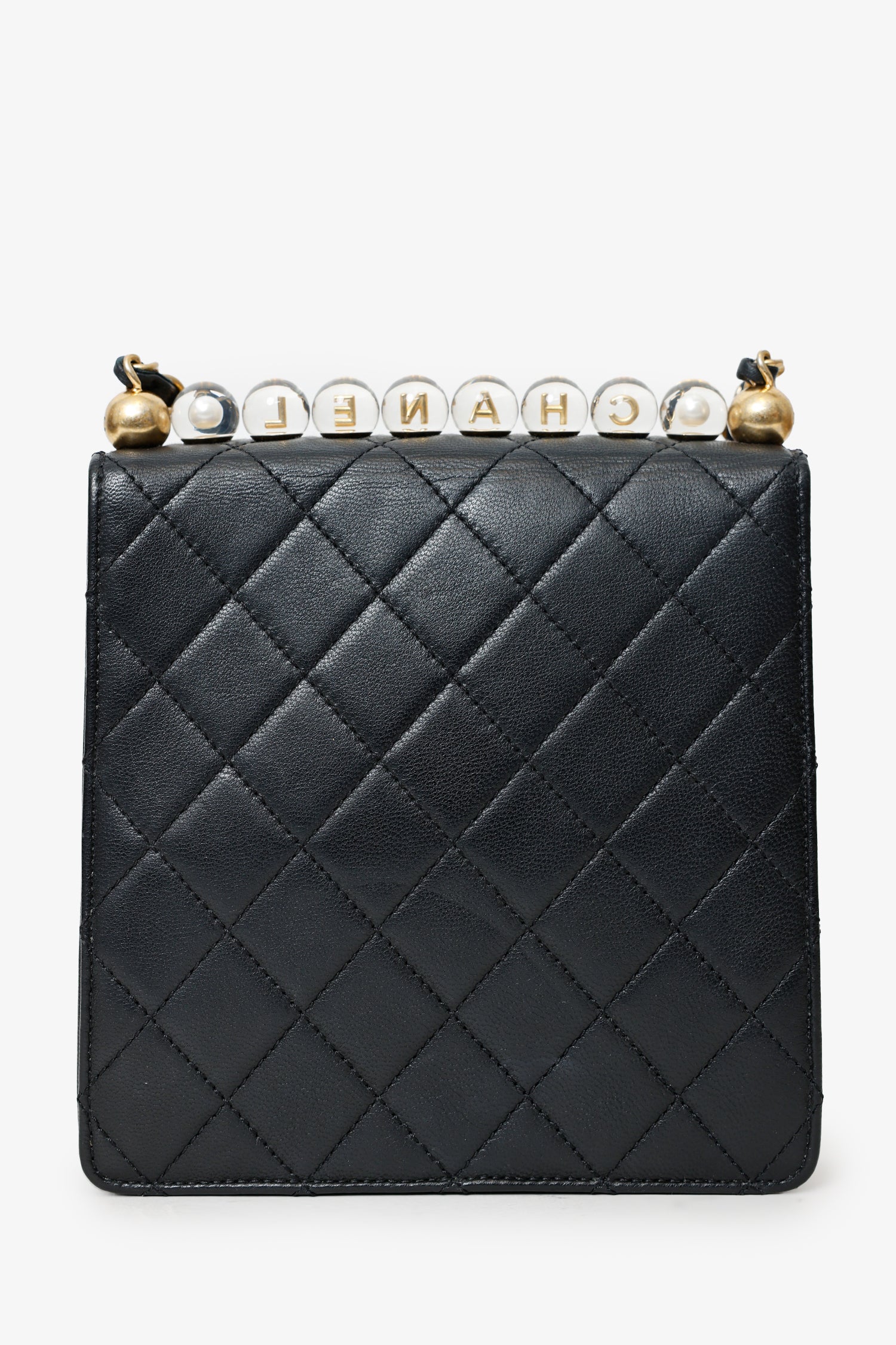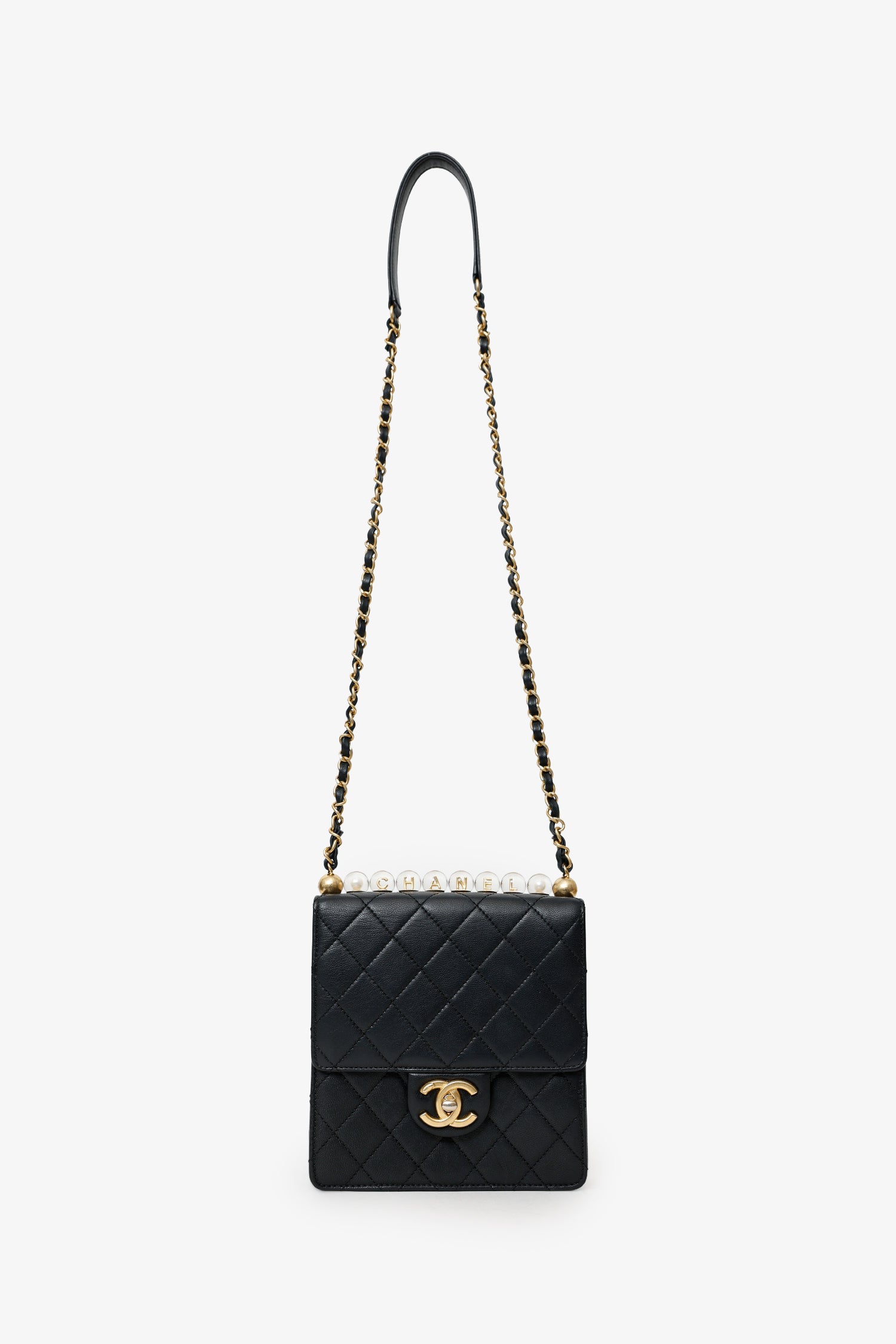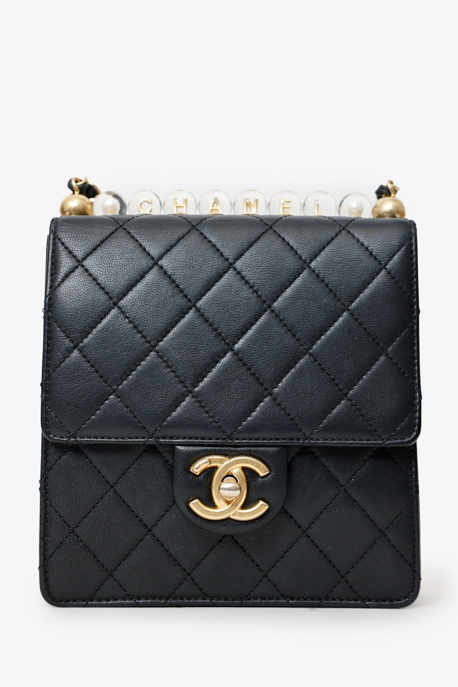 2019-20 Black Quilted Goatskin Mini Chic Pearls Flap Bag. Front fold-over flap with turn lock closure. Crossbody chainlink and leather strap. Lined interior. 2 interior wall slip pockets.