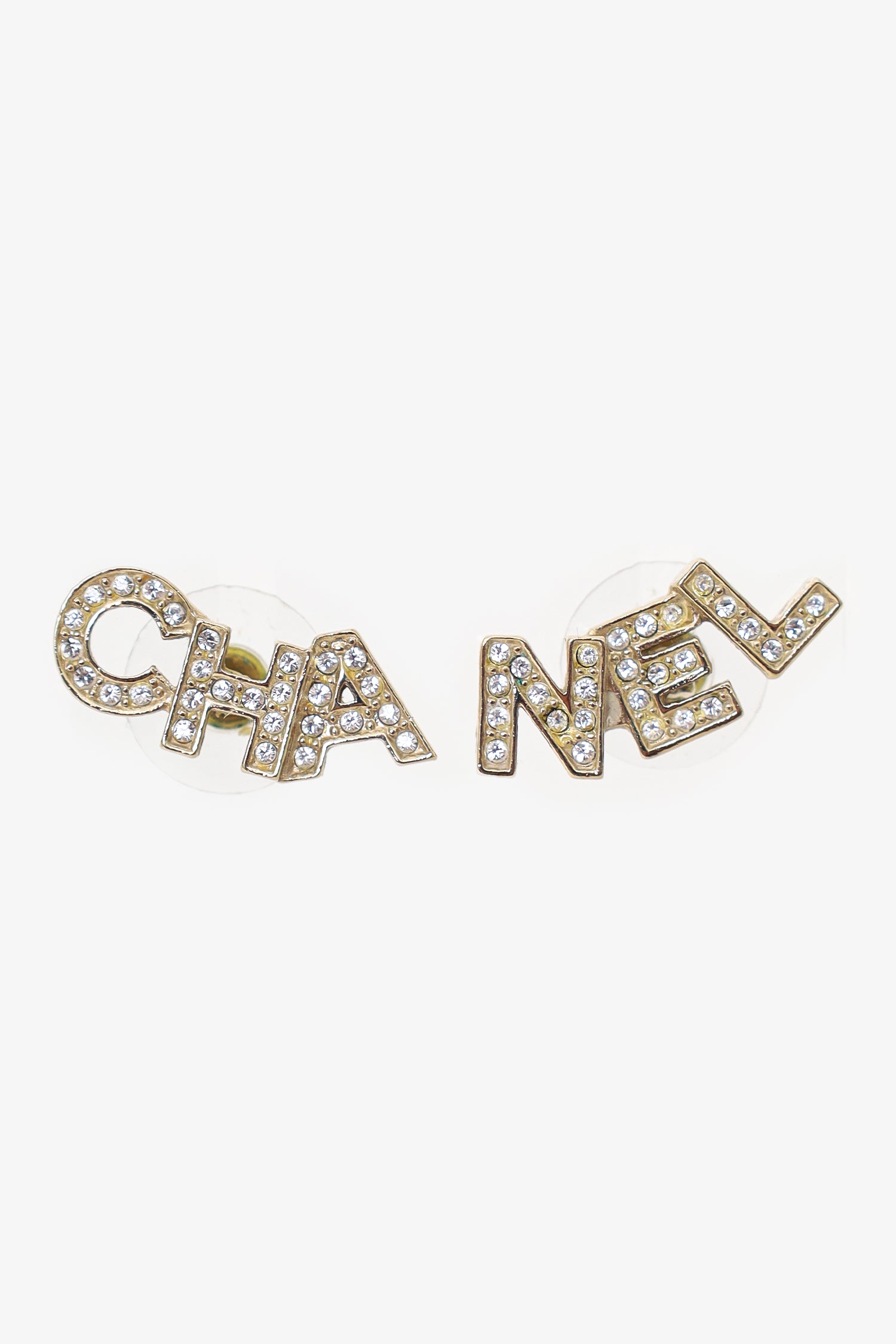 Refresh availabilityPre-Loved Chanel™ 2020 Gold Tone Crystal Logo Letter Stud Earring. Clear push-pin backing. Gold-tone hardware.