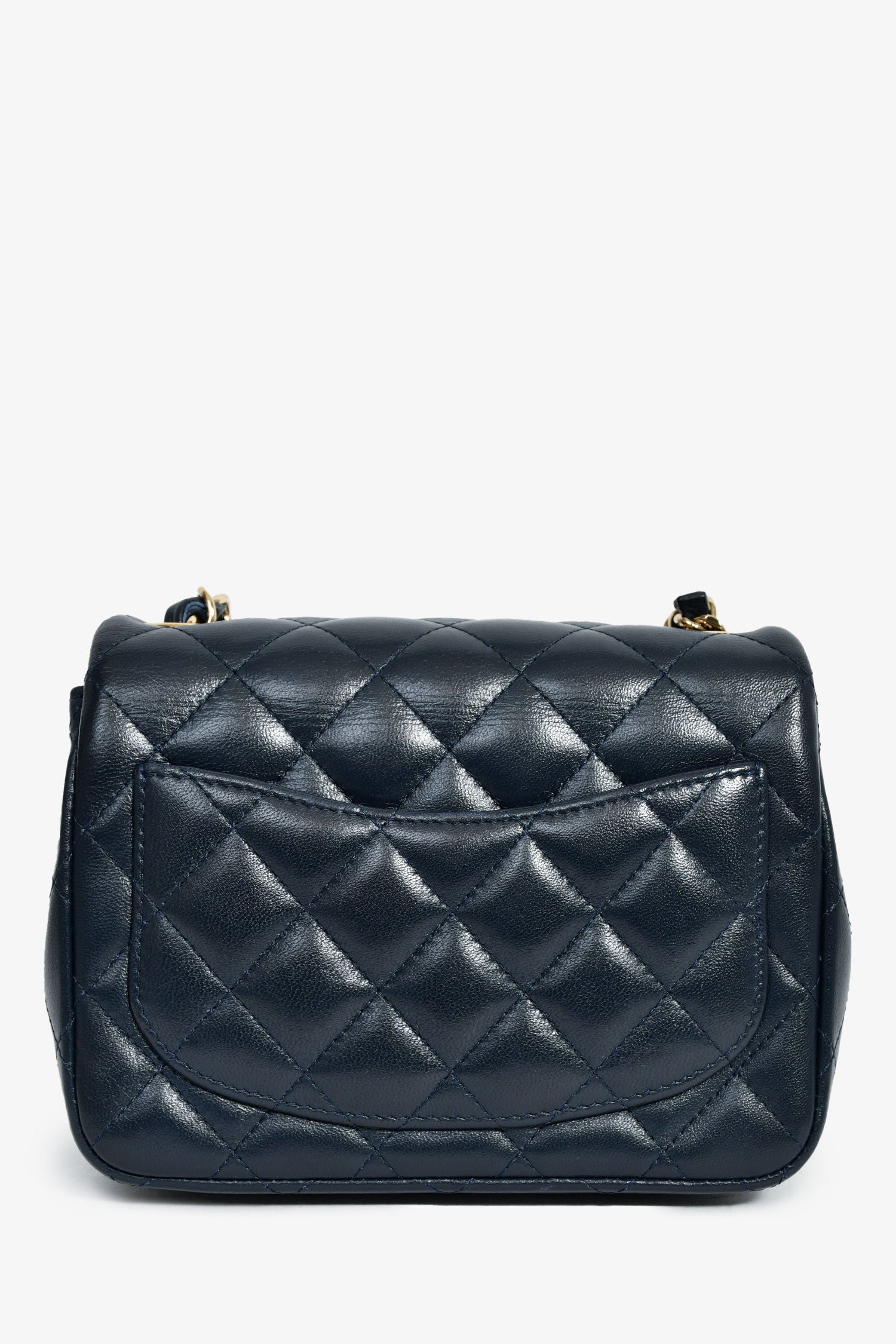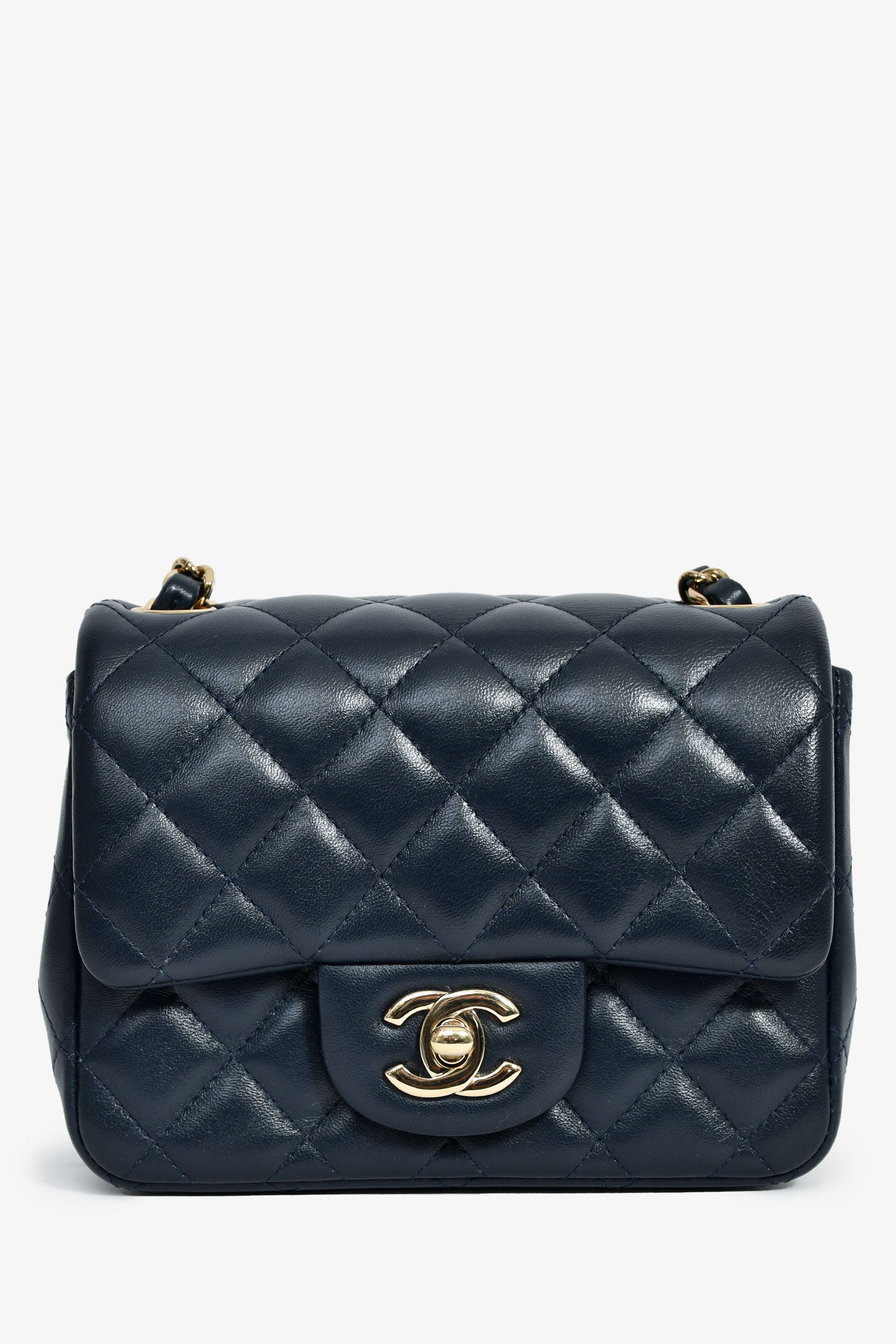 Pre-Loved Chanel™ 2020 Navy Lambskin Mini Square Flap Crossbody. Front fold-over flap with a turn-lock closure. Chain-link and leather crossbody strap. Leather lined interior with 1 slip and 1 zip pocket. Silver-tone hardware. Tonal stitching.