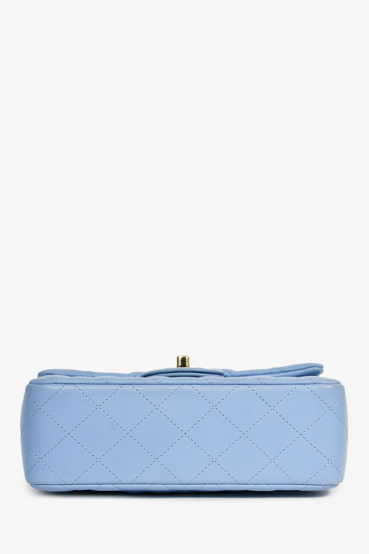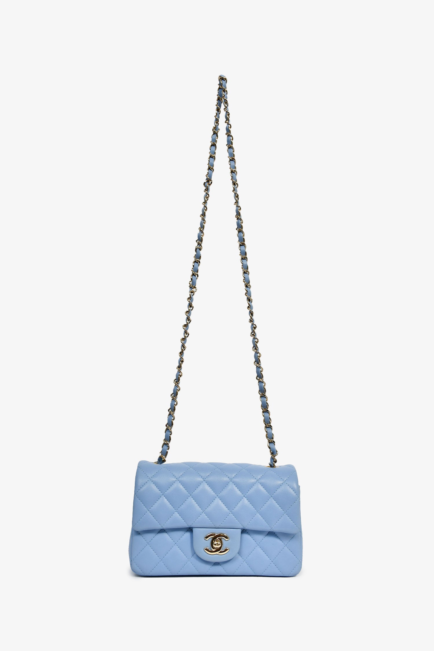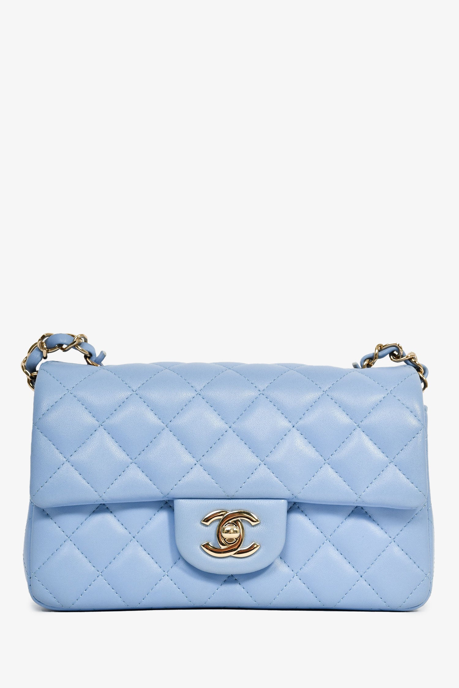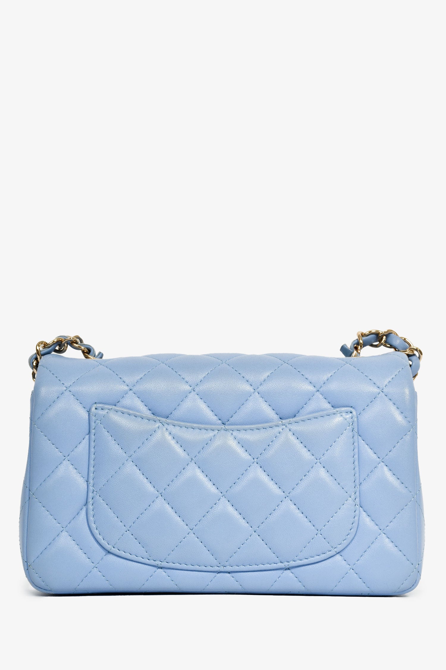 Refresh availabilityPre-Loved Chanel™ 2020 Sky Blue Lambskin Mini Rectangle Flap Bag. Front fold-over flap with turn-lock closure. Exterior rear wall slip pocket. Single interior compartment with a wall slip and zip pocket. Tonal leather lining. Gold-tone hardware. Tonal stitching.