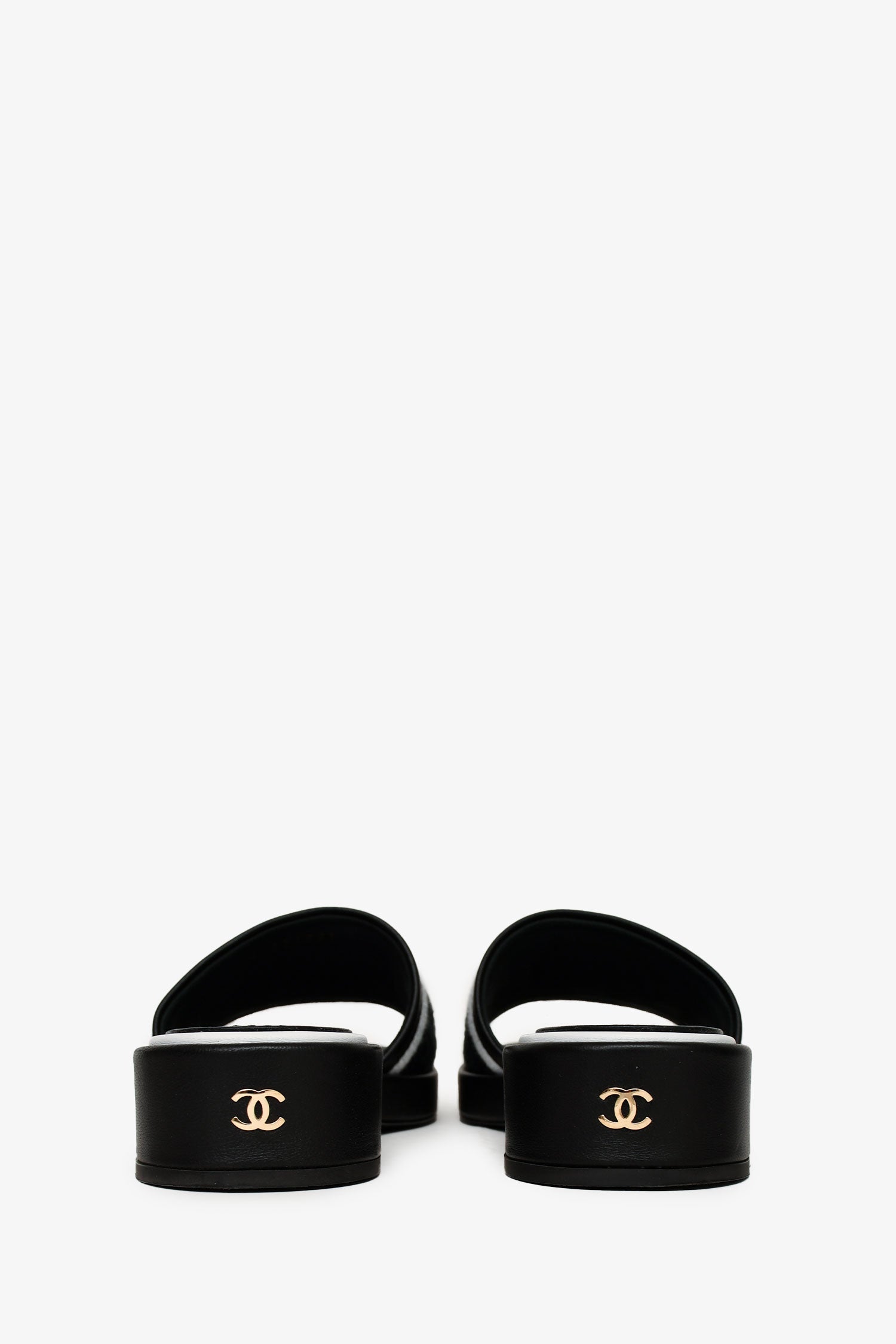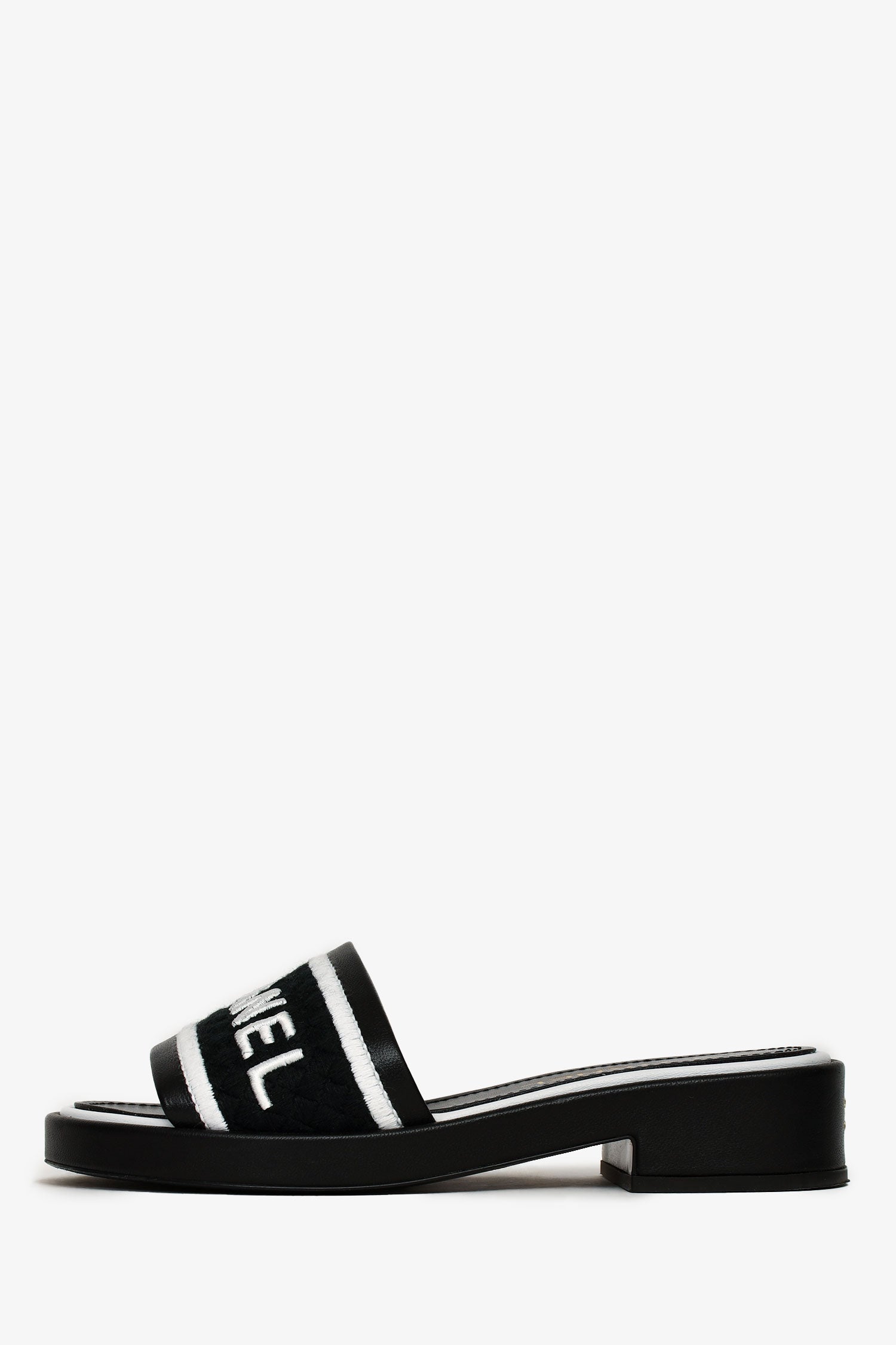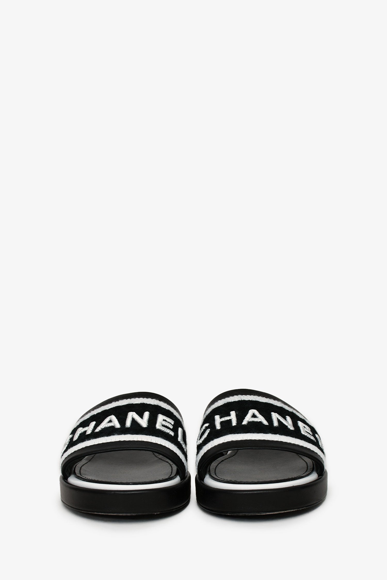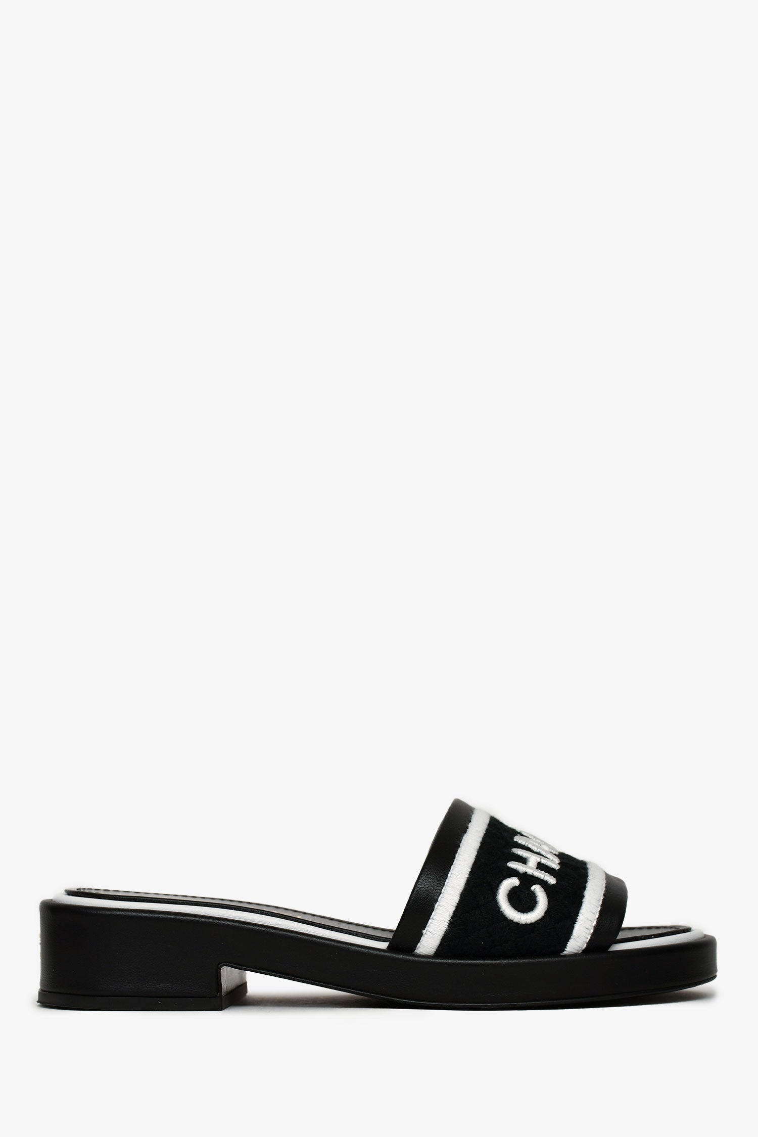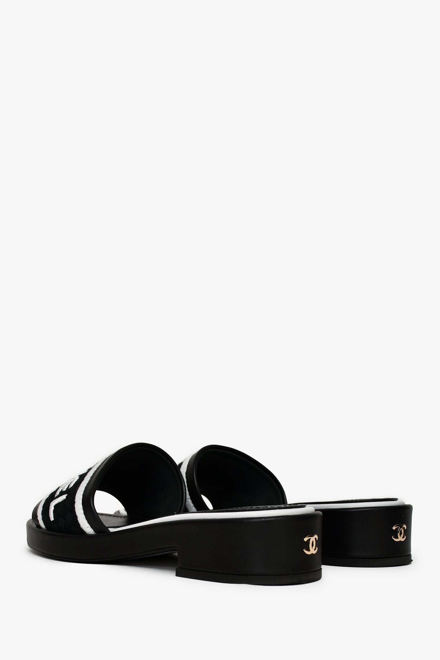 Pre-Loved Chanel™ 2021 Black/White Lambskin Interlocking CC Logo Embroidered Slides Size 37