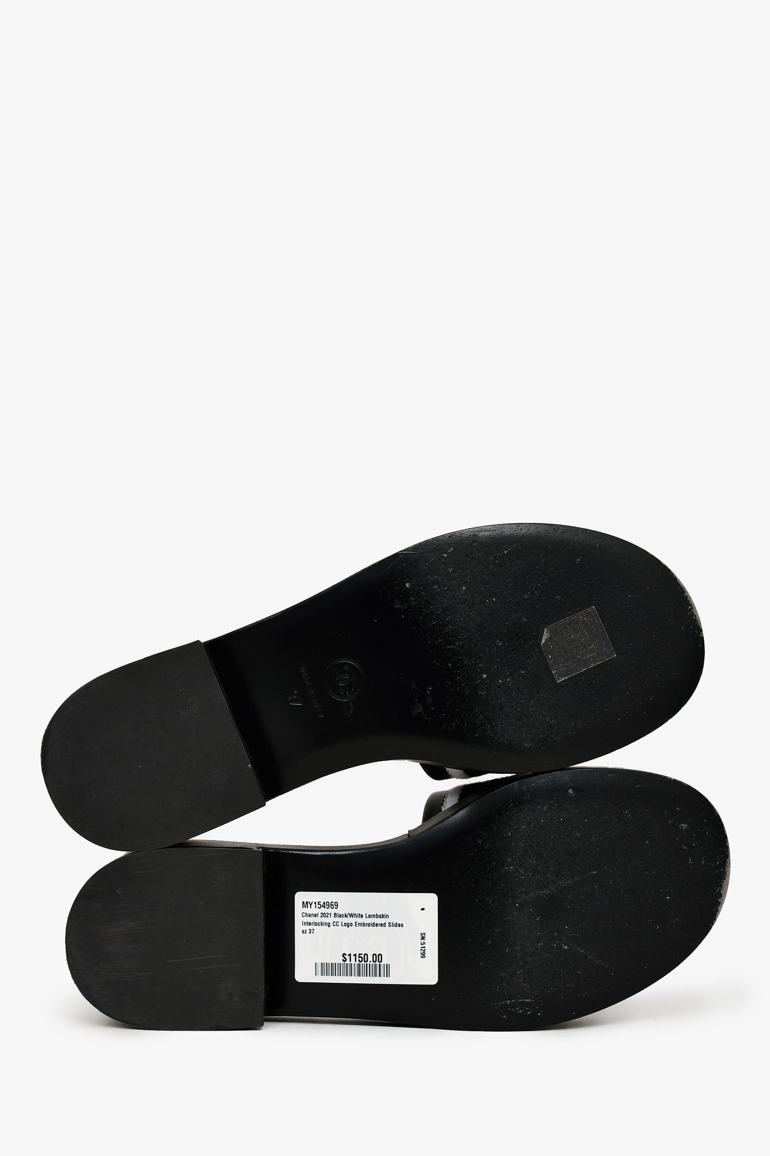 Refresh availabilityPre-Loved Chanel™ 2021 Black/White Lambskin Interlocking CC Logo Embroidered Slides. Open toe. Slip-on style. Embroidered logo at front. Leather sole. Tonal stitching. Comes with dust bag and box.