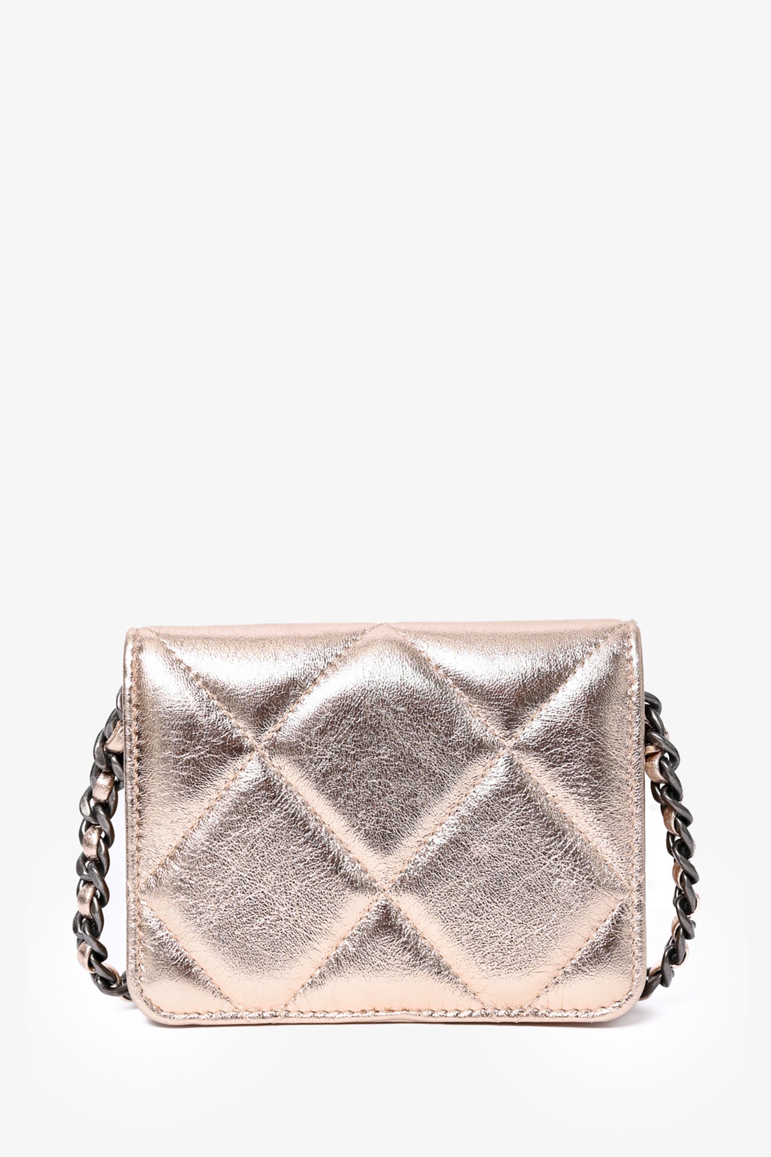 Refresh availabilityPre-Loved Chanel™ 2021 Gold Lambskin 19 Coin Pouch On Chain. Tonal stitching. Antiquated hardware. Chain-link shoulder strap. Magnetic snap closure. Canvas lined interior.