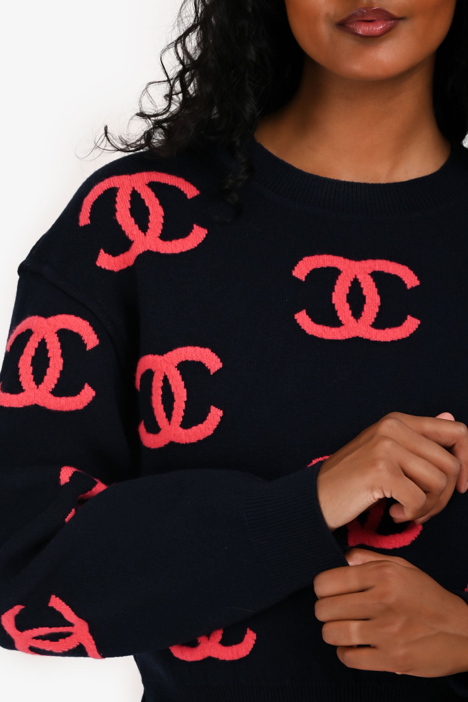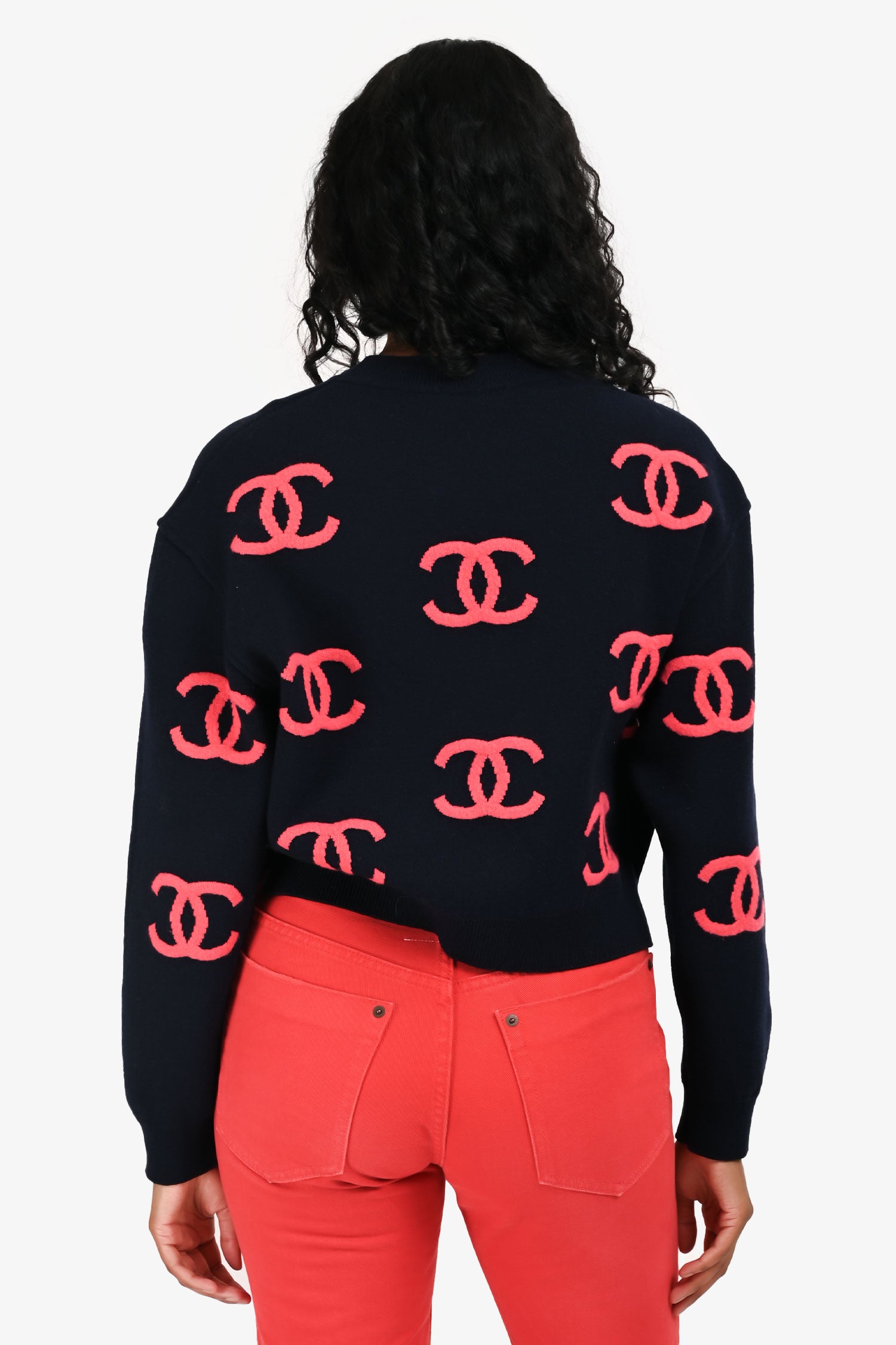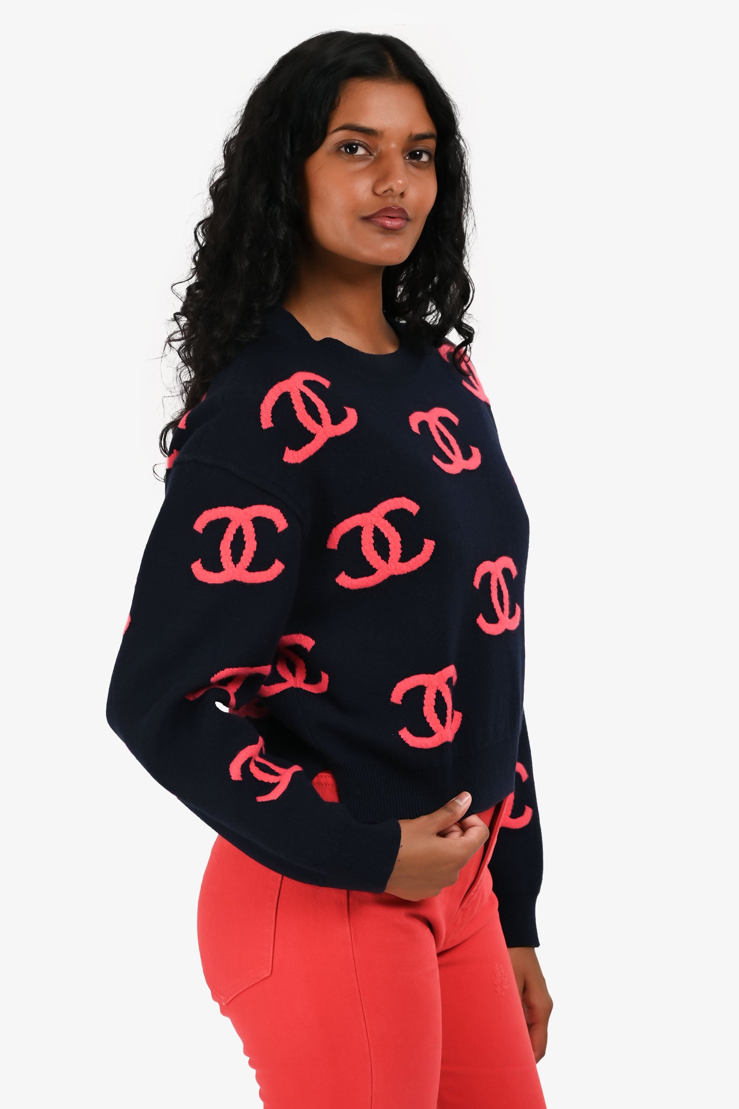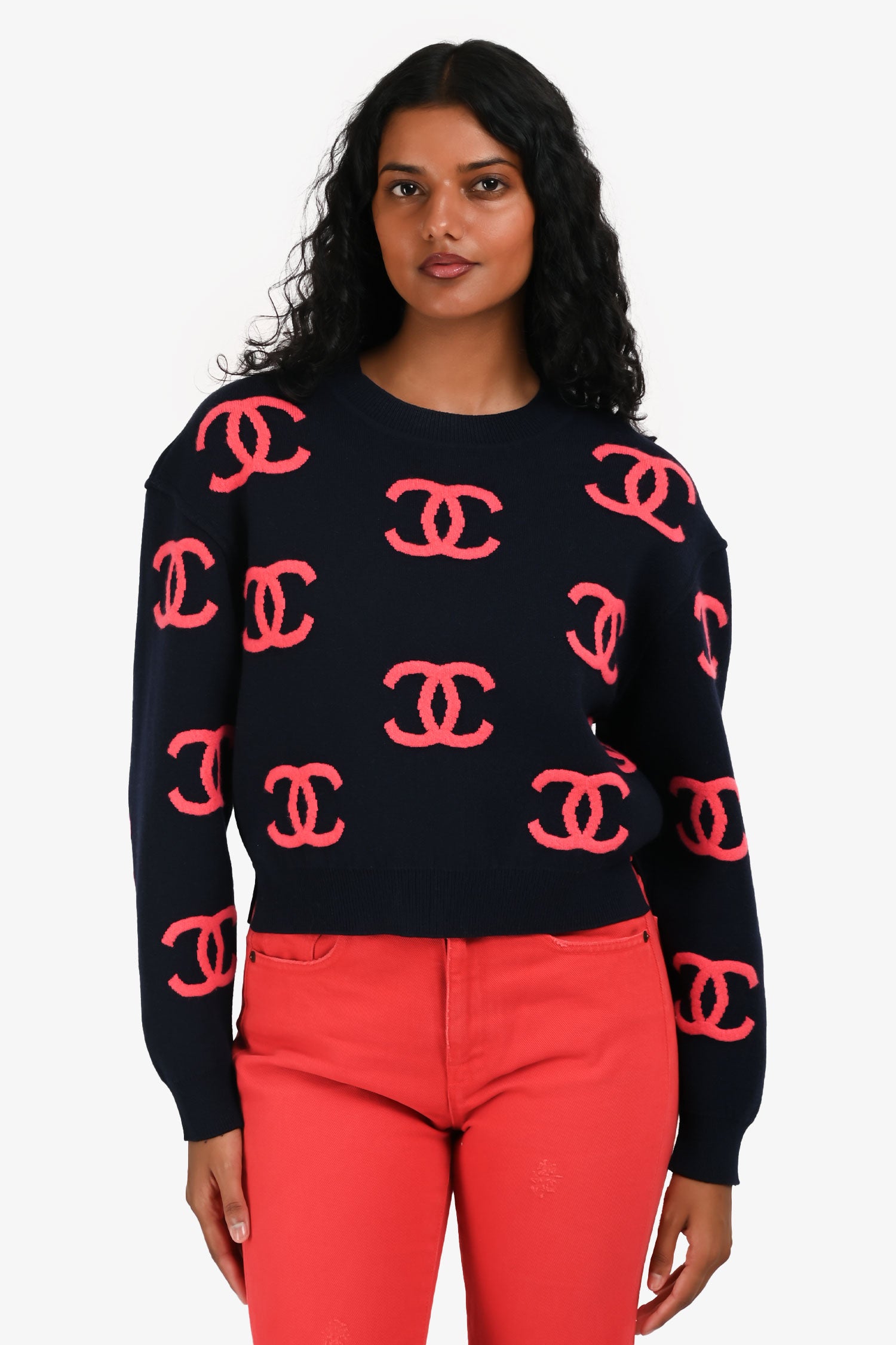 Refresh availabilityPre-Loved Chanel™ 2021 Navy Cashmere Cropped Pink CC Logo Sweater. Round neck. Pull-on. Ribbed neck, cuffs and hem.