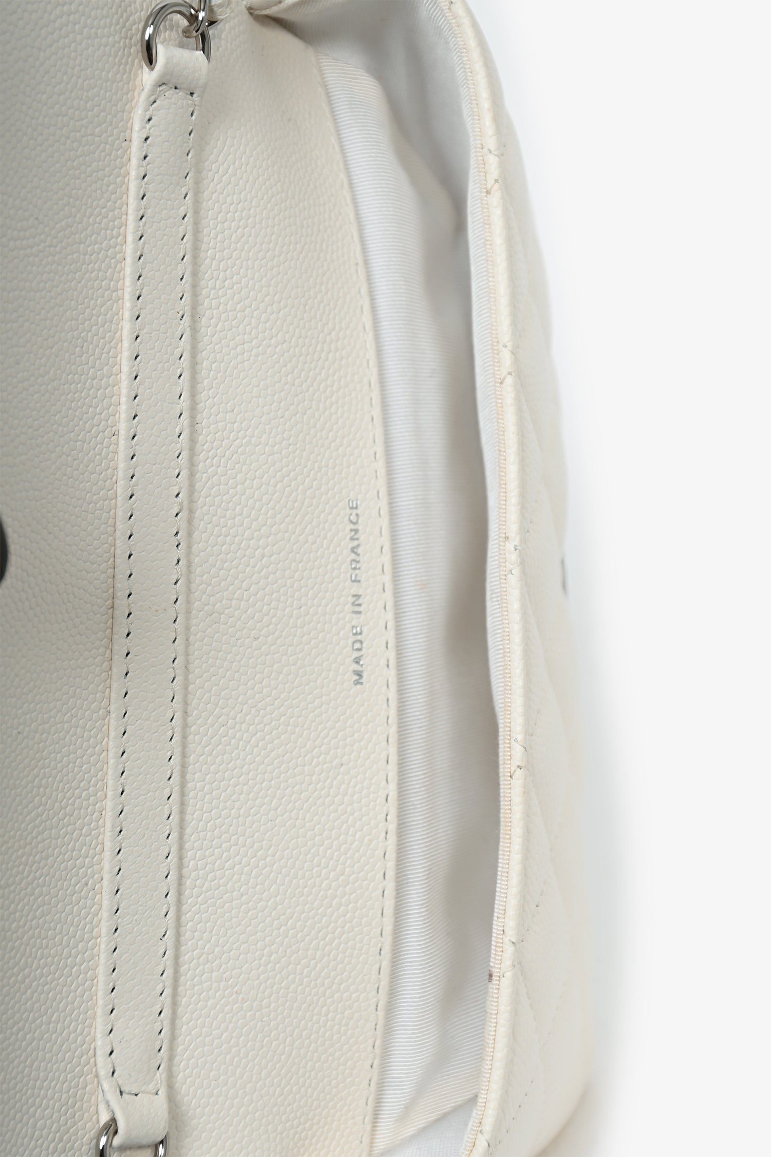 Refresh availabilityPre-Loved Chanel™ 2021 White Caviar Leather Sunglass Case with Chain. Front fold-over flap with magnetic button closure. Tonal textile interior lining. Open interior. Silver-tone hardware. Outer slip pocket.