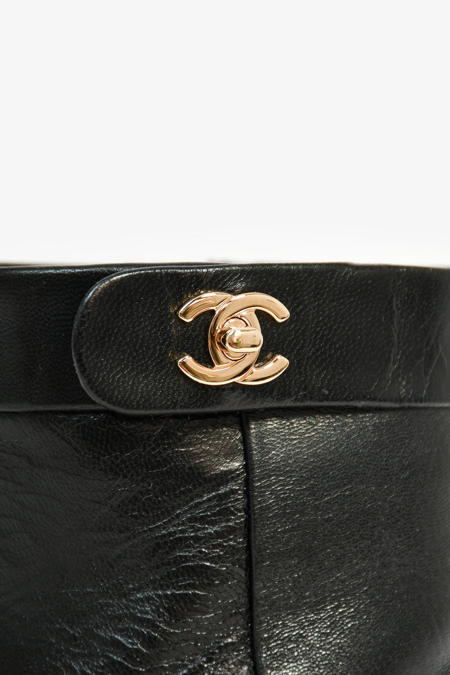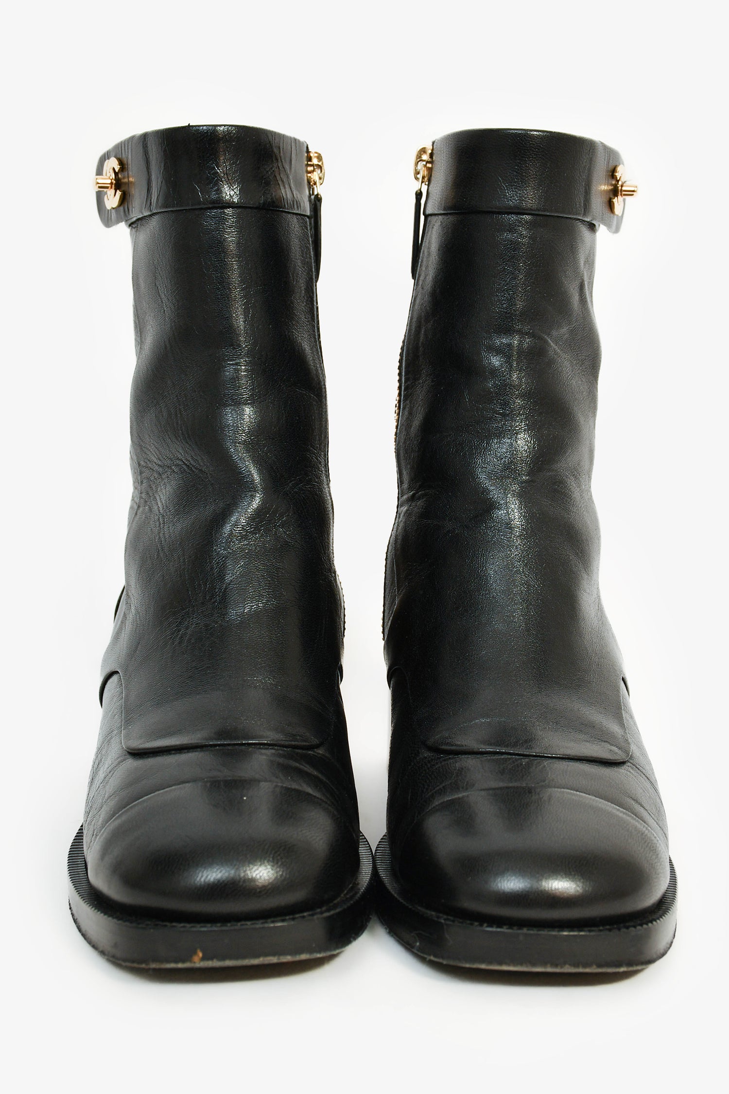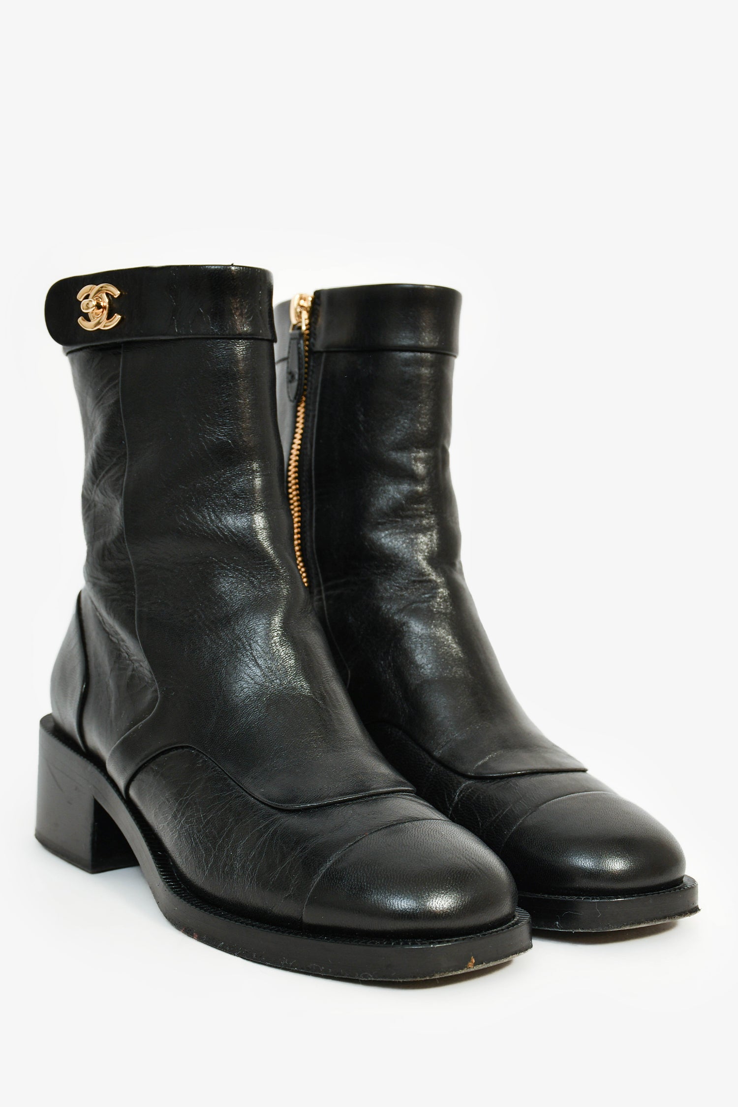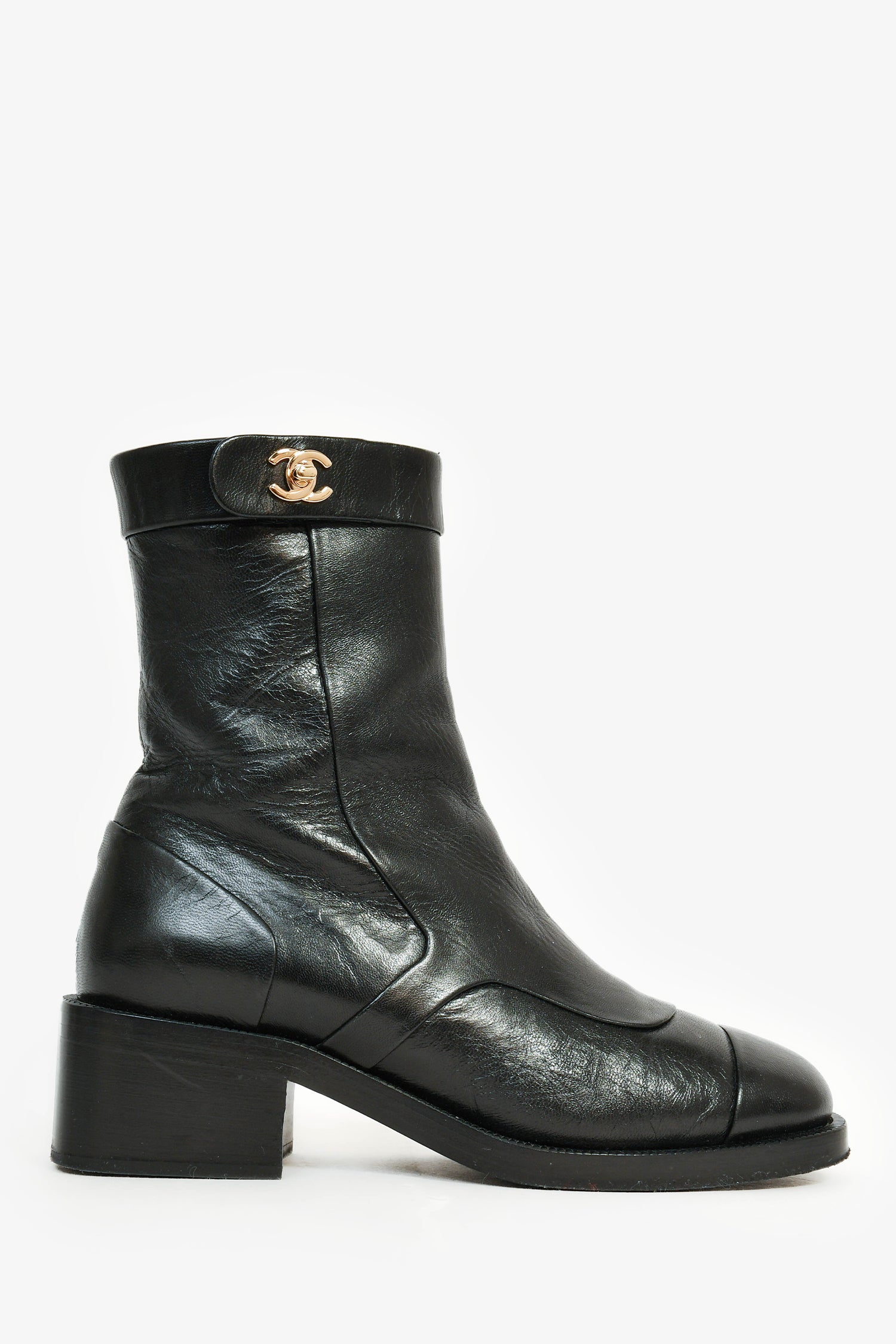 Refresh availabilityPre-Loved Chanel™ 2022 Black Calfskin Leather Moto Boots. Gold-tone hardware. Leather leg strap with a turn-lock closure. Leather toe cap. Block heel. Round toe. Tonal stitching.