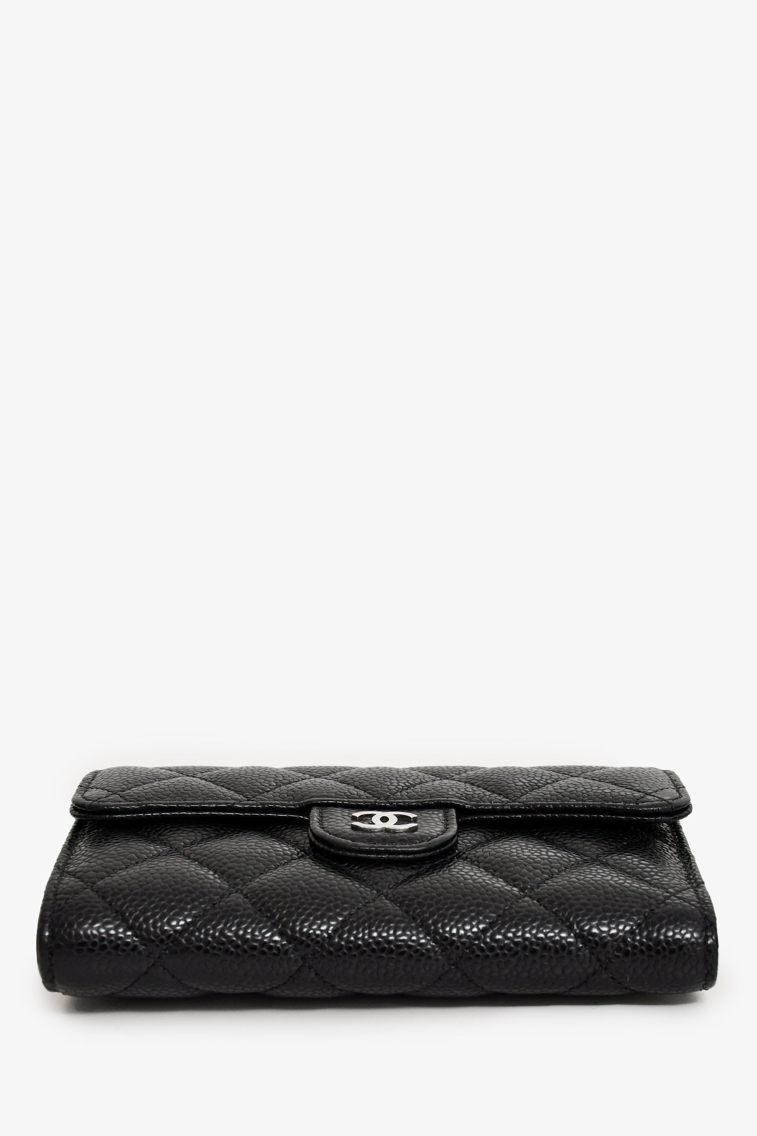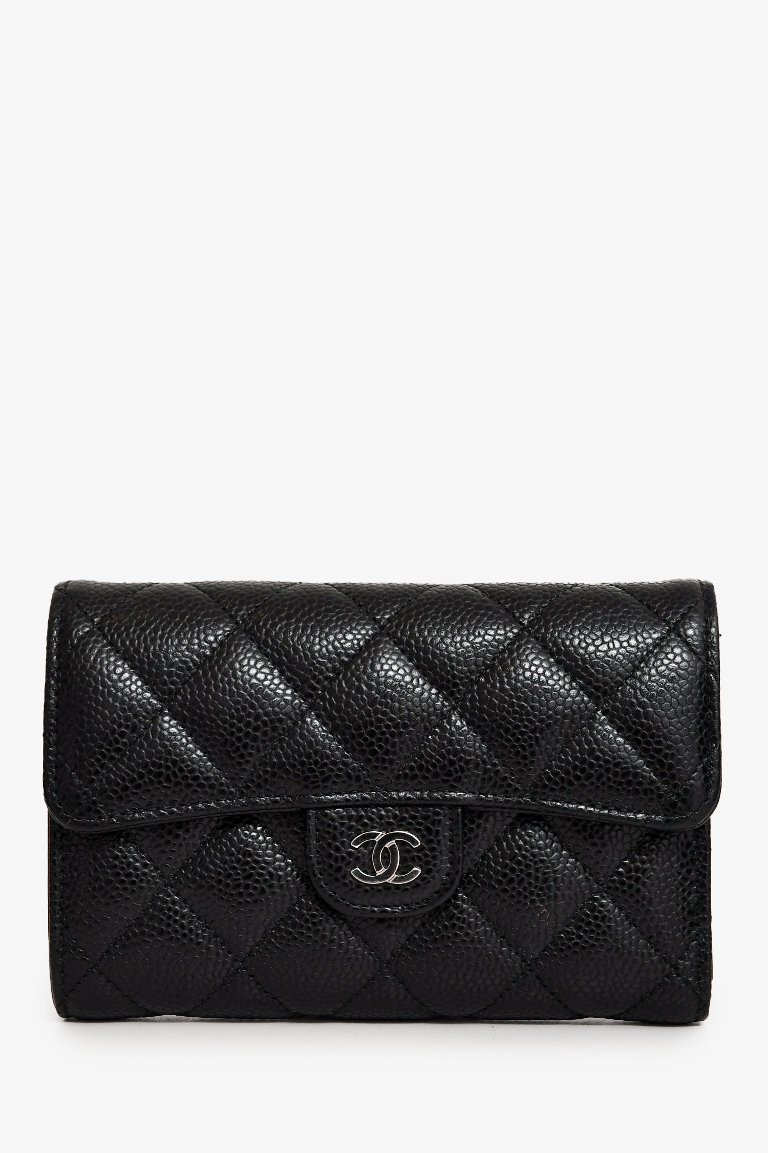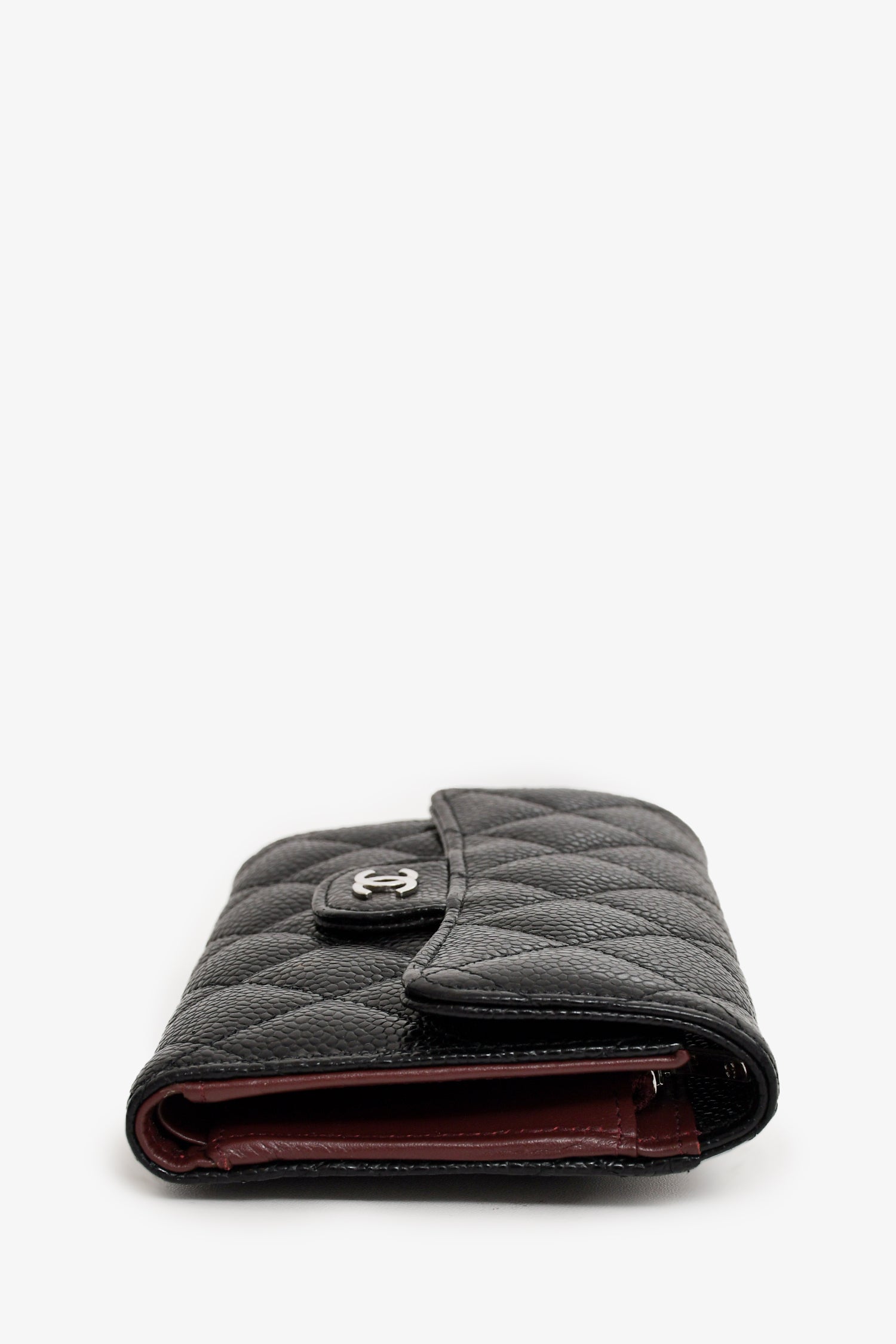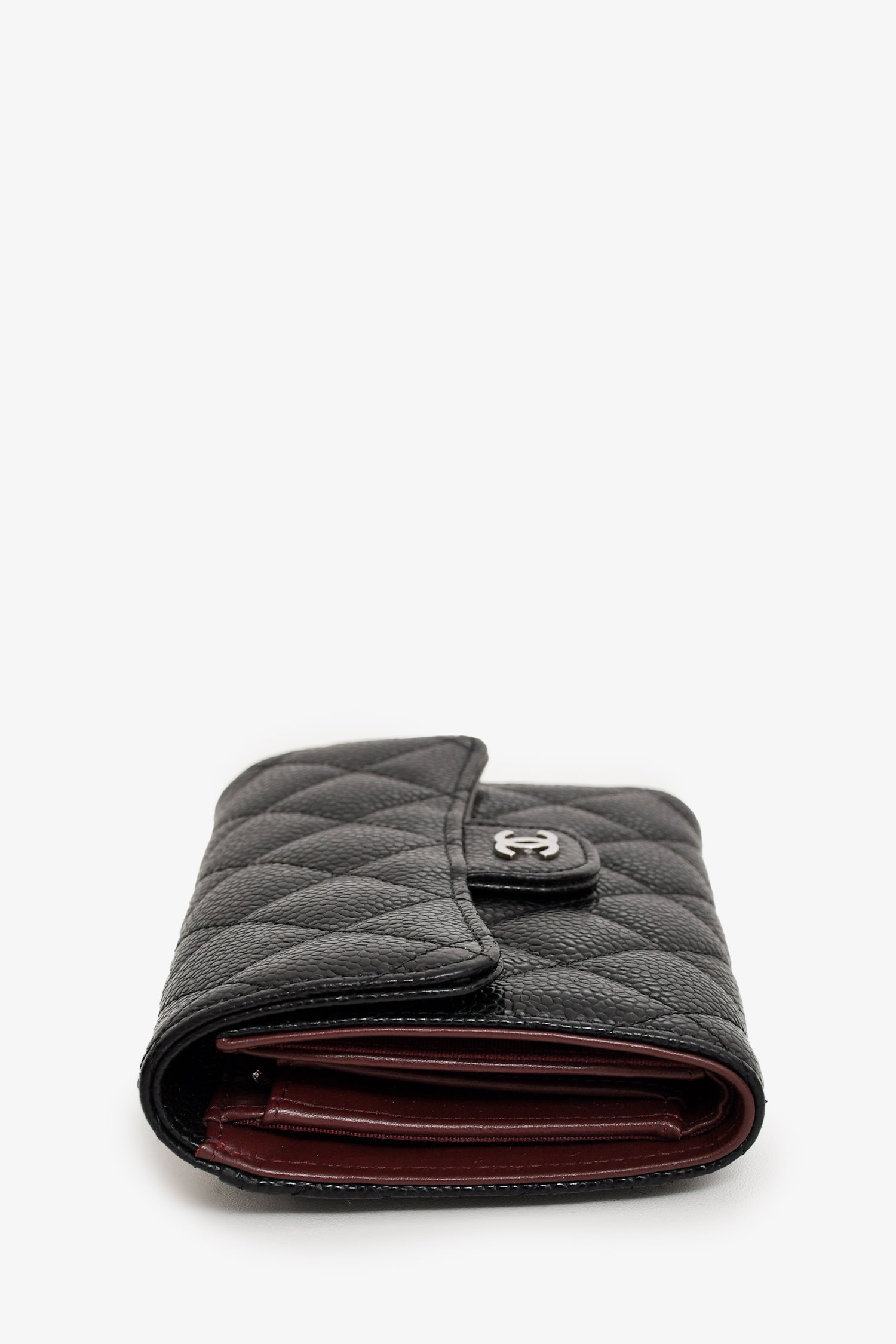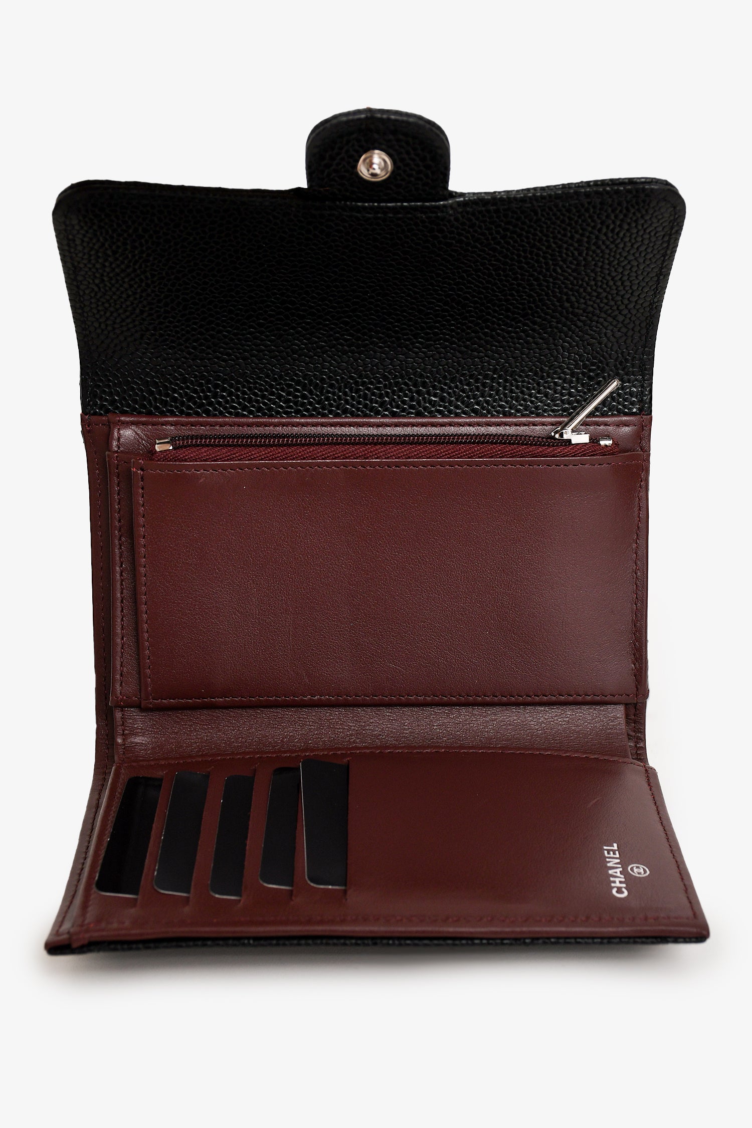 Refresh availabilityPre-Loved Chanel™ 2022 Black Caviar Small Classic Flap Wallet. Front fold-over flap with snap-button closure. Burgundy leather interior. 5 card slots. 1 billfold compartment. 1 zippered compartment. Silver-tone hardware.