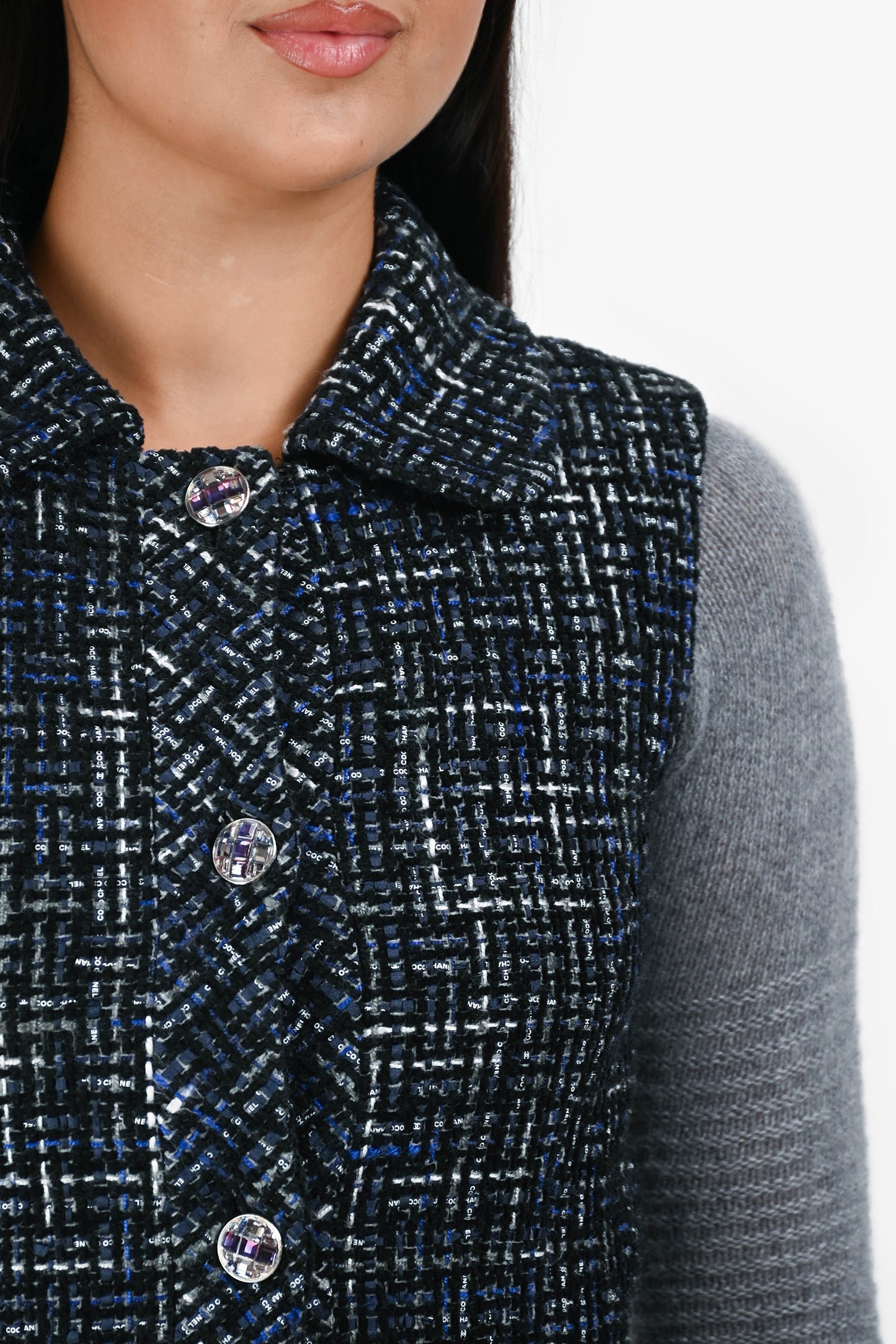 Refresh availabilityPre-Loved Chanel™ 2022 Blue/Black Tweed Crystal Buttoned Over Vest. Front button-up closure. Front pockets with button closure. Lined.