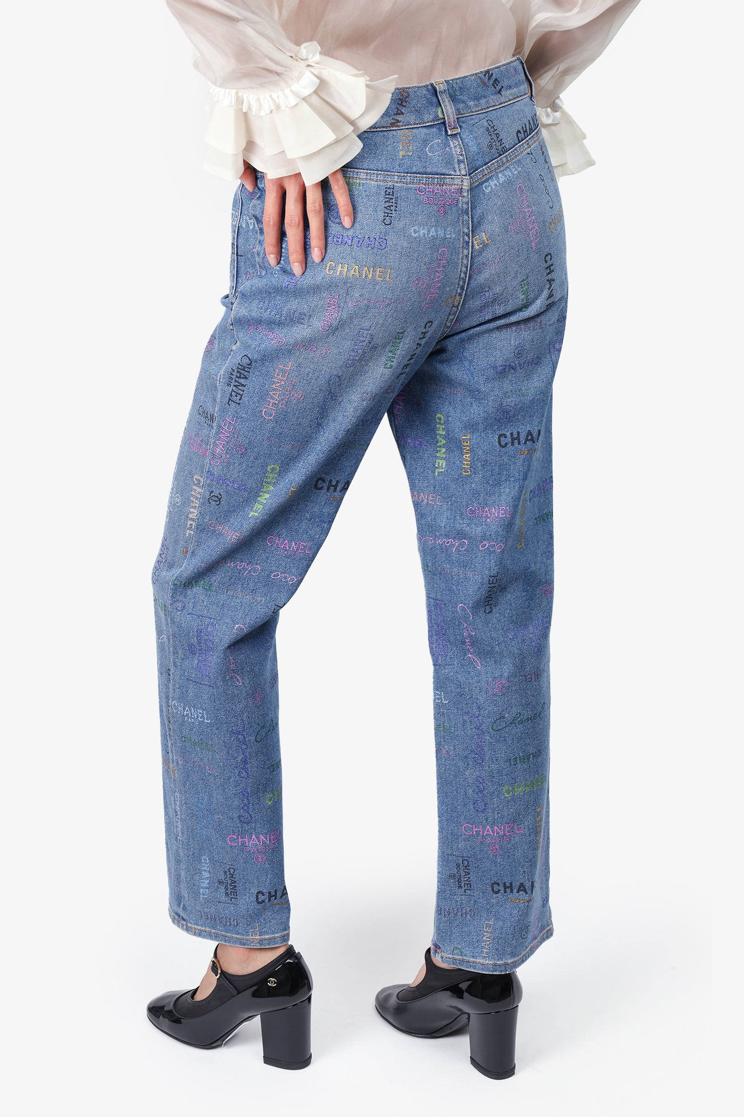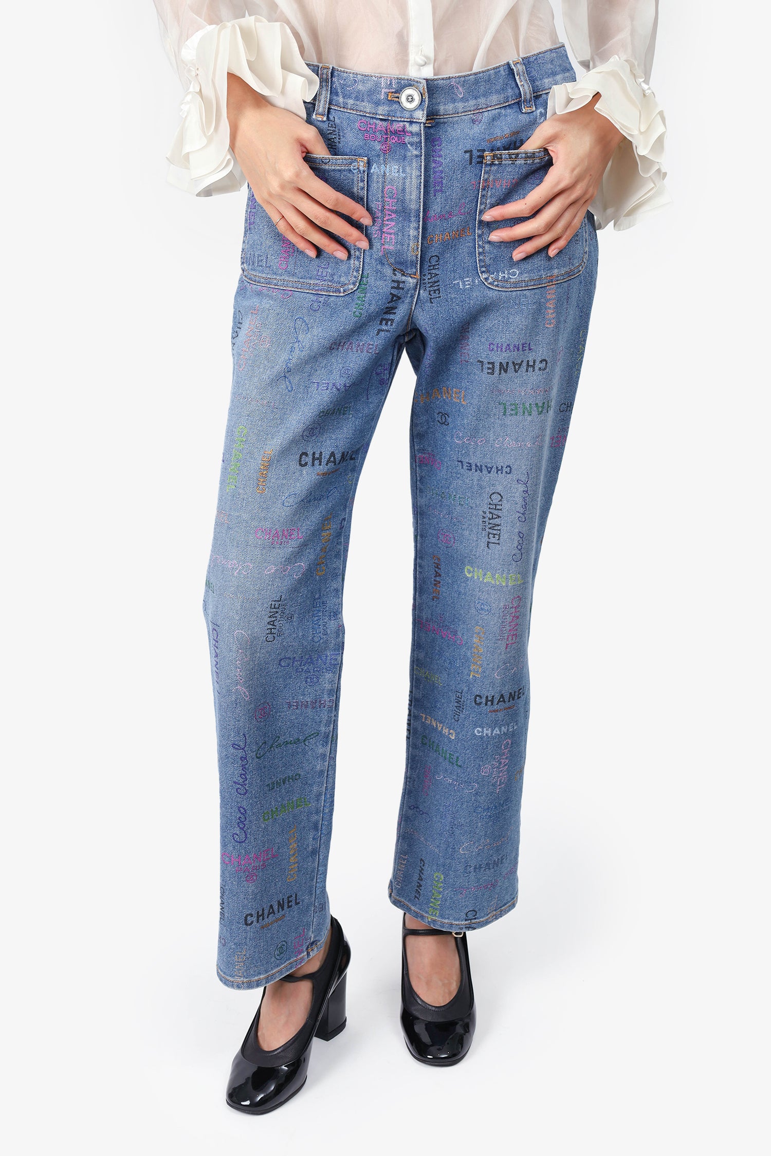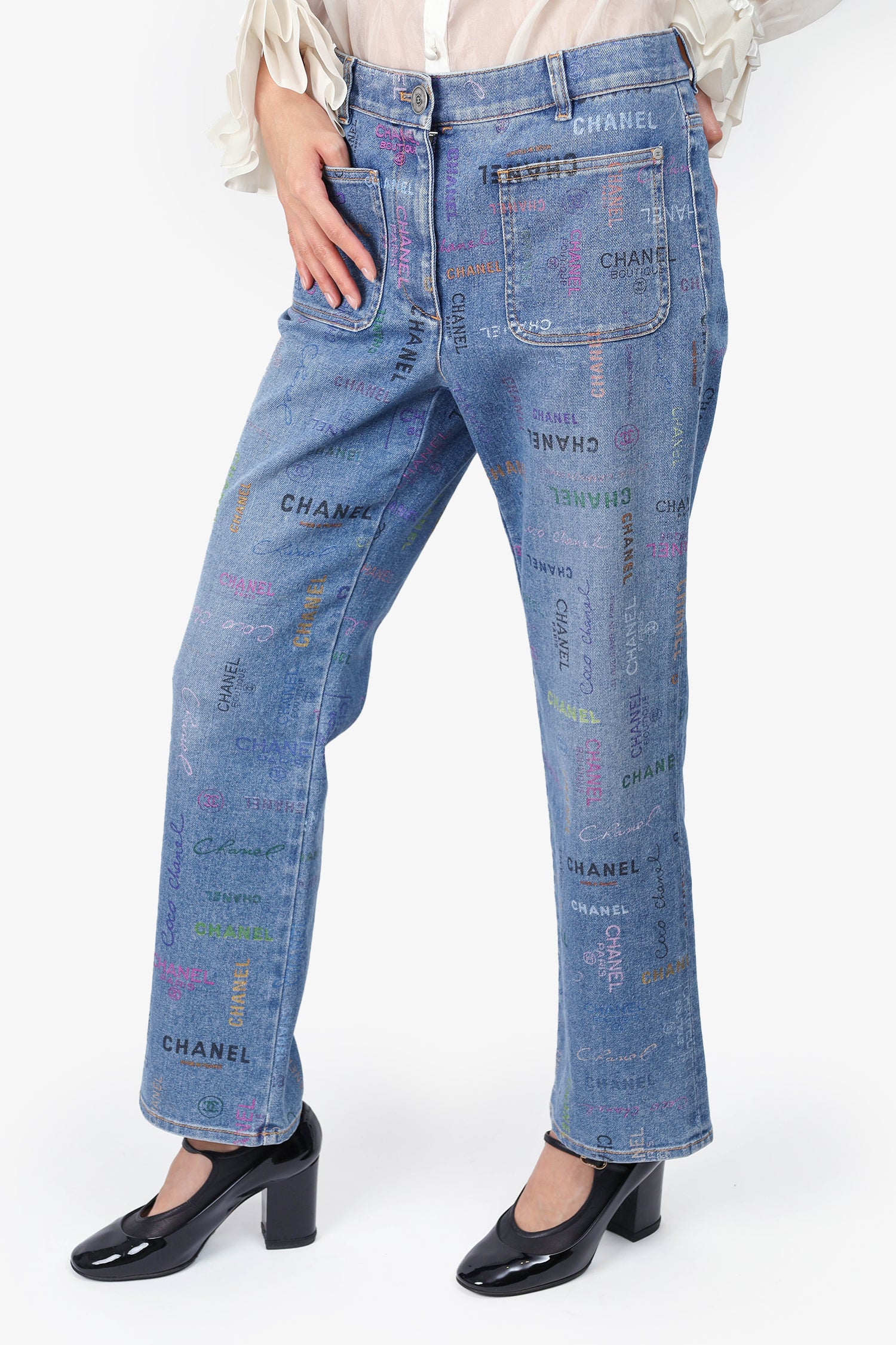 Refresh availabilityPre-Loved Chanel™ 2022 Blue/Multicolour Denim 'Chanel Boutique' Printed Jeans. Front button-up and zip closure. Belt loops around waistline. 2 front slip pockets. Contrast stitching.