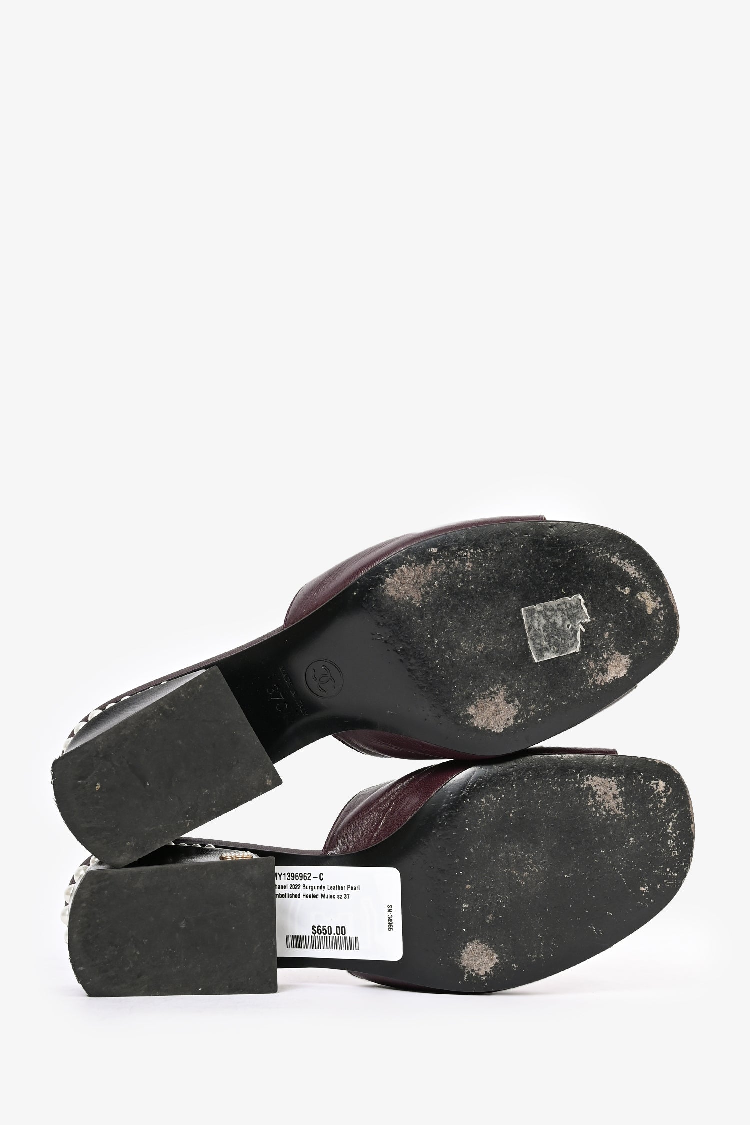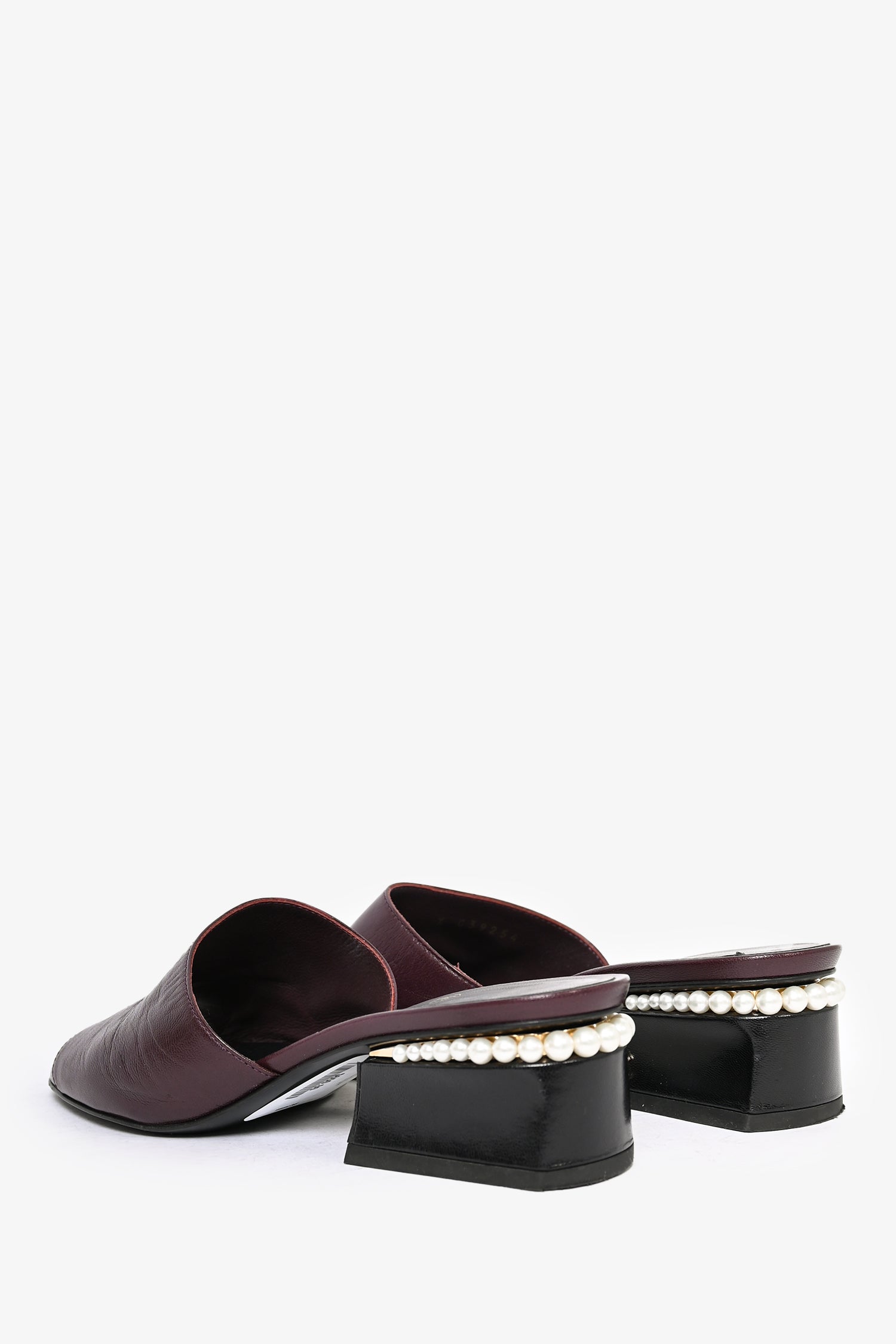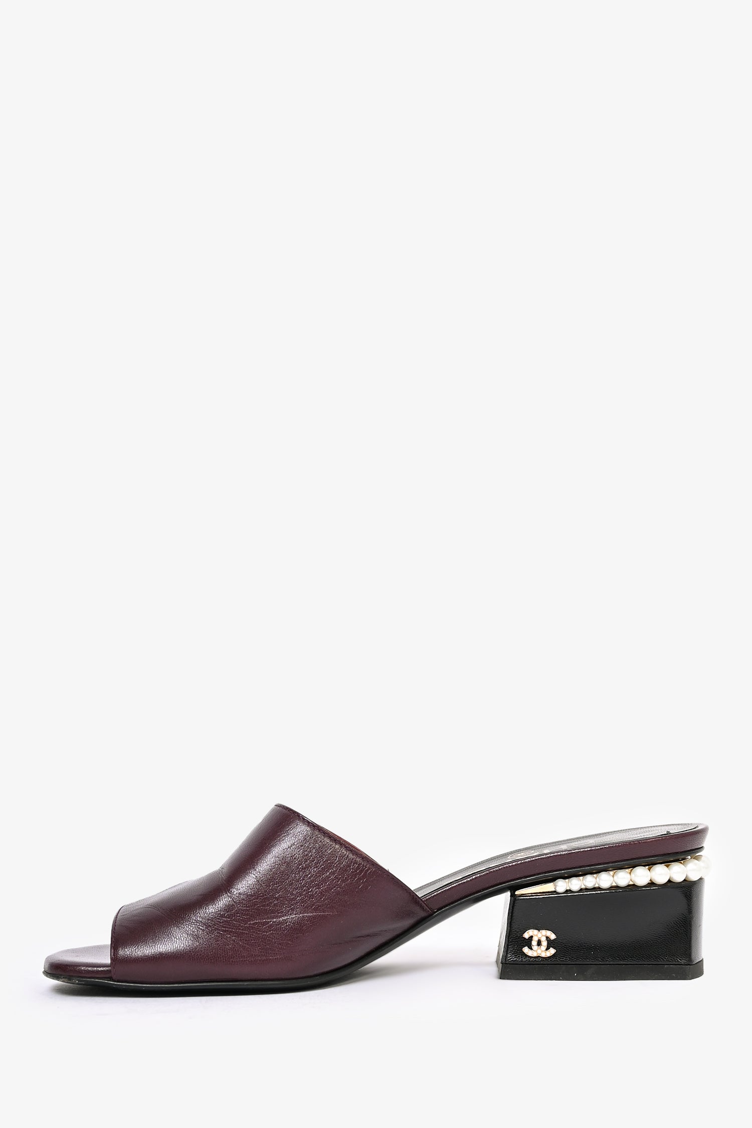 Refresh availabilityPre-Loved Chanel™ 2022 Burgundy Leather Pearl Embellished Heeled Mules. Slip-on. Open toe. Block heel with interlocking CC detail.