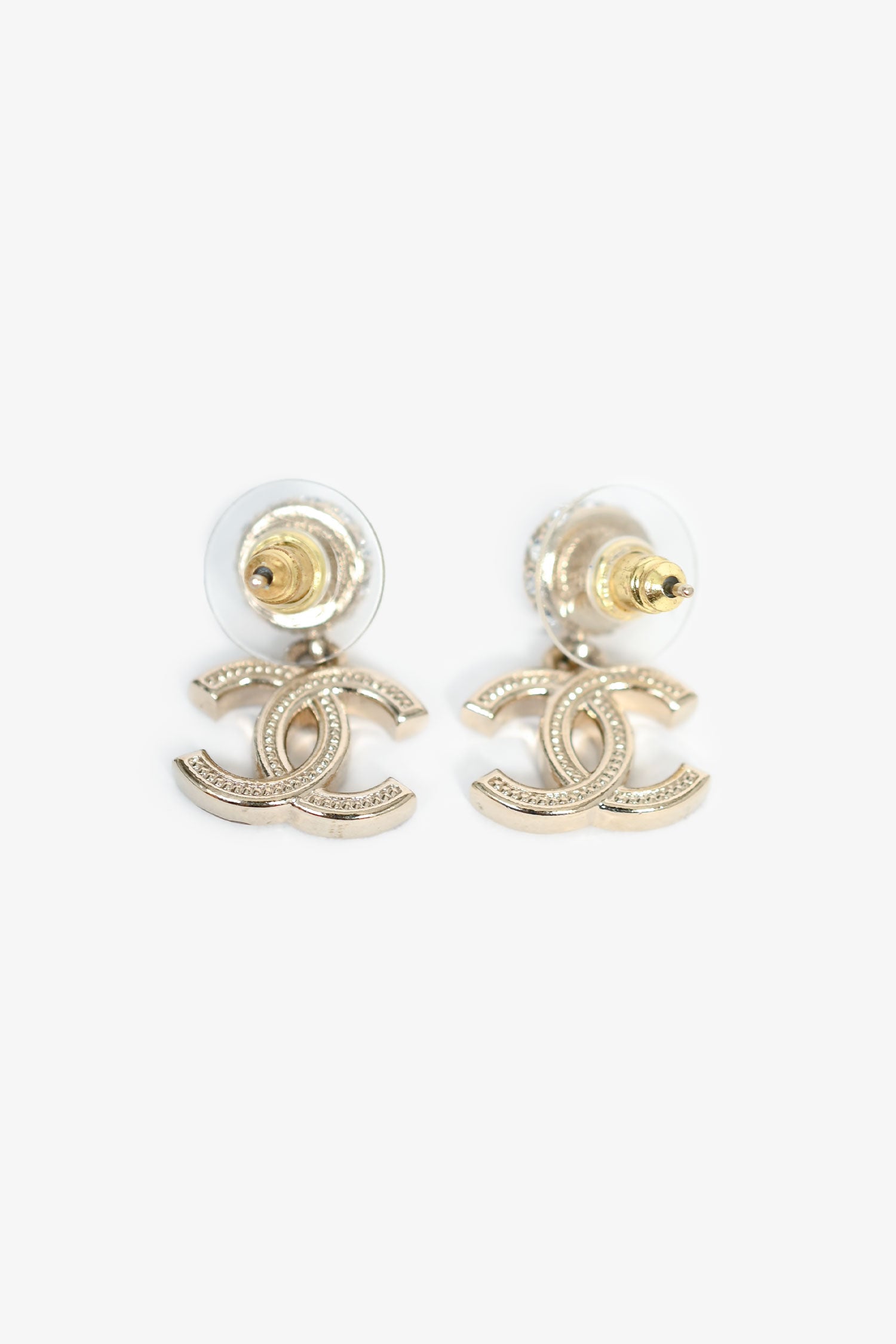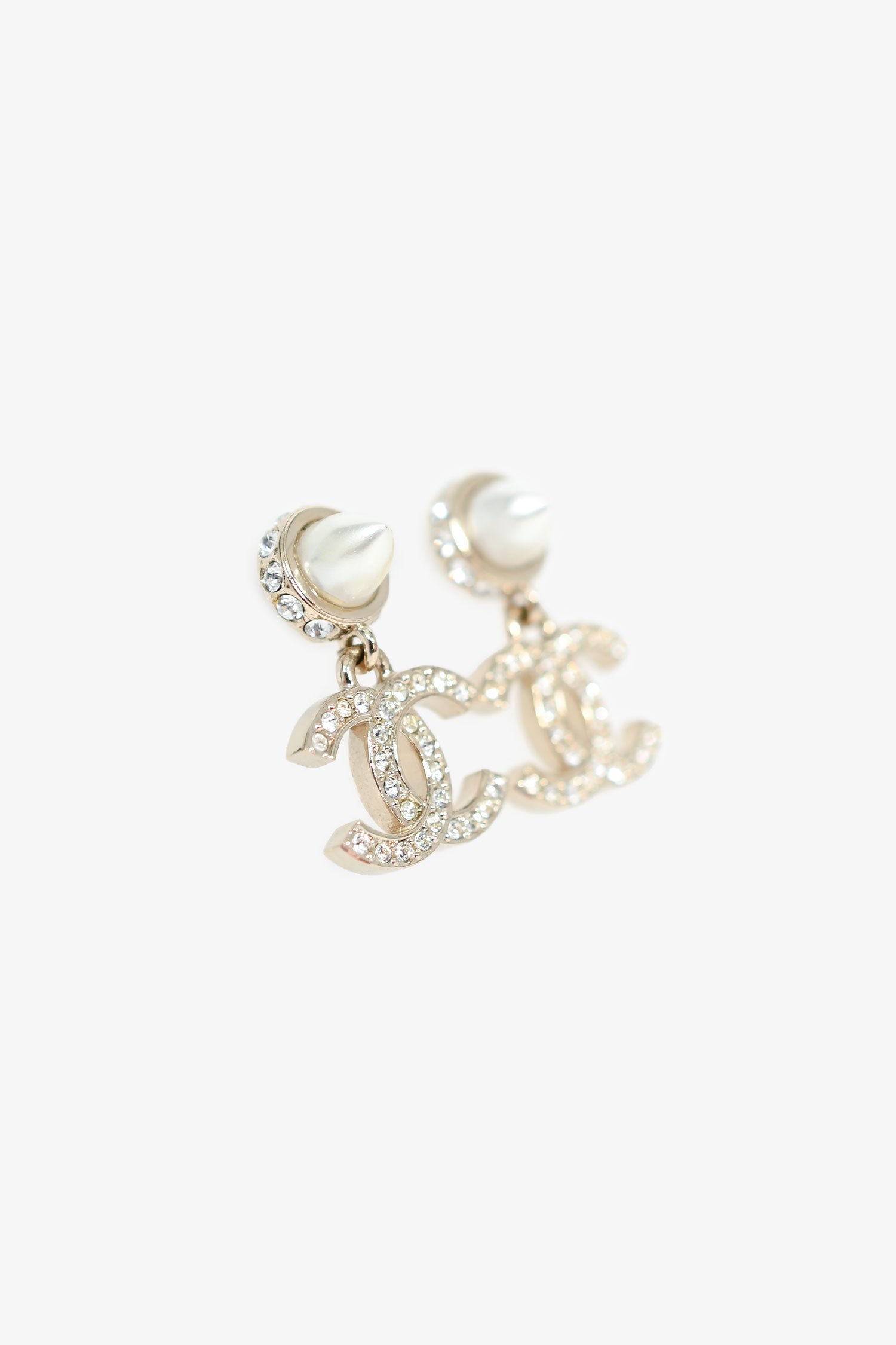 Refresh availabilityPre-Loved Chanel™ 2022 Gold Toned Pearl Crystal CC Drop Earring. Push-pin closure.