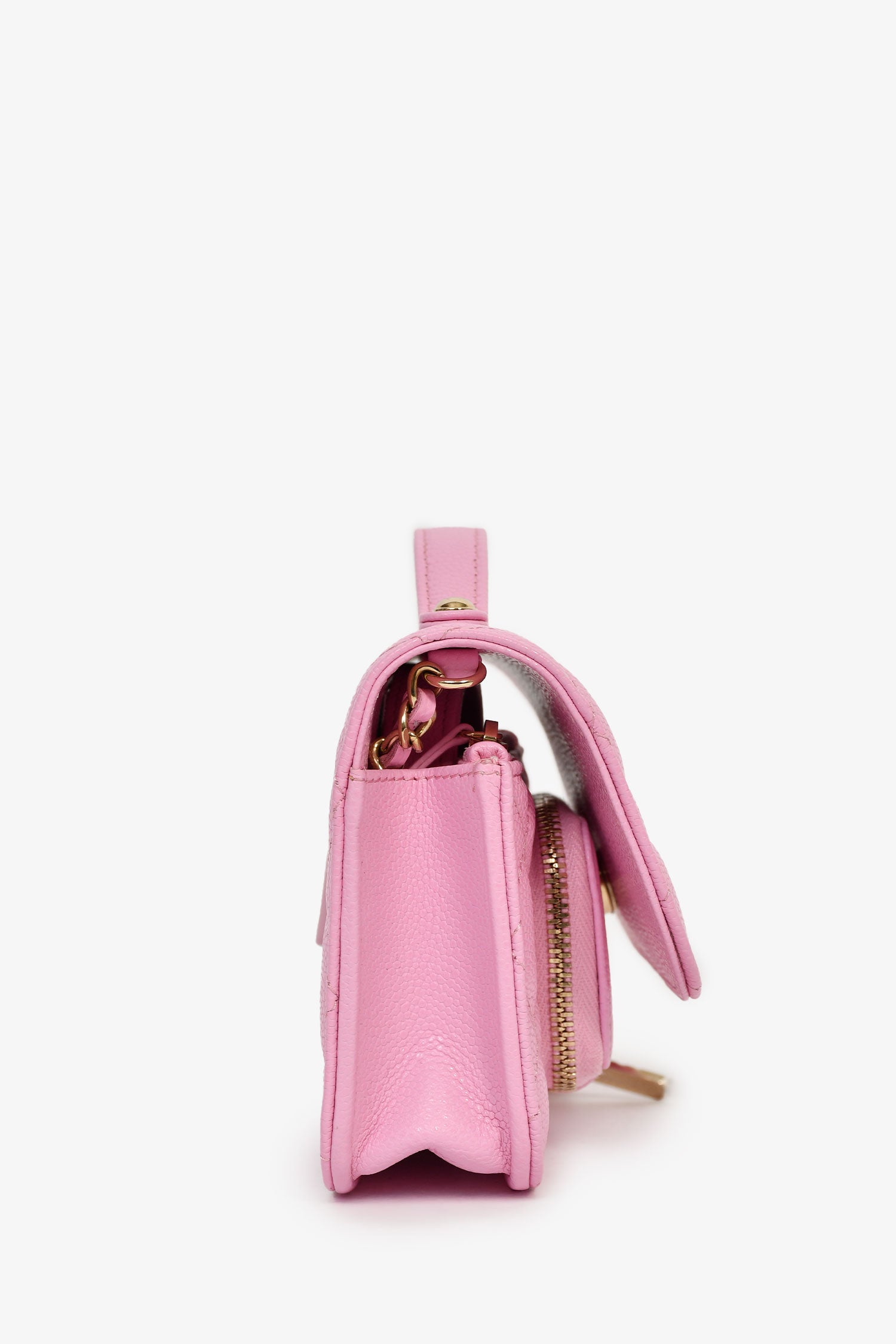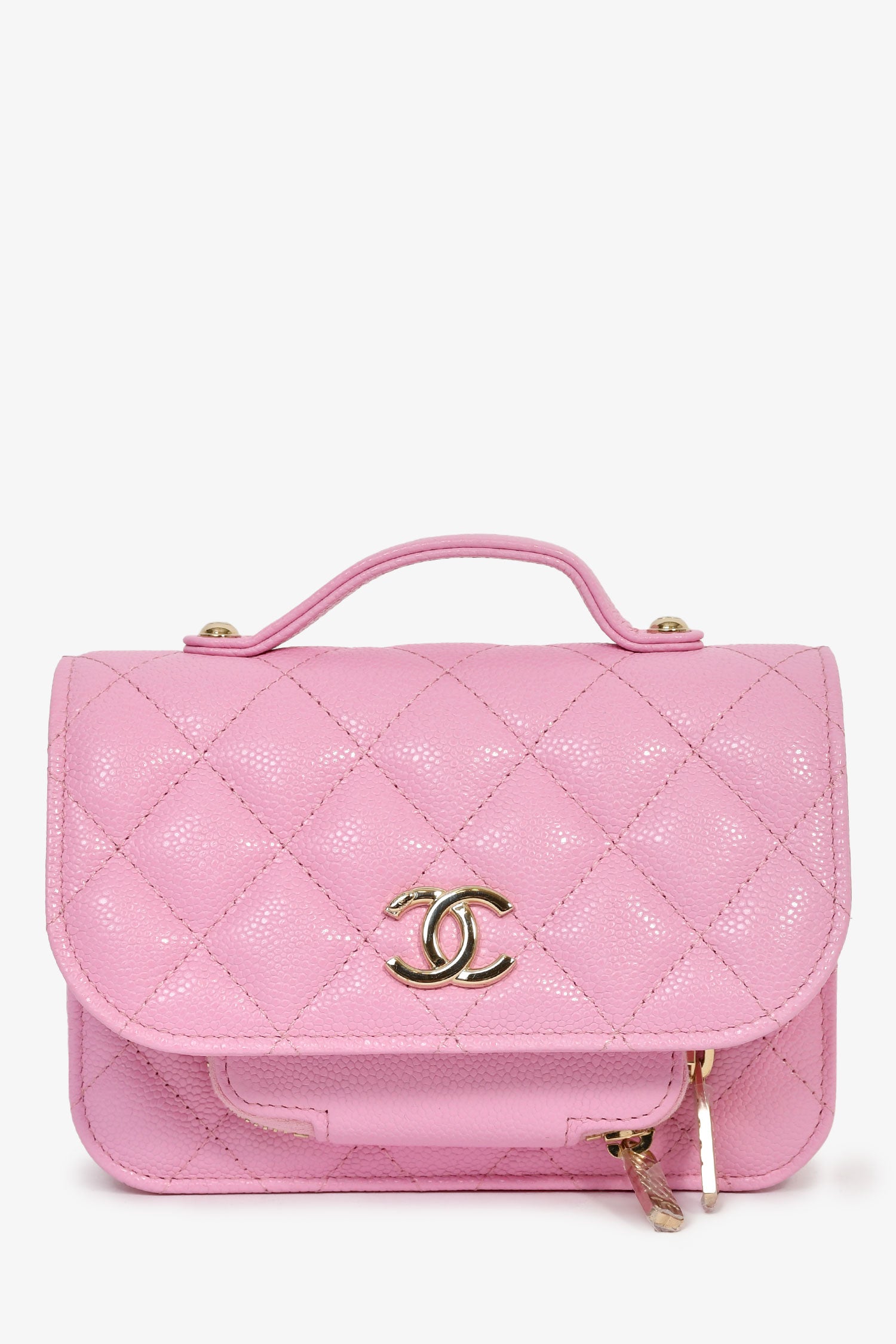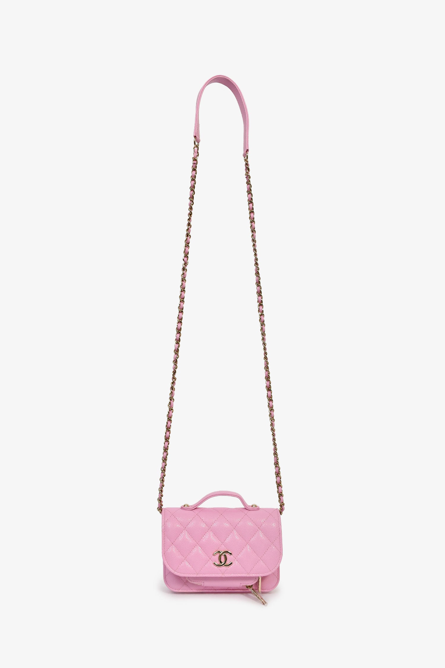 Refresh availabilityPre-Loved Chanel™ 2022+ Lilac Caviar Leather Business Affinity Clutch On Chain. Front fold-over flap with snap closure. Single top handle. Chain-link and leather strap. 3 compartments: 2 zip and 1 open. Lined canvas interior. Gold-tone hardware. Tonal stitching.