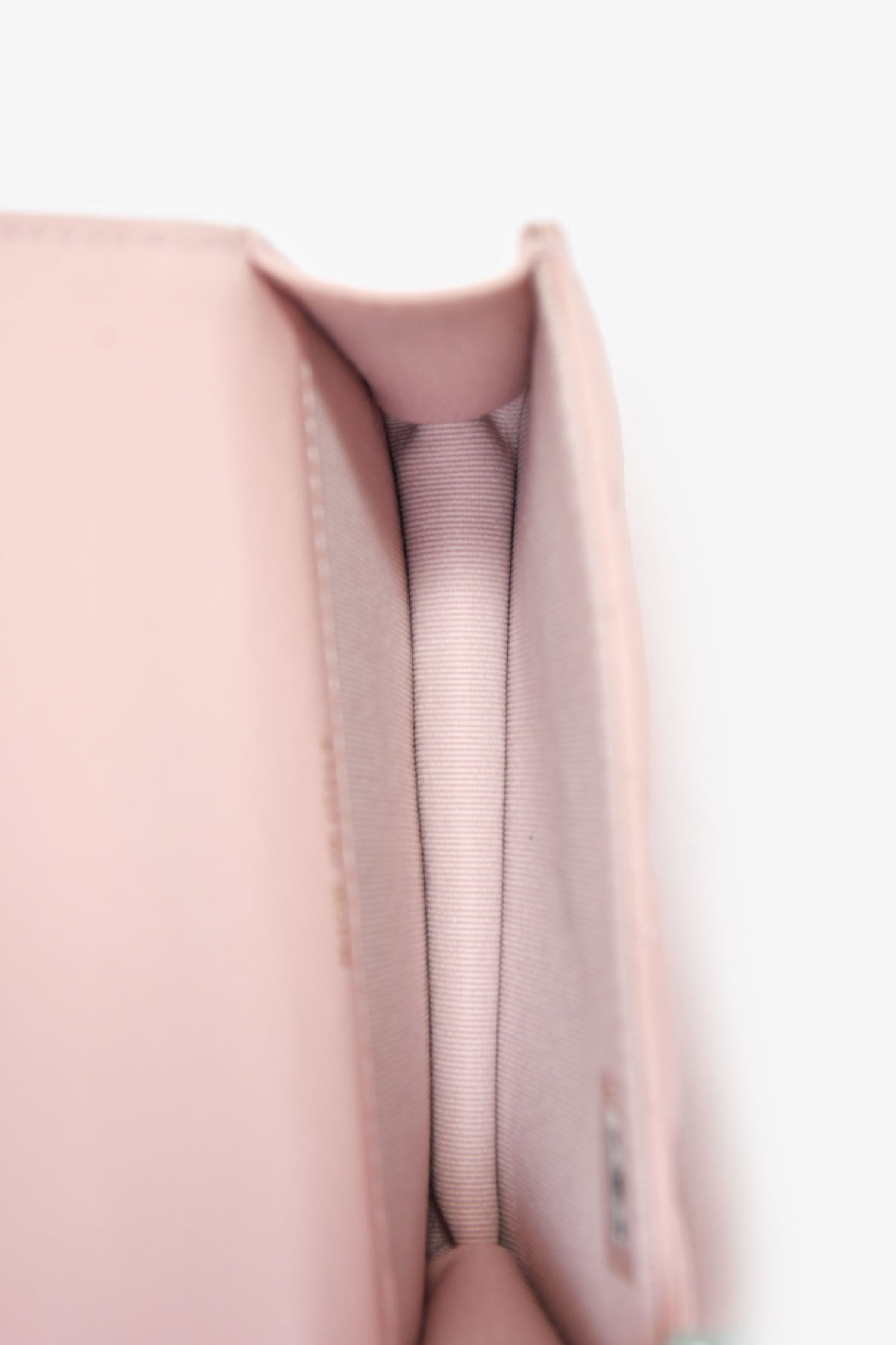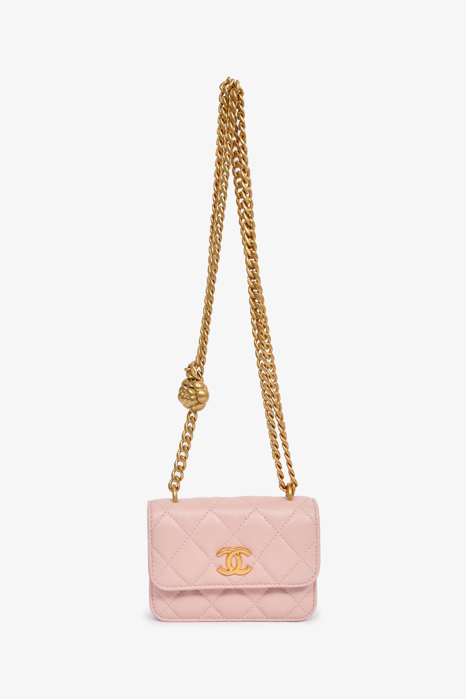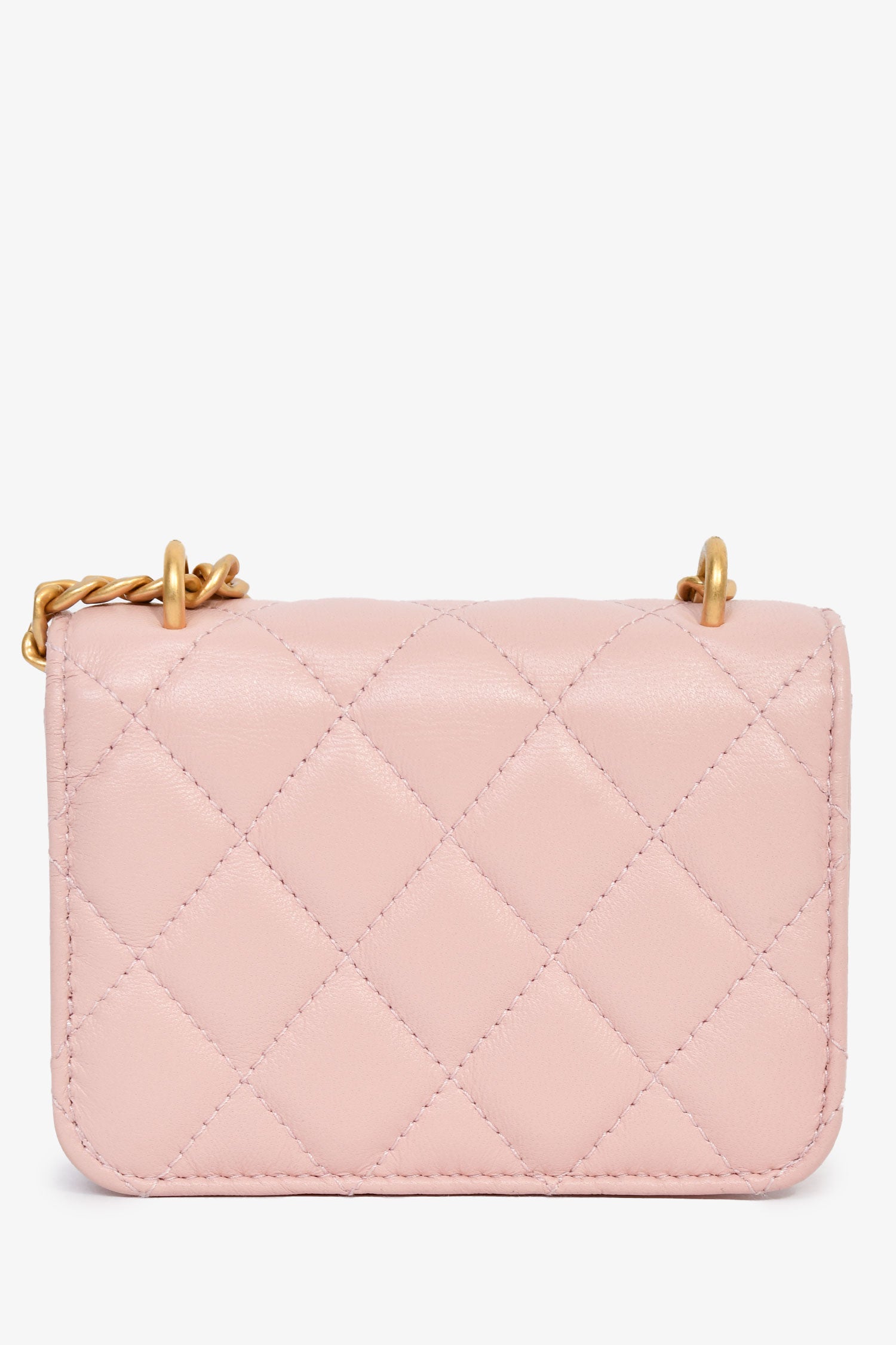 Refresh availabilityPre-Loved Chanel™ 2021+ Pink Leather 'Pearl Crush' Mini Crossbody Bag. Front fold-over flap with snap closure. Chain-link crossbody strap. Lined interior. Gold-tone hardware. Tonal stitching.