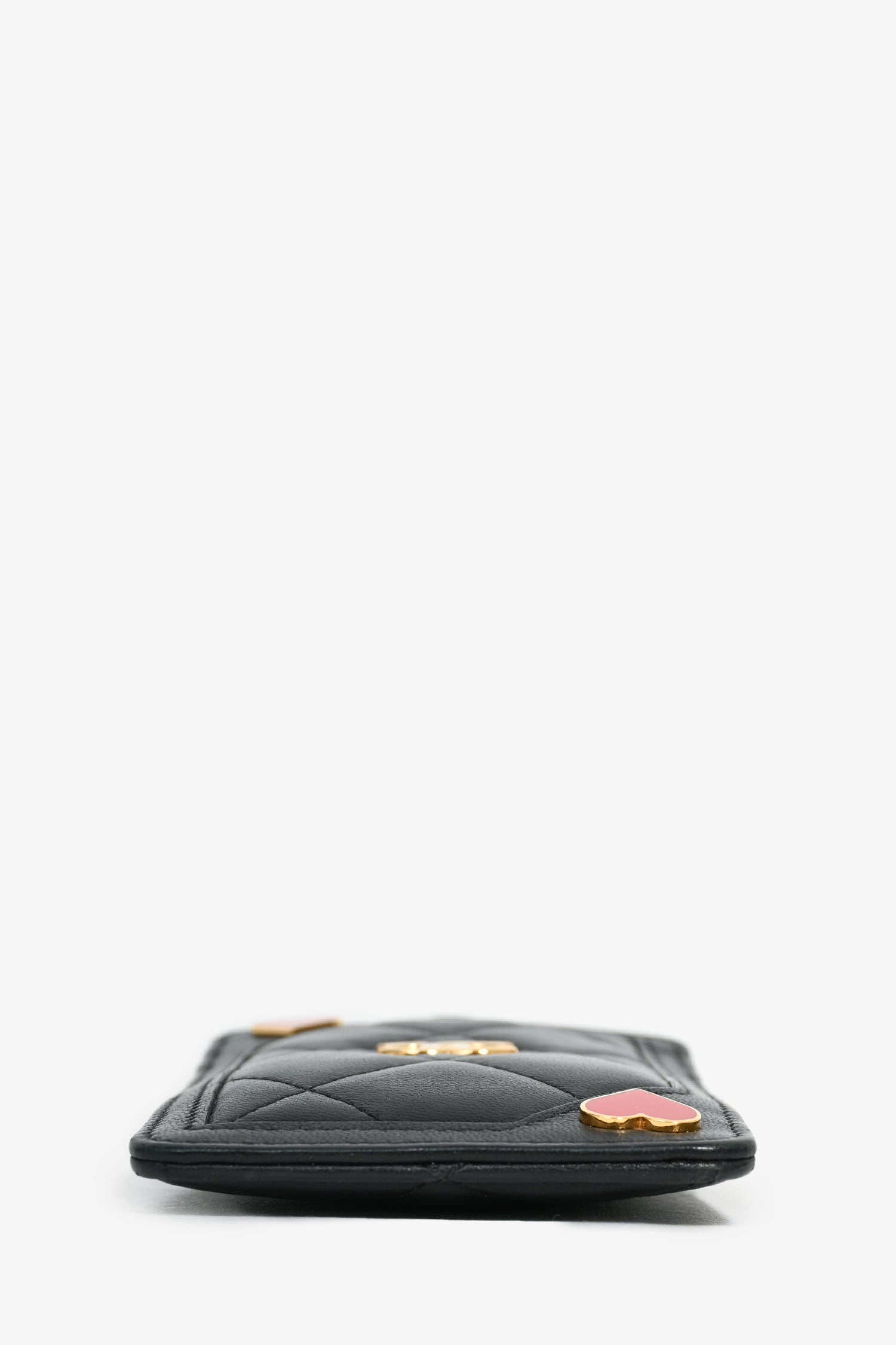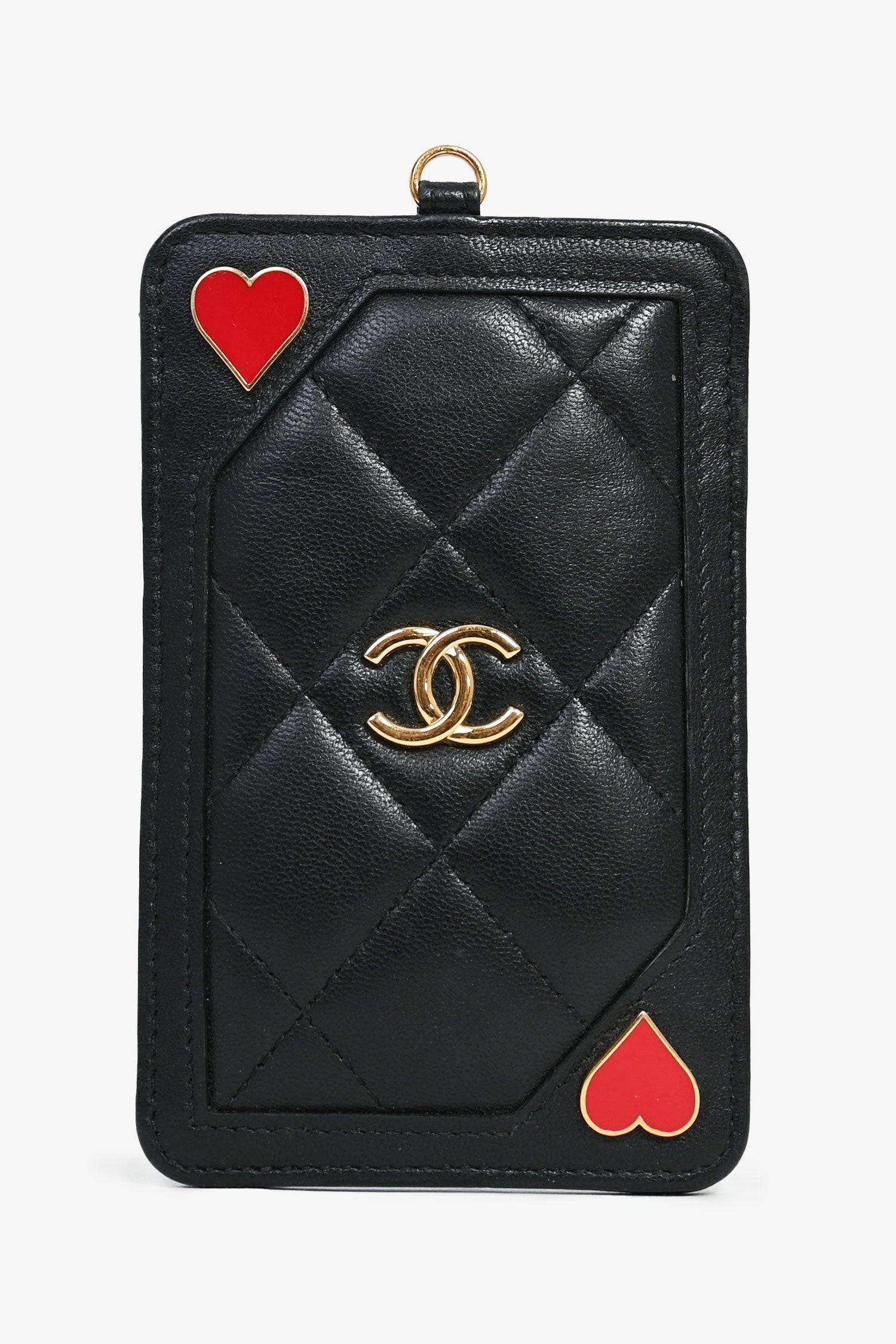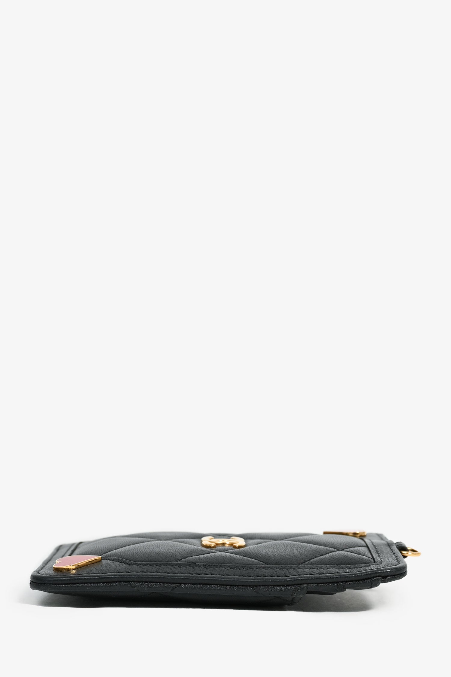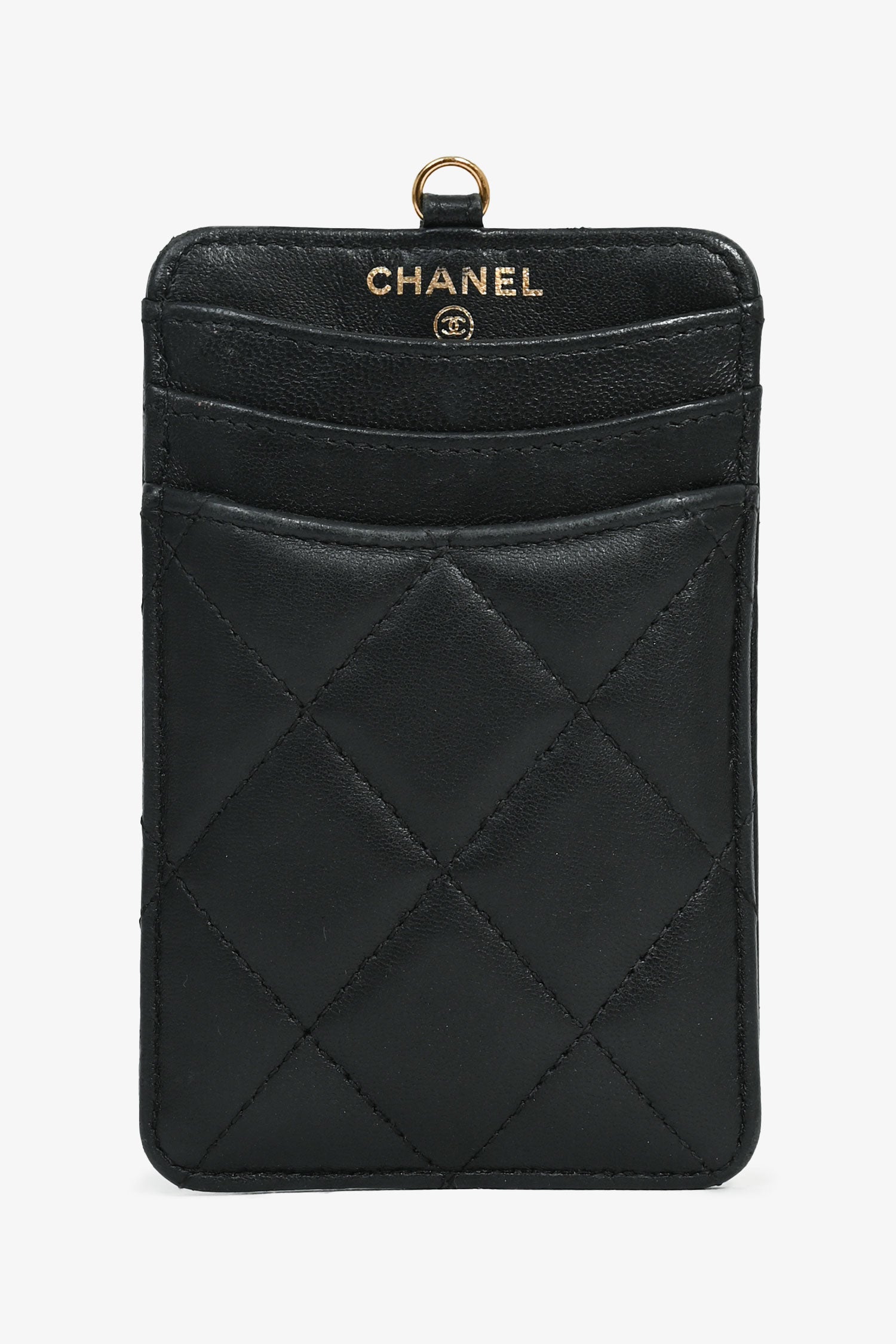 Pre-Loved Chanel™ 2023 Black Lambskin 'Coco Casino' Card Holder. Three rear card slot slip pockets. Built-in top ring for strap. Gold-tone hardware. Tonal stitching.