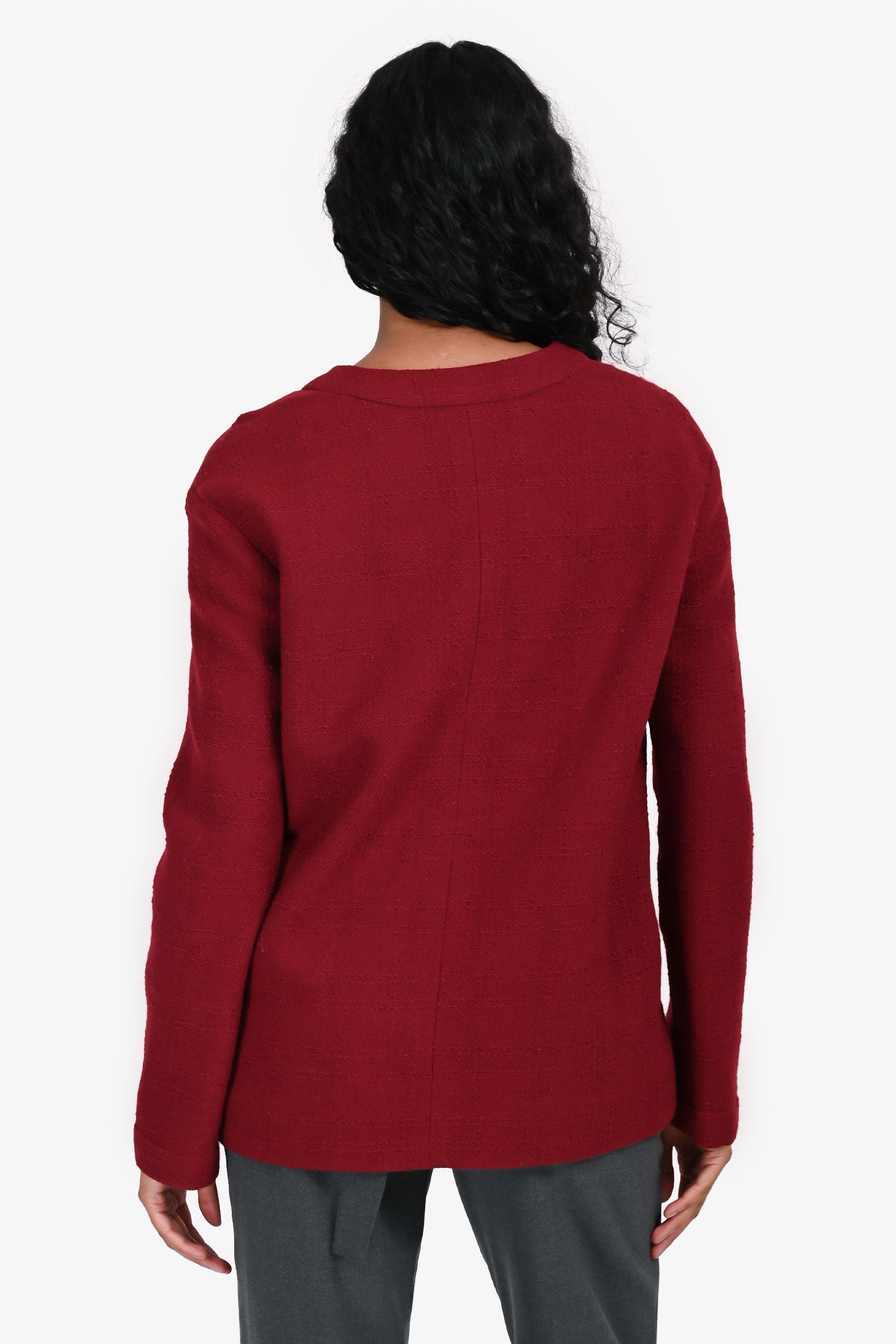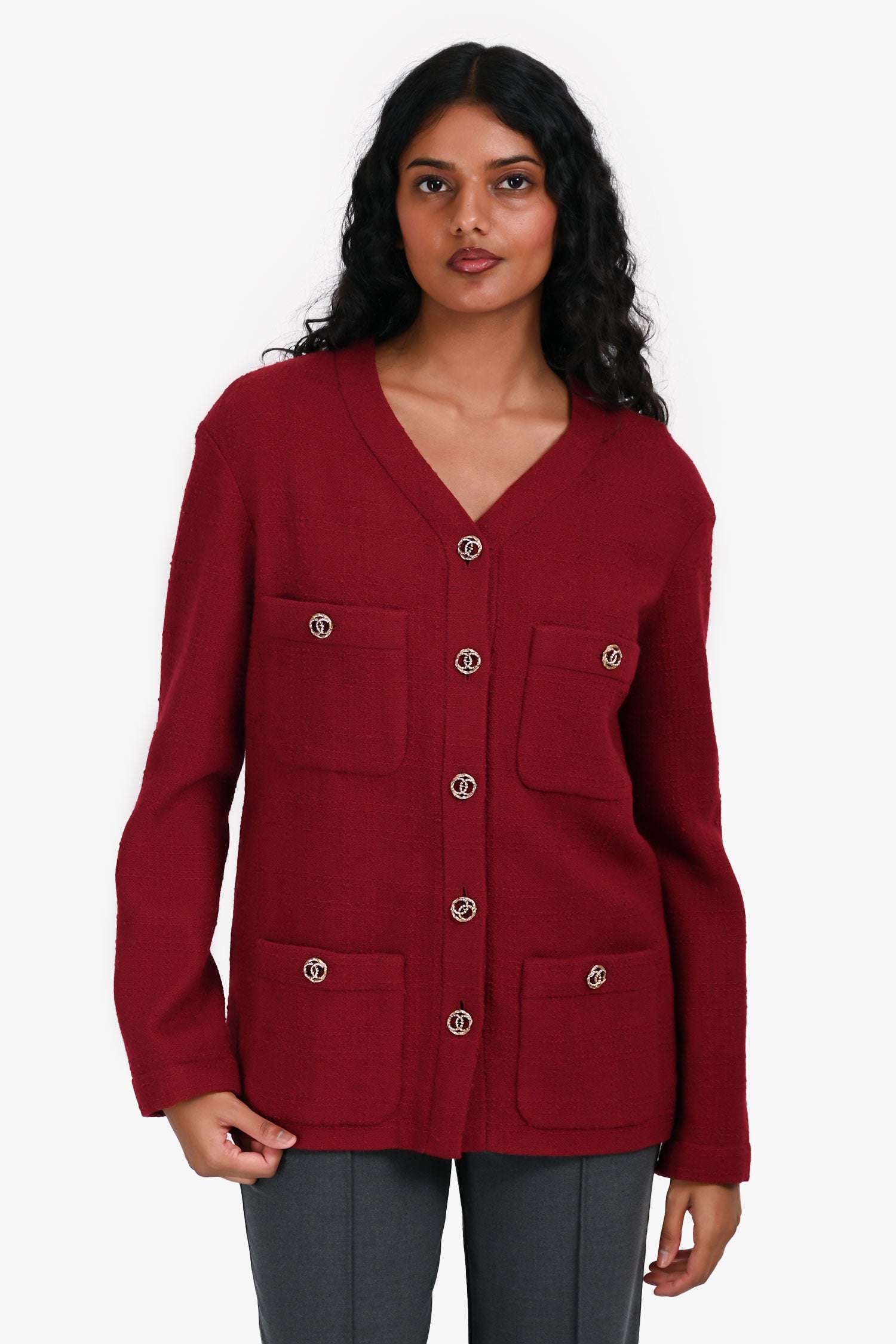 Refresh availabilityPre-Loved Chanel™ 2023 Red Wool Buttoned Jacket. V-neckline. Front button-up closure. Front pockets with button closure. Lined.