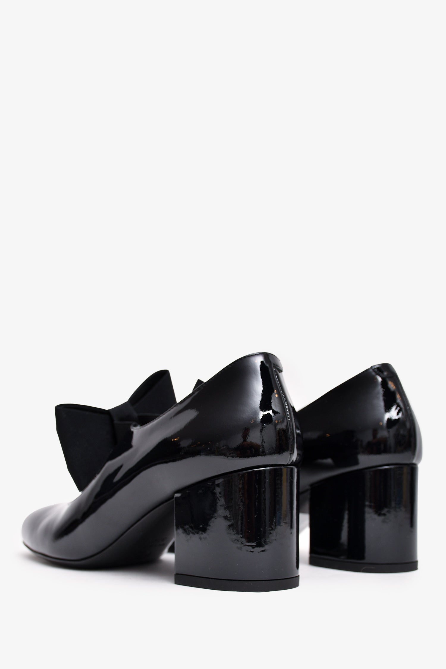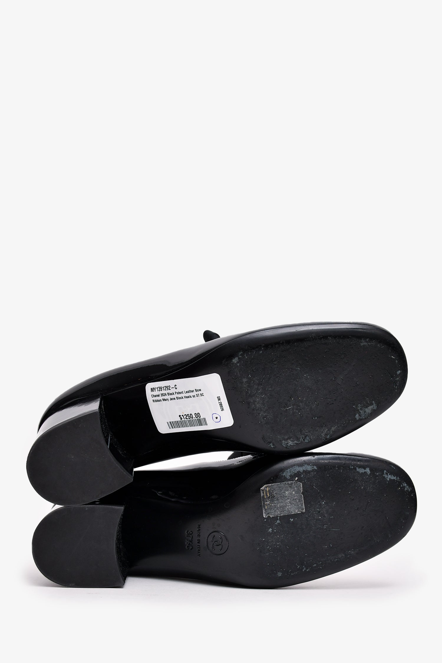Pre-Loved Chanel™ 2024 Black Patent Leather Bow Ribbon Mary Jane Block Heels Size 37.5C