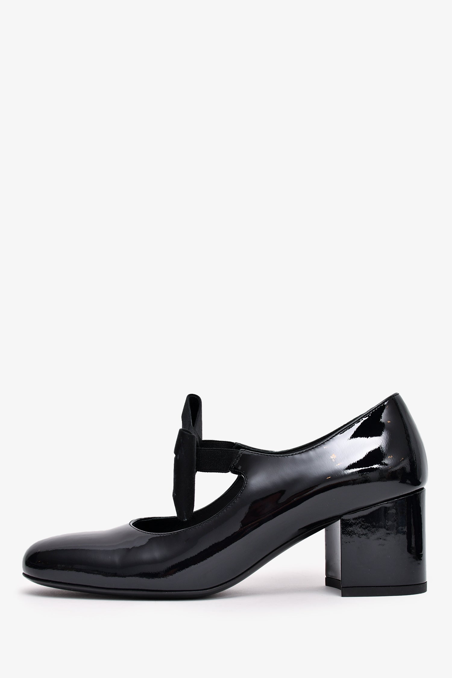 Refresh availabilityPre-Loved Chanel™ 2024 Black Patent Leather Bow Ribbon Mary Jane Block Heels. Tonal stitching. Black grosgrain bow with interlocking 'CC'. Lacquered black patent outer and block heel.