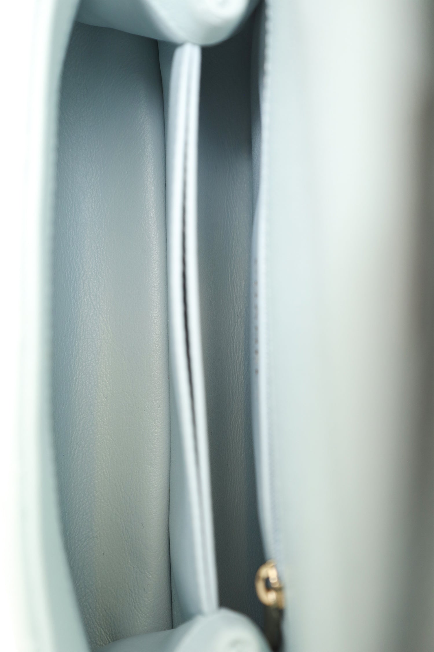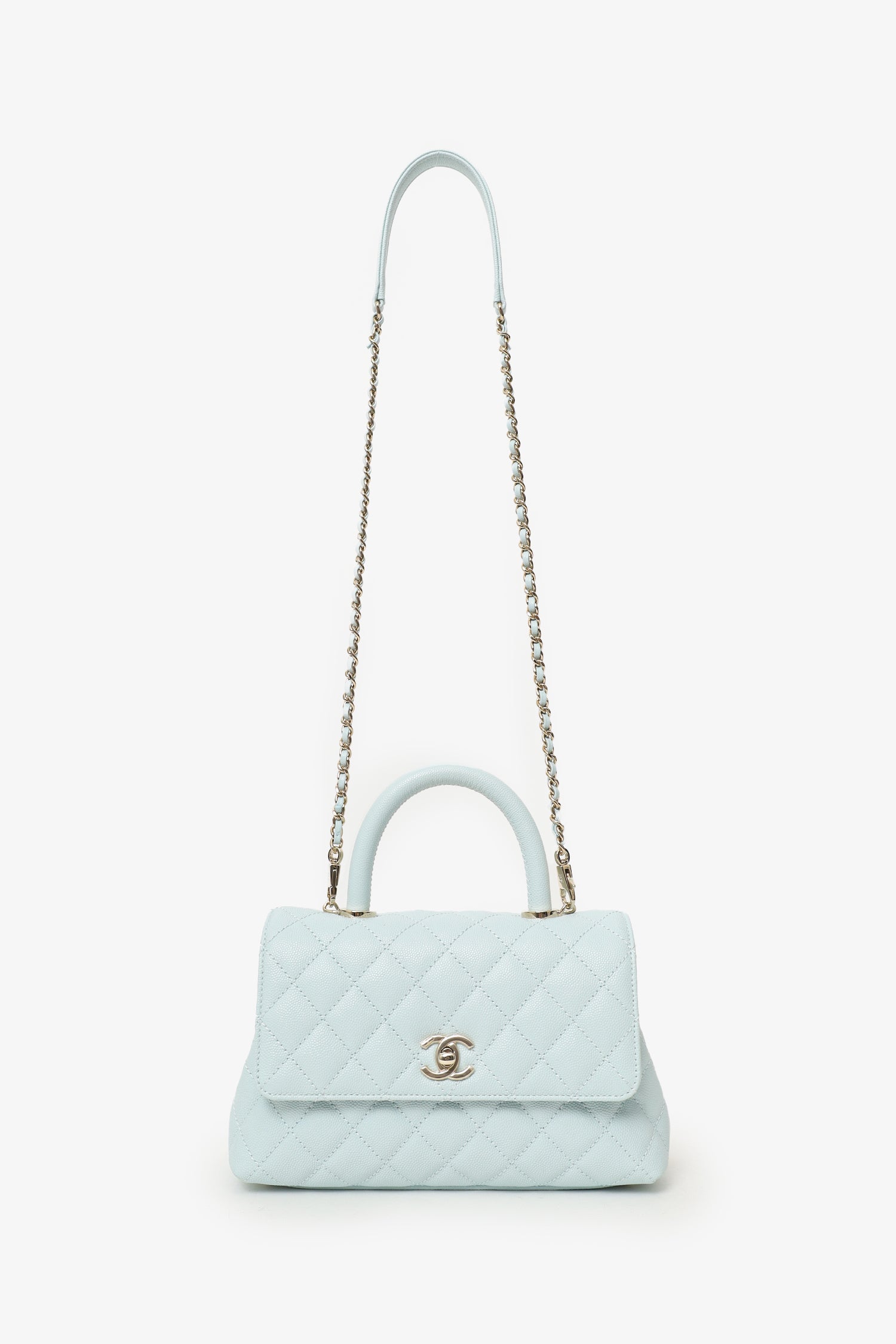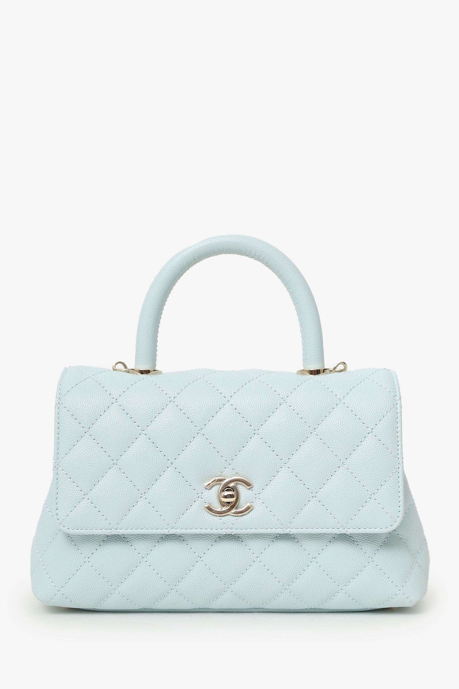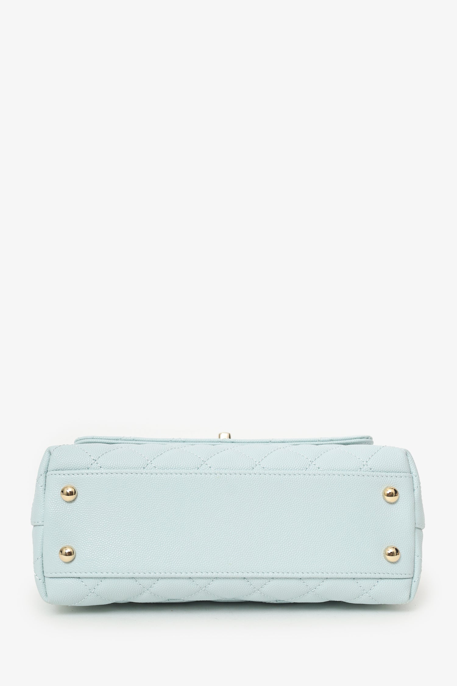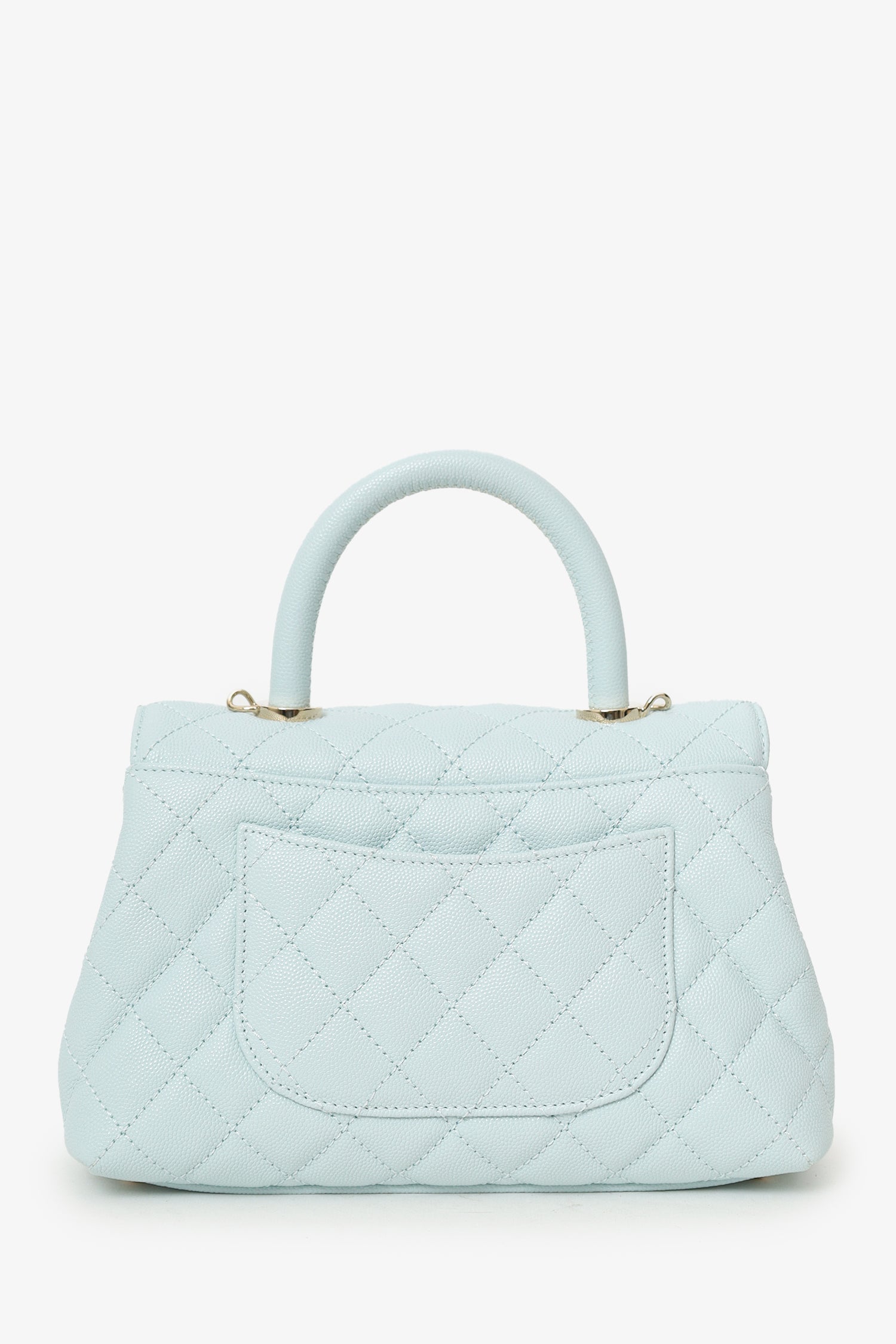 Refresh availabilityPre-Loved Chanel™ 21S Tiffany Blue Caviar Leather Small Coco Handle. Front fold-over flap with turn-lock closure. Top handle. Removable chainlink shoulder strap with clasp closure. Protective base studs. Single exterior rear slip pocket. Lined interior with 4 pockets; 2 slip, 1 bill, and 1 zip. Gold-tone hardware. Tonal stitching.