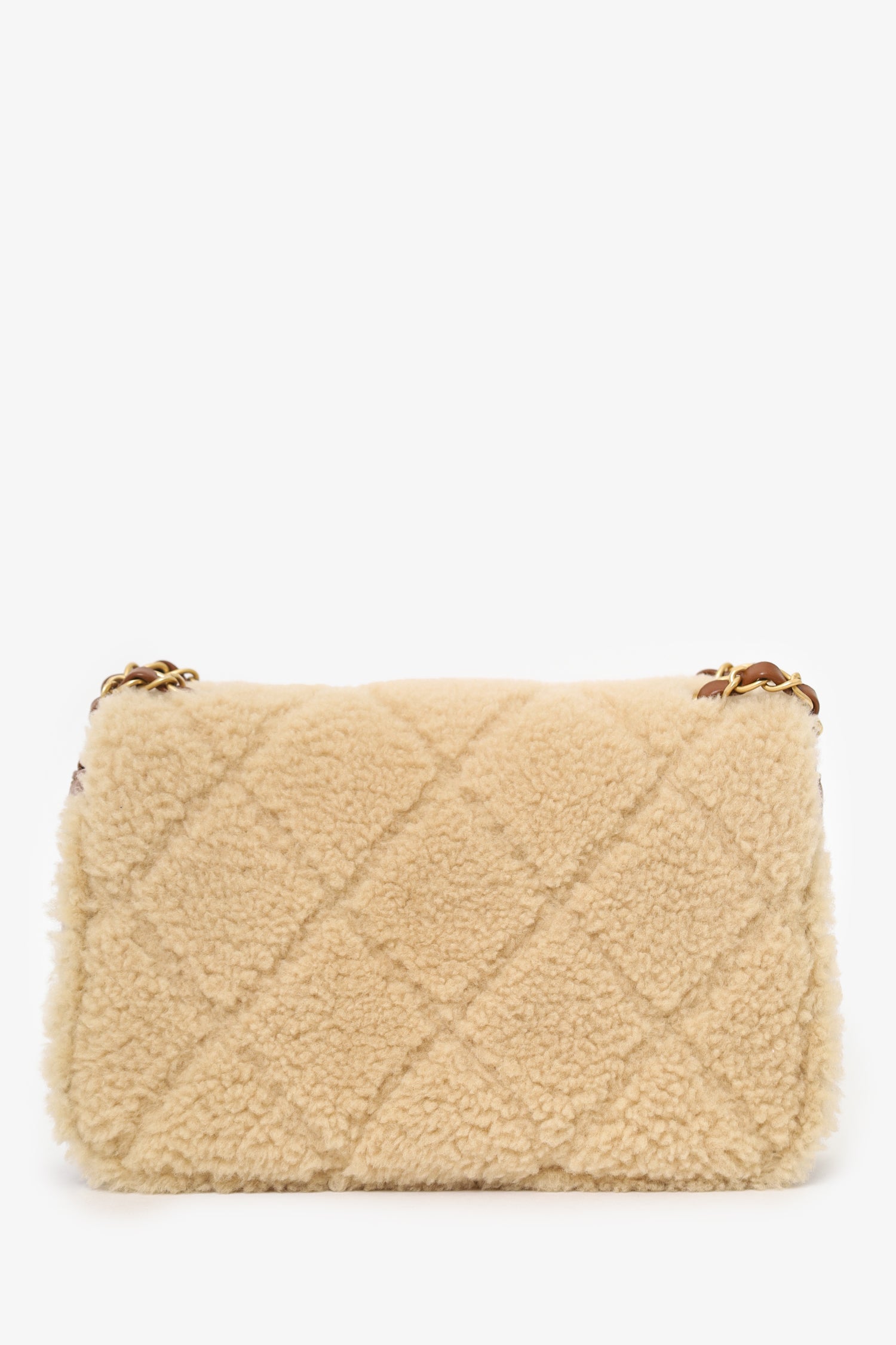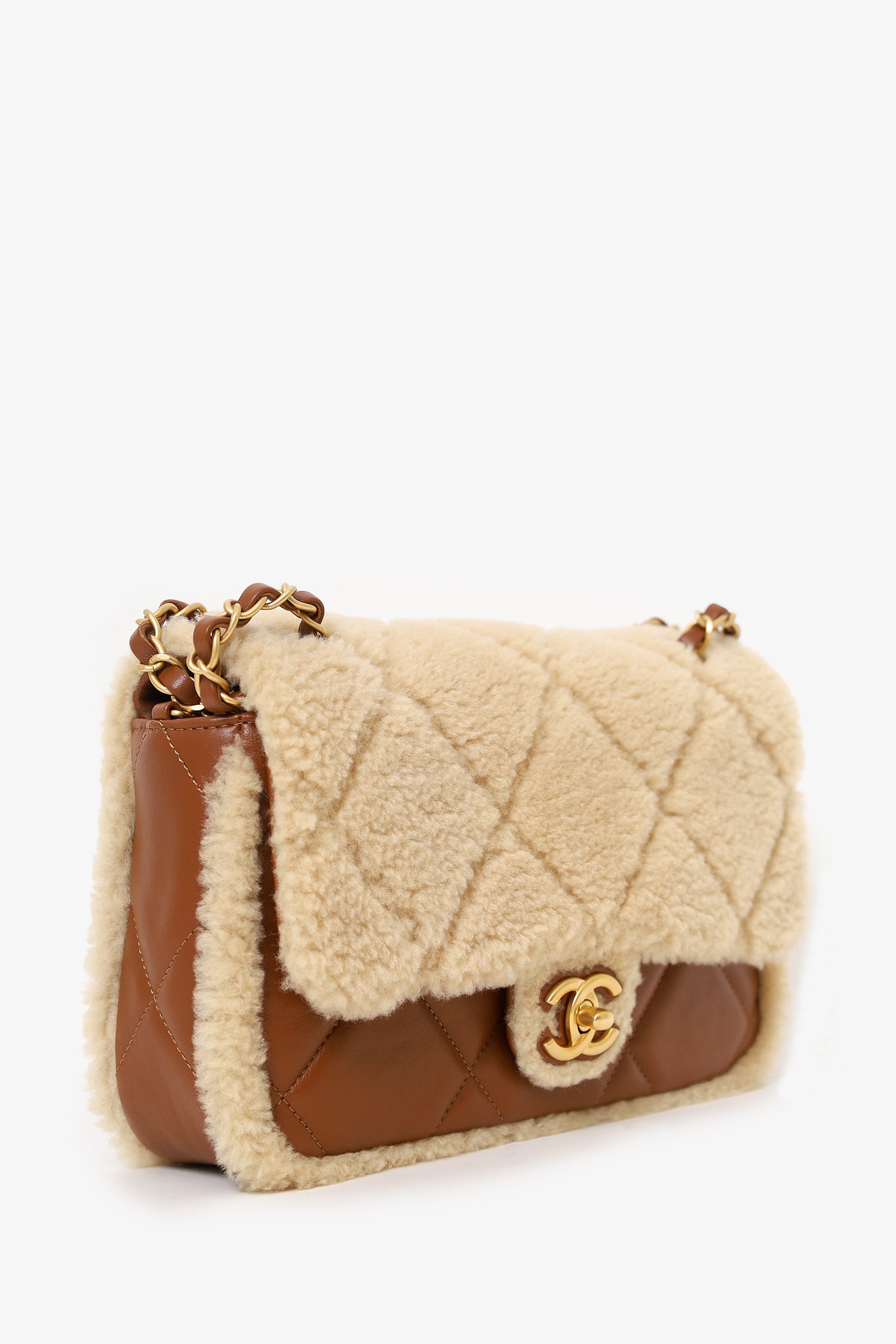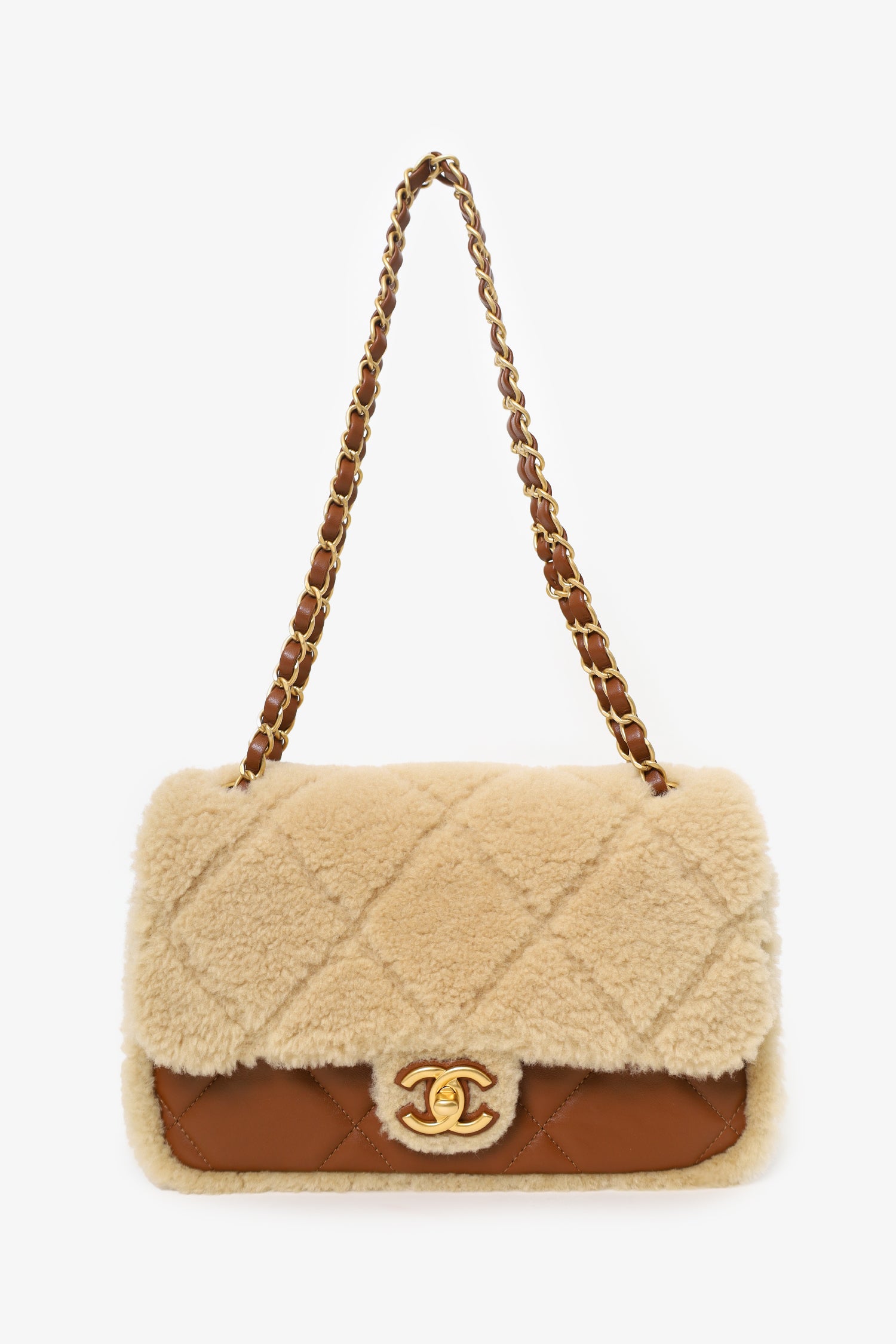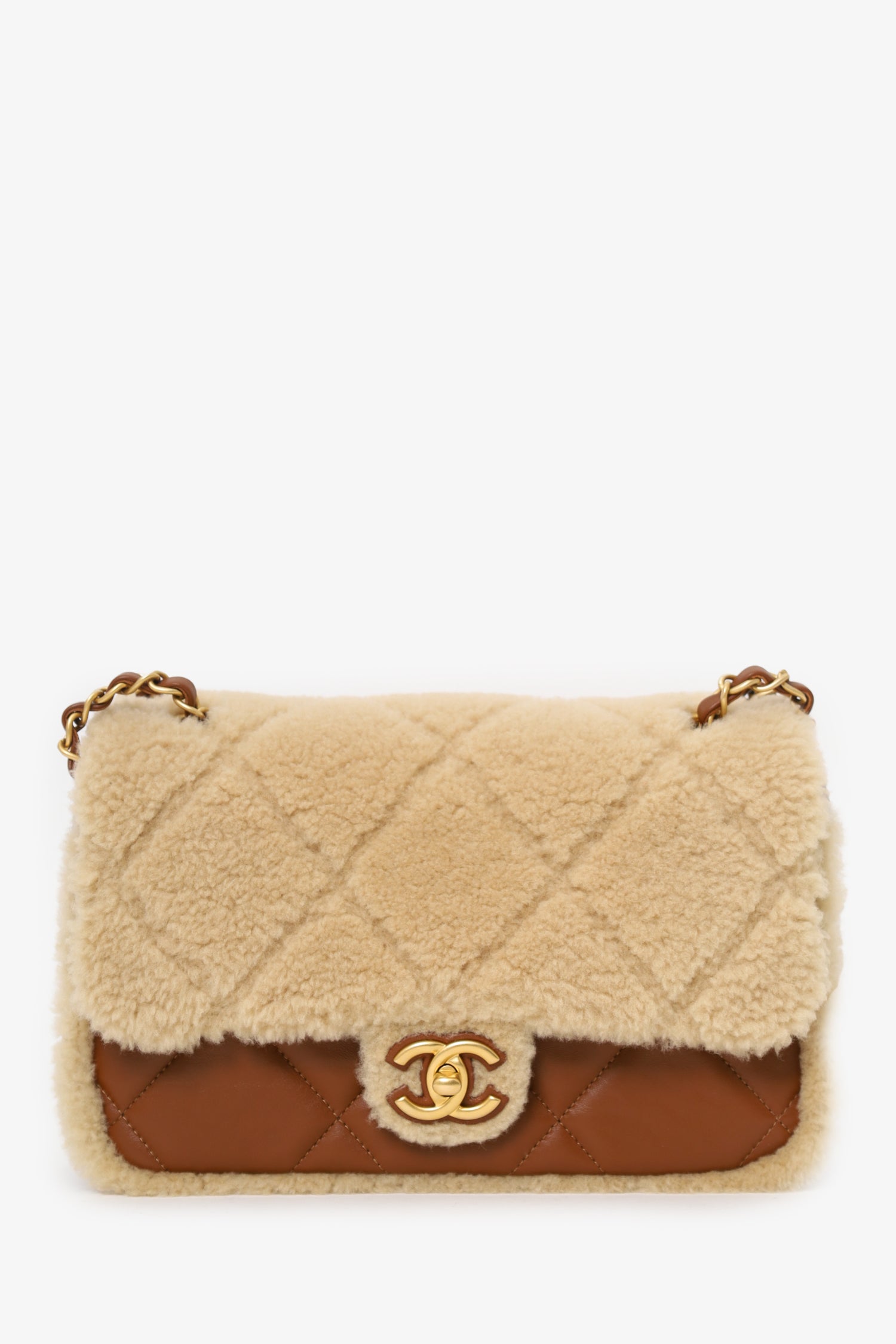 Refresh availabilityPre-Loved Chanel™ 24K Brown Lambskin Teddy Shearling Flap Bag. Front fold-over flap with turn-lock closure. Twin chainlink shoulder straps that can be pulled into one strap. Quilted exterior. Leather-lined interior. Single interior zip pocket. Gold-tone hardware. Tonal stitching.