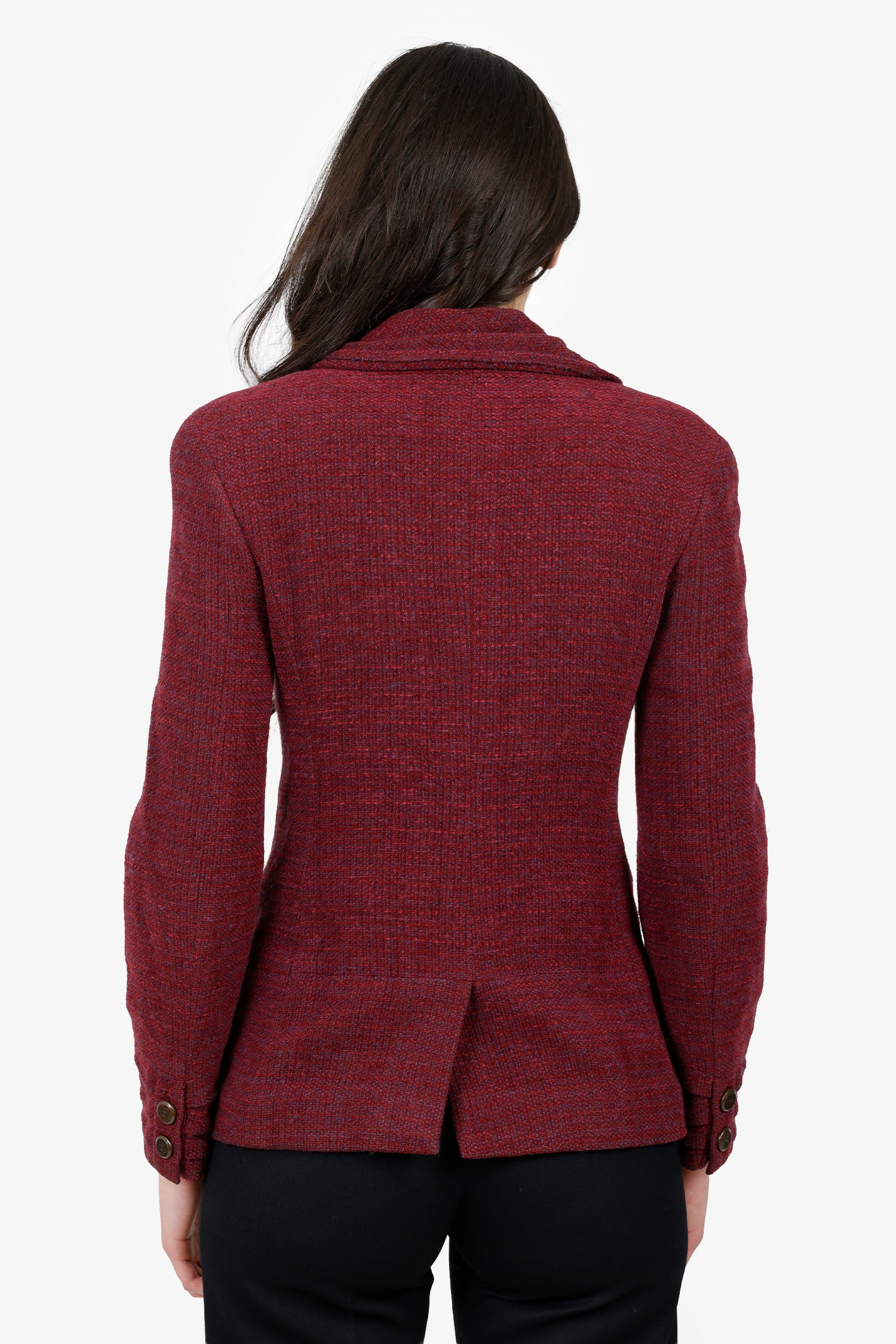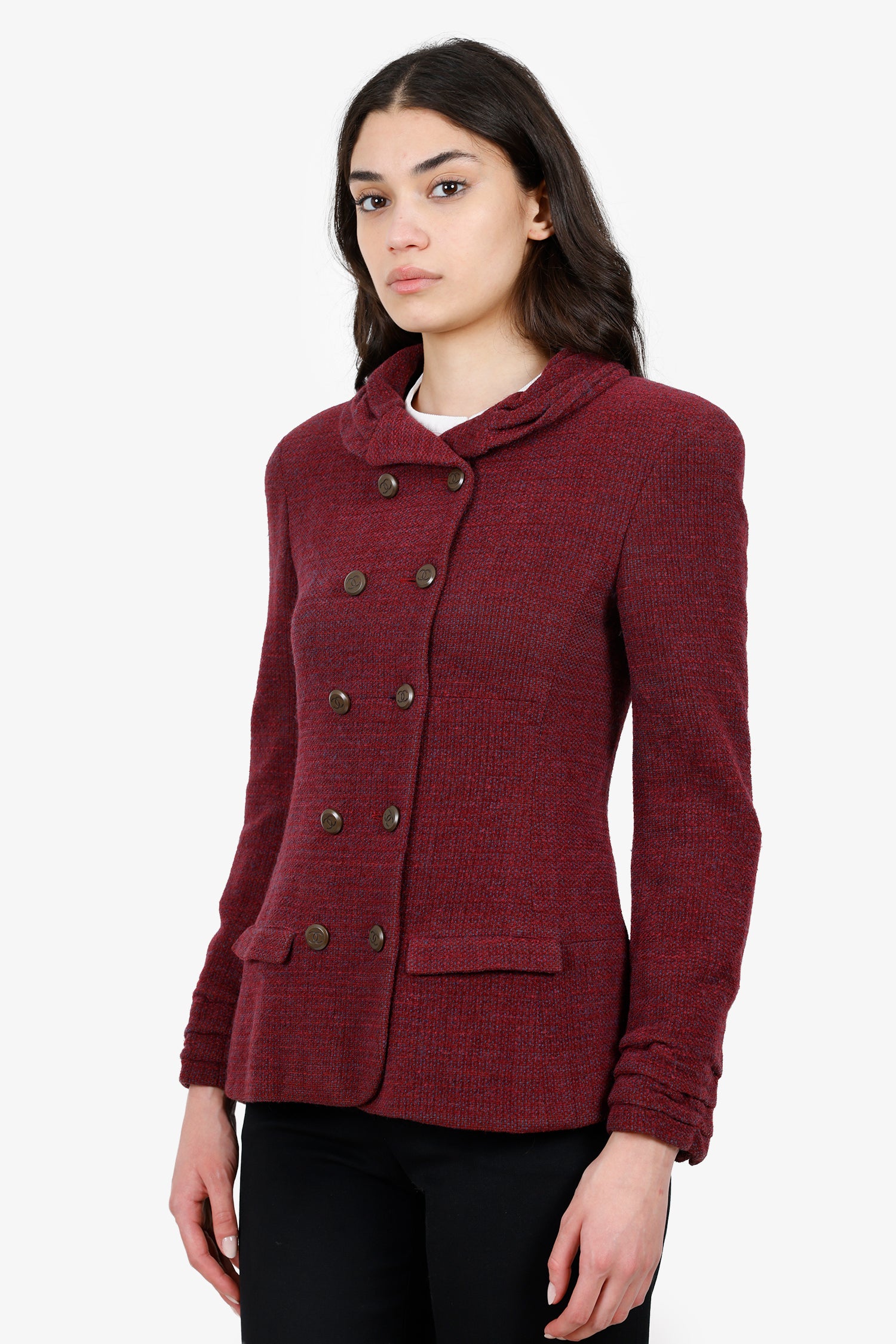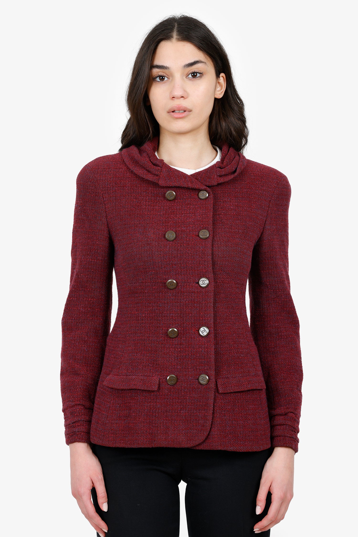 Refresh availabilityPre-Loved Chanel™ 98A Burgundy Wool CC Button Double Breasted Jacket. Collared neckline. Front button-up closure. Sleeve cuffs with button-up closure. 2 side pockets with front fold-over flap Single rear vent. Lined interior. Padded shoulders. Brass-tone hardware. Tonal stitching.