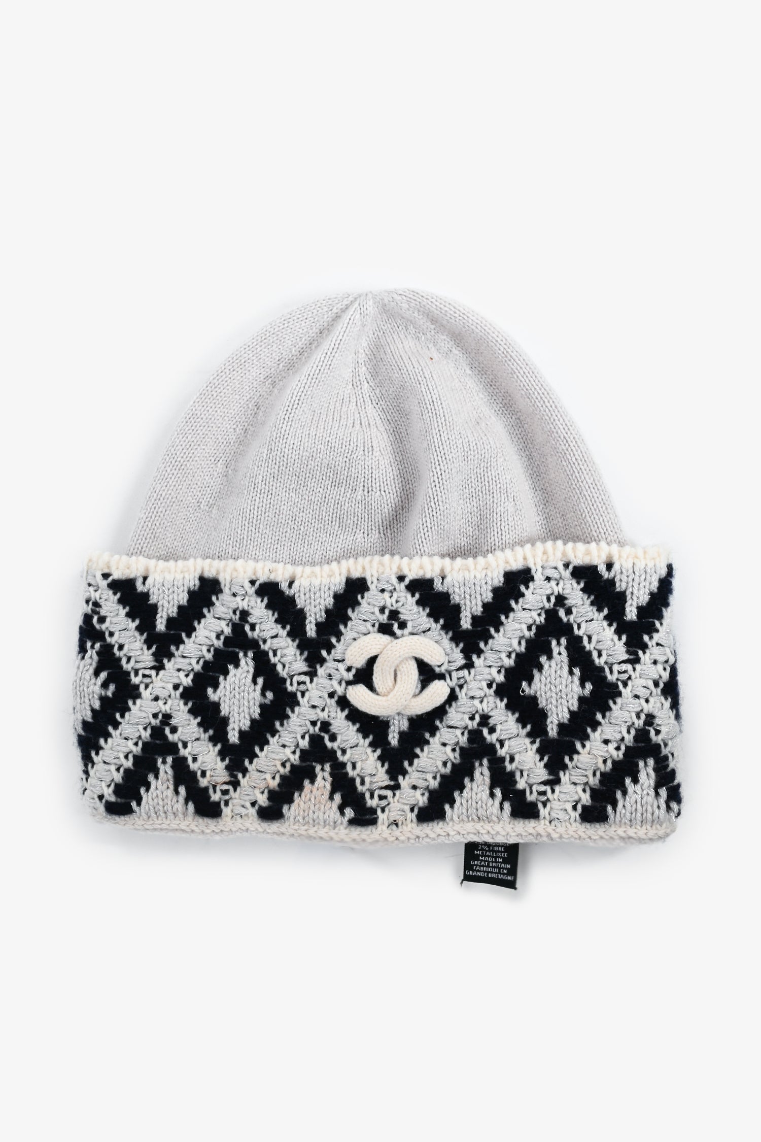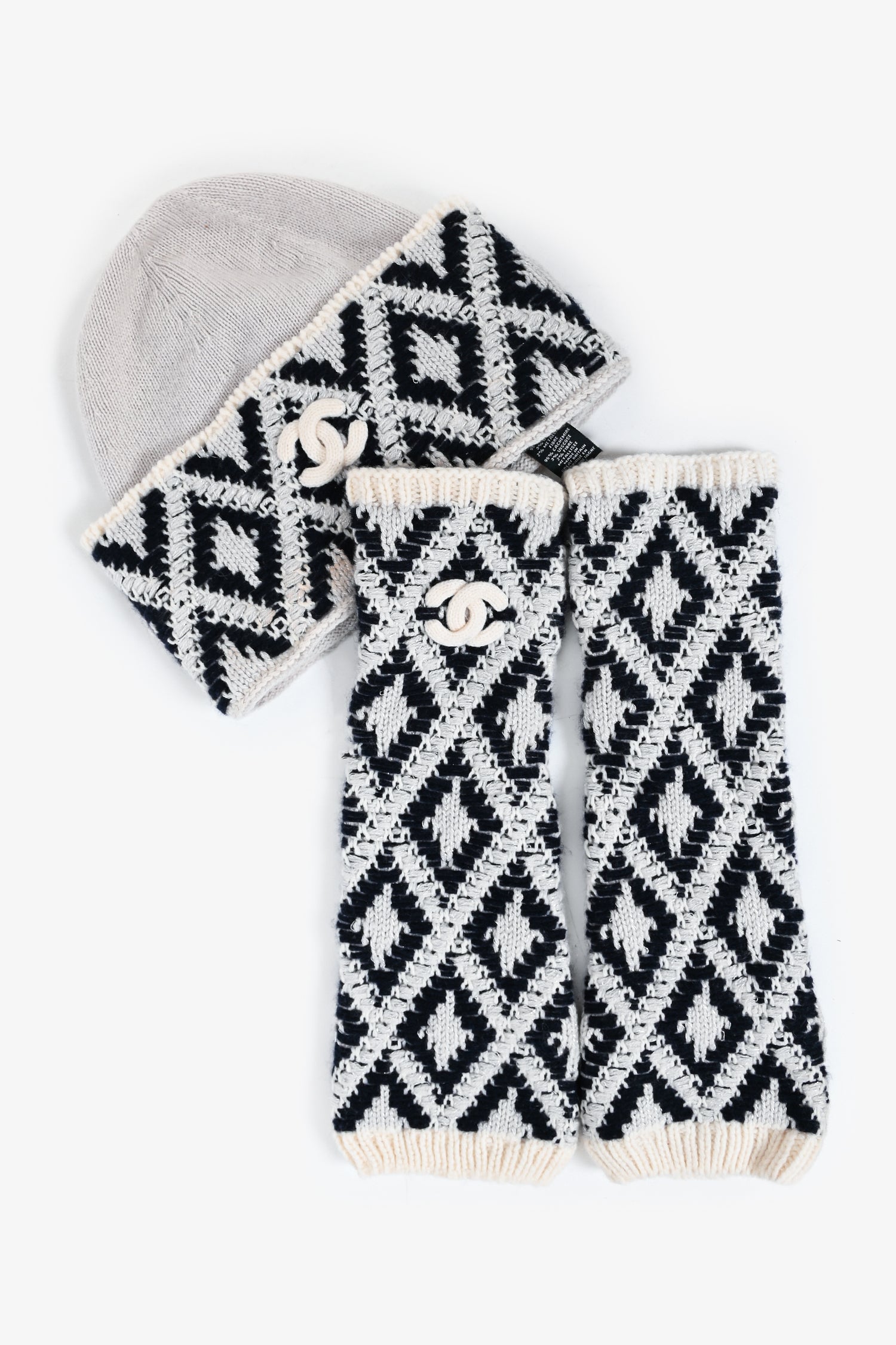Pre-Loved Chanel™ Grey/Navy Blue Cashmere Blend Knit Beanie + Fingerless Gloves Set