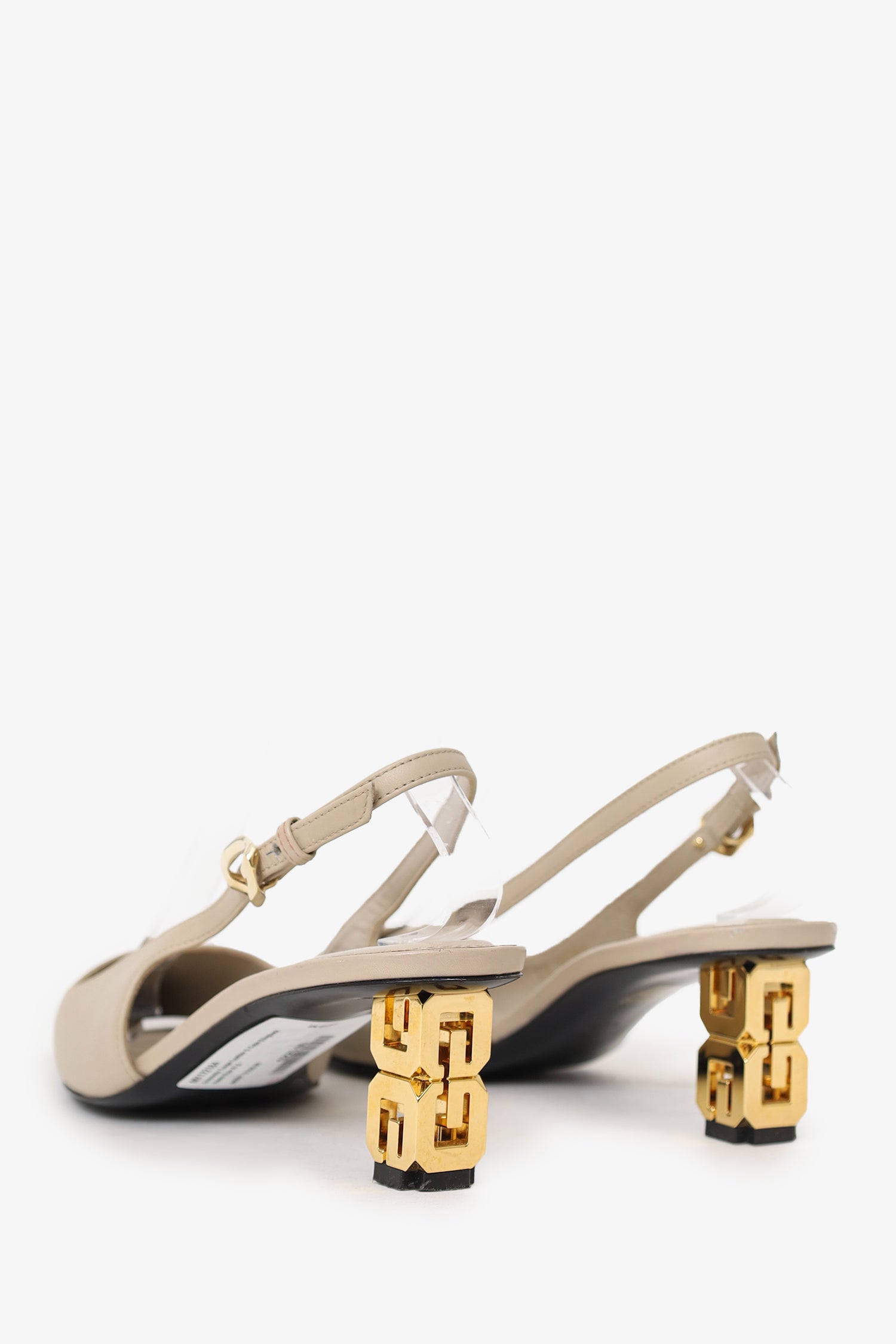 Refresh availabilityGivenchy Taupe Leather G Cube Slingback Heels. Slip-on. Pointed squared-toe. Slingback with adjustable buckle closure. Geometric hell. Gold-tone hardware. Tonal stitching.