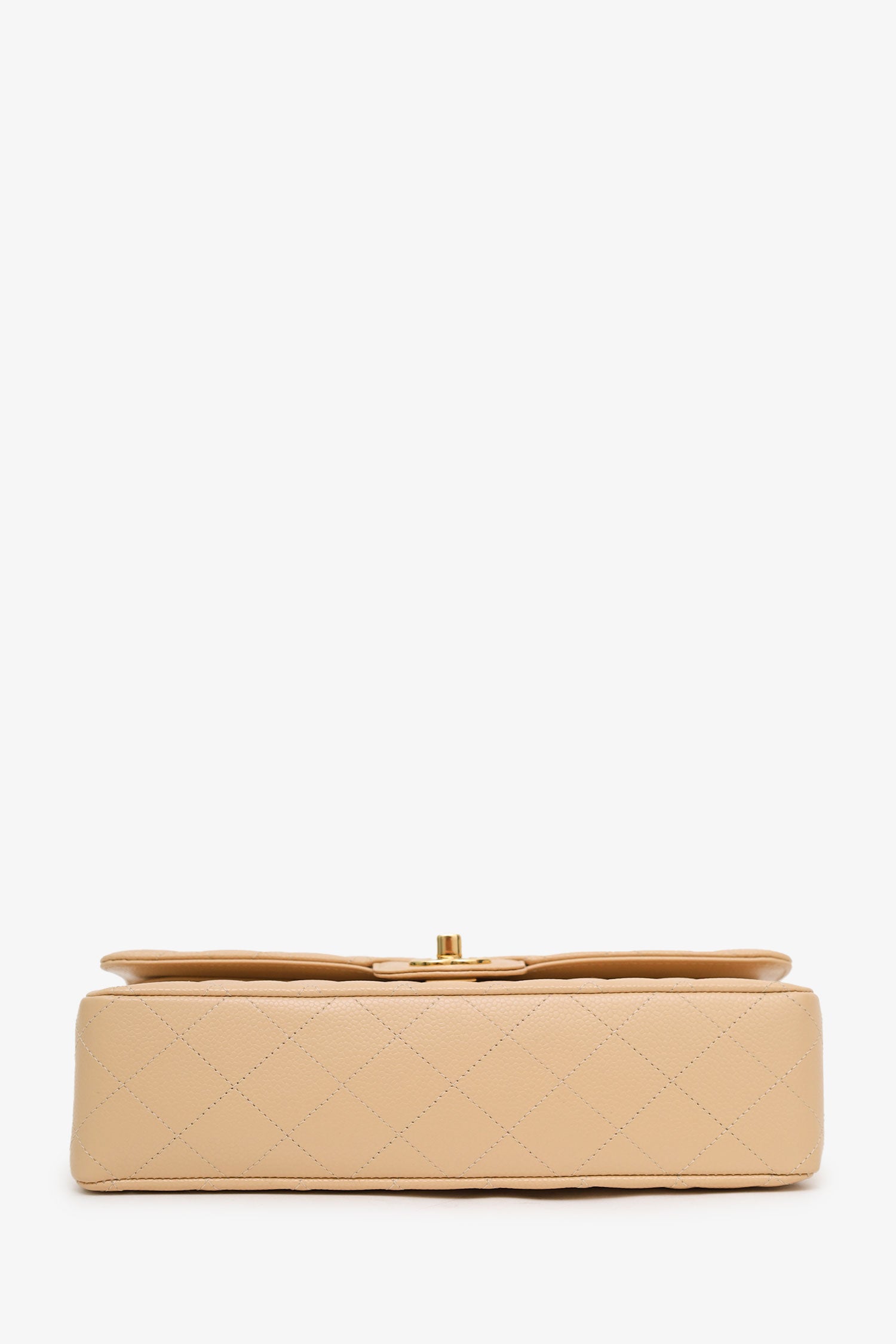 Refresh availabilityPre-Loved Chanel™ Beige Caviar Medium Classic Double Flap Bag. Front fold-over flap with turn-lock closure. 2 front fold-over flaps; outer flap with turn-lock closure, inner flap with snap button closure. Twin chain link shoulder straps. Single rear exterior slip pocket. Leather-lined interior. 2 interior compartments; front compartment with 1 large open pocket. 2 interior slip pockets with single lipstick compartment. Rear compartment has 1 zip pocket on underside of top fold-over flap. Gold-tone hardware. Tonal stitching.